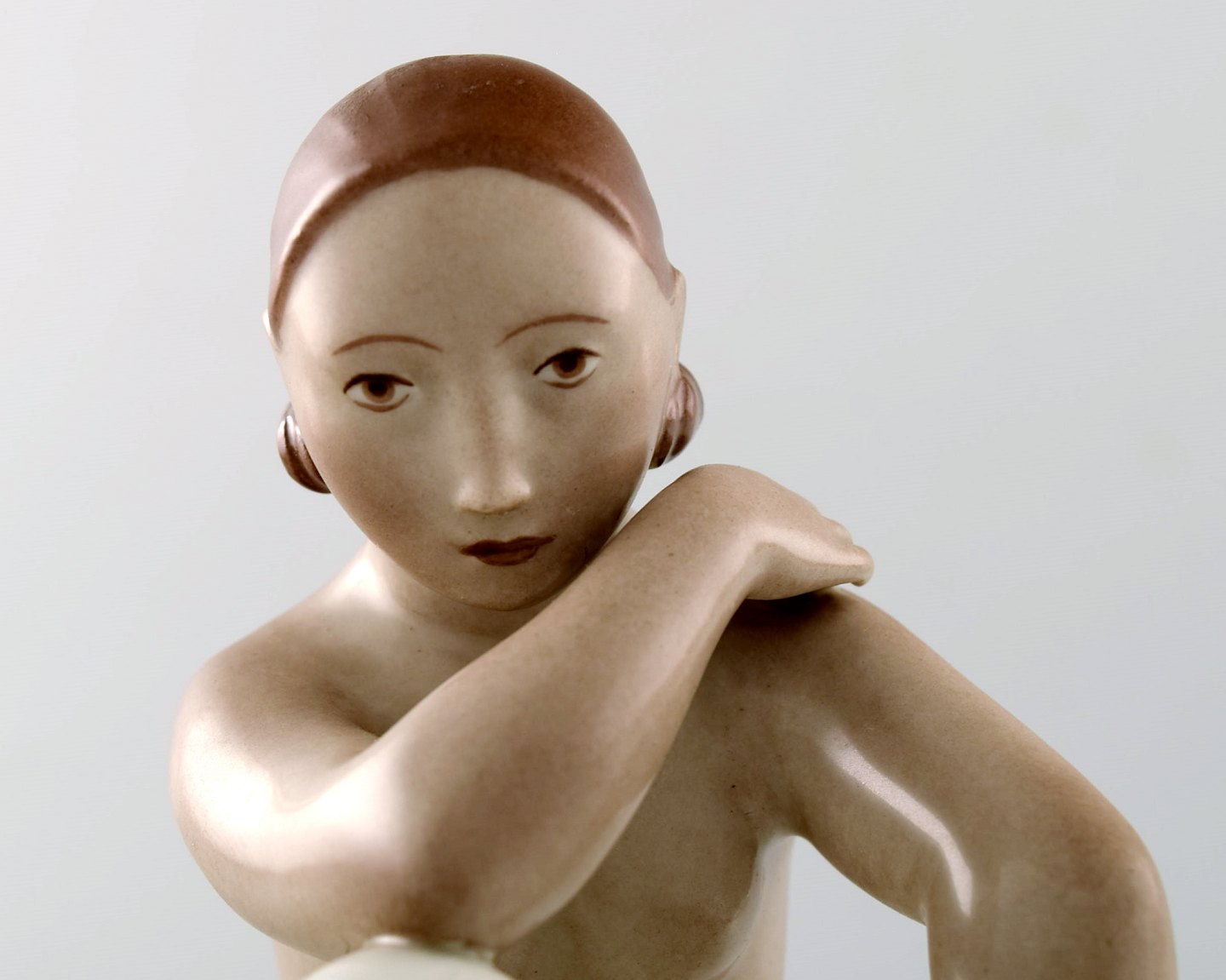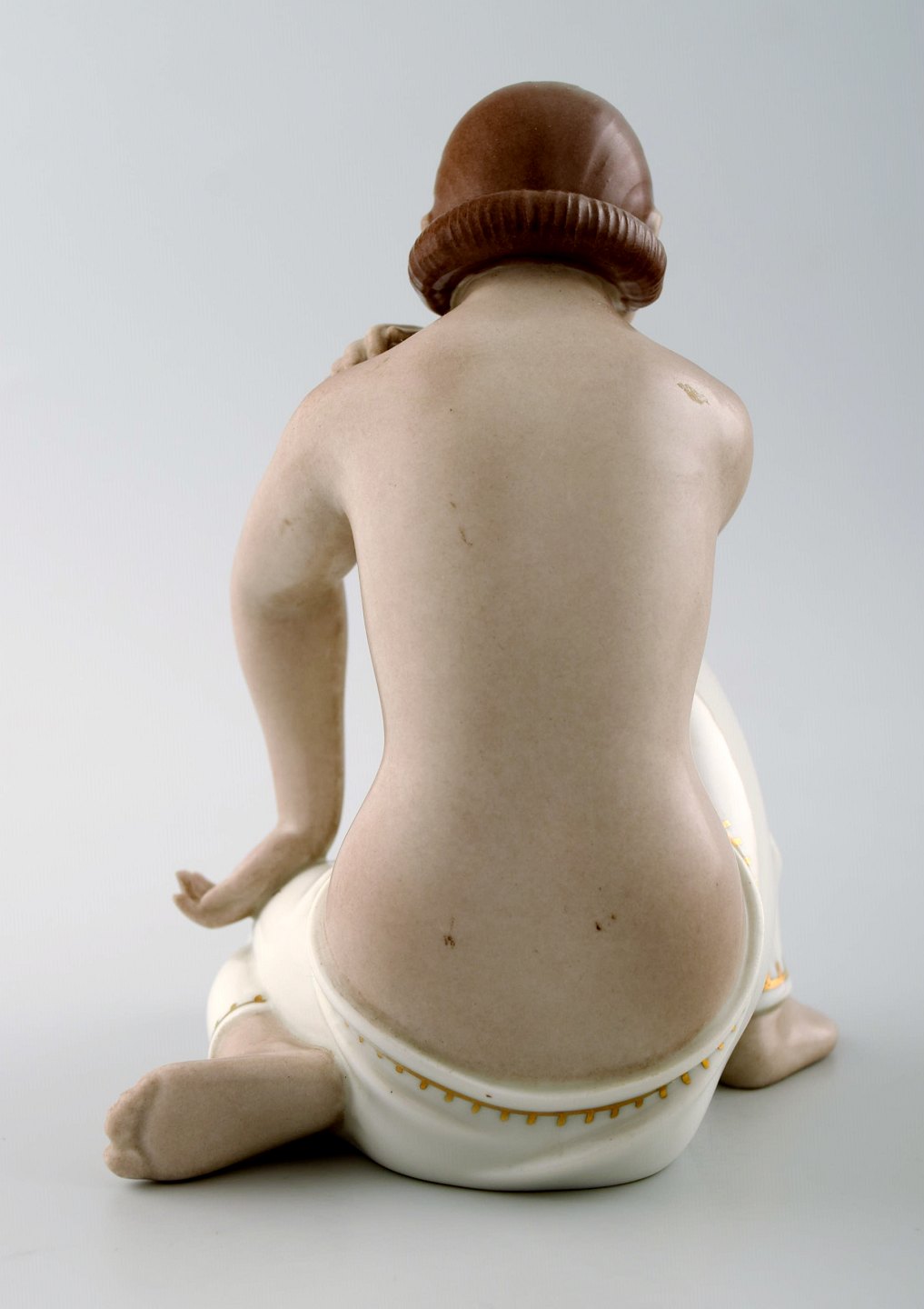 Sjælden Arno Malinowski for Royal Copenhagen. Siddende halvnøgen kvinde med art deco frisure. Overglasur. Nummer 12480. Juliane Marie stempel. Højde 13 cm. 1. sortering. I perfekt stand.
