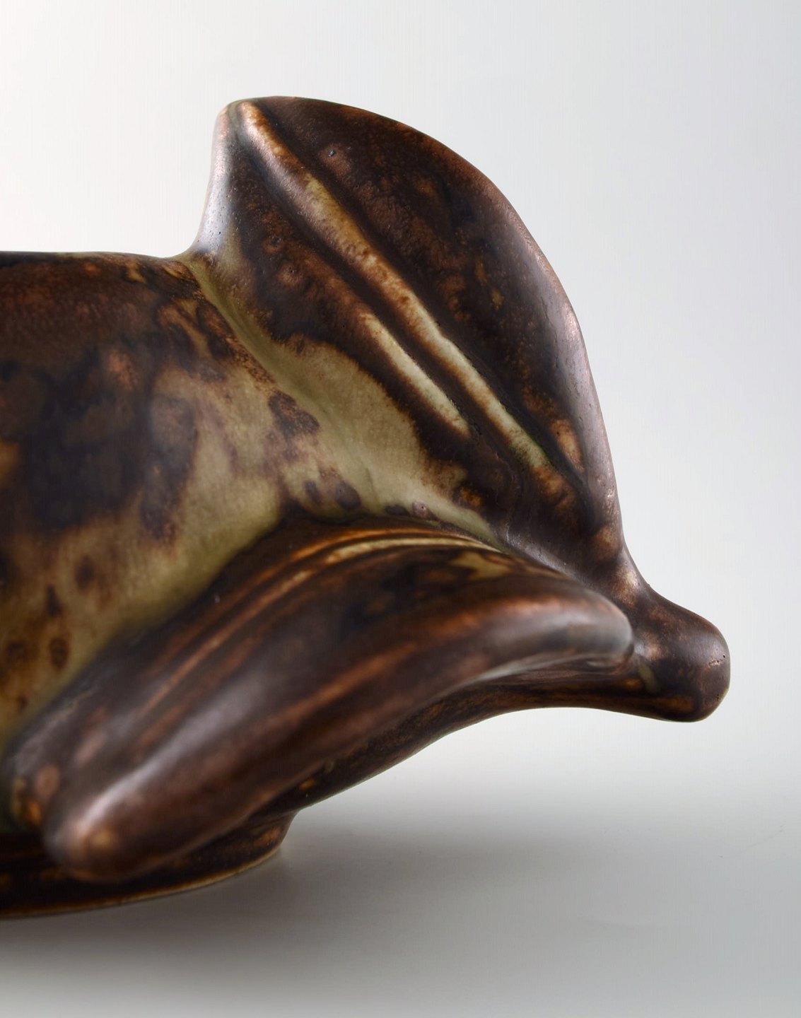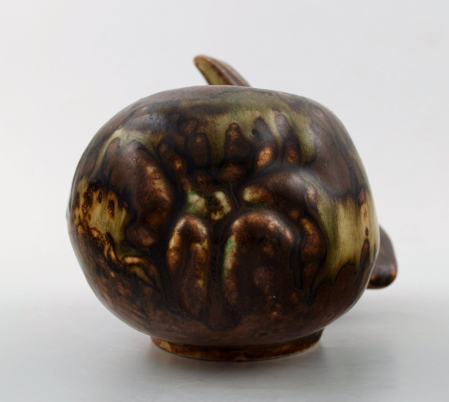 Axel Salto: Small fruit-shaped stoneware bowl, decorated with sung glaze. Signed Salto, 20676, Royal Copenhagen. Height. 11 cm. Length 19.5 cm. In perfect condition, 1st. factory quality.