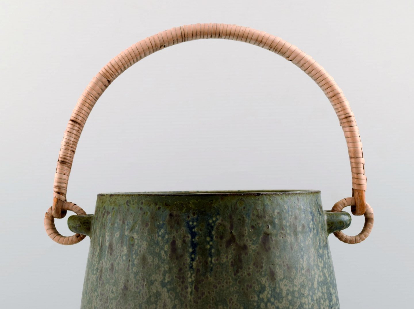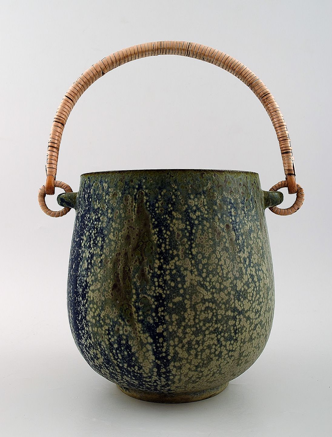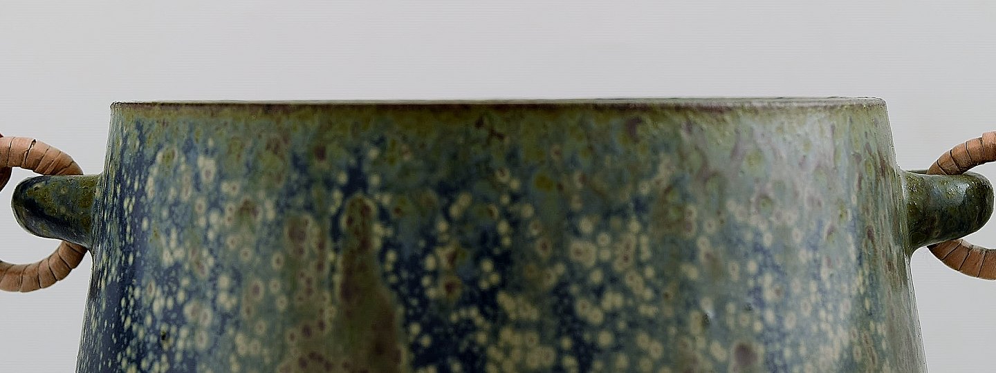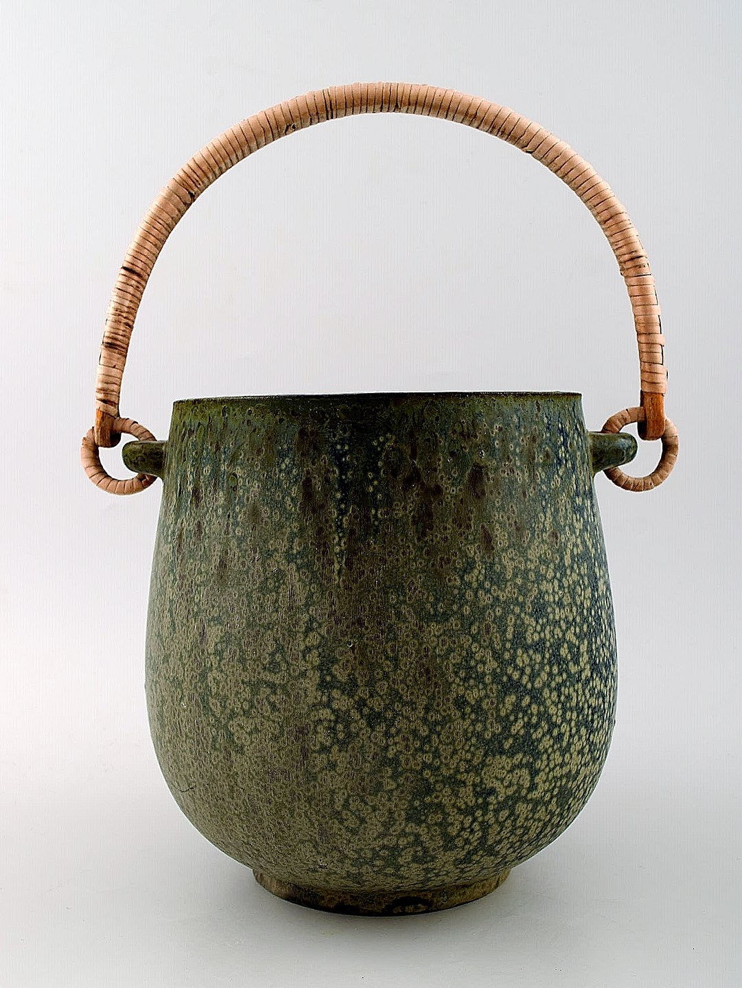 Arne Bang keramik isspand. Stemplet AB. Glasur i blågrønne nuancer. I perfekt stand. Måler: 24 x 21 cm. inkl. hank.