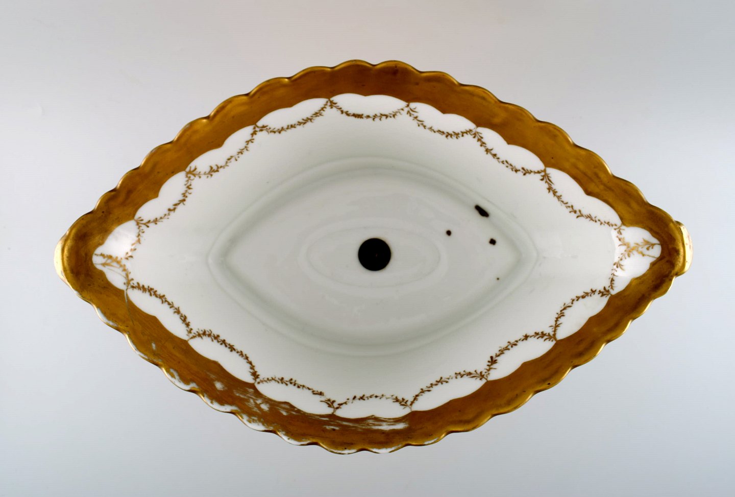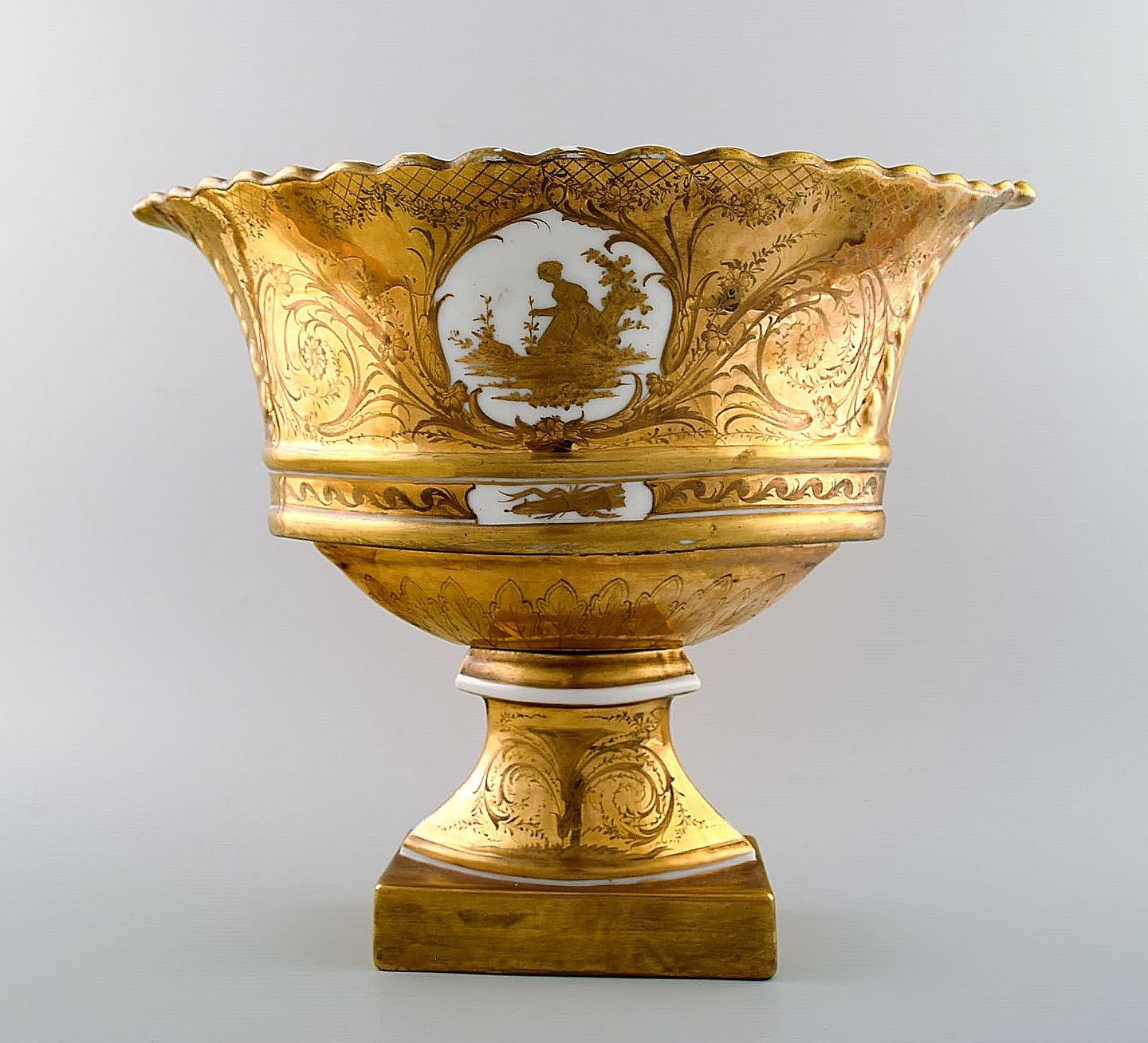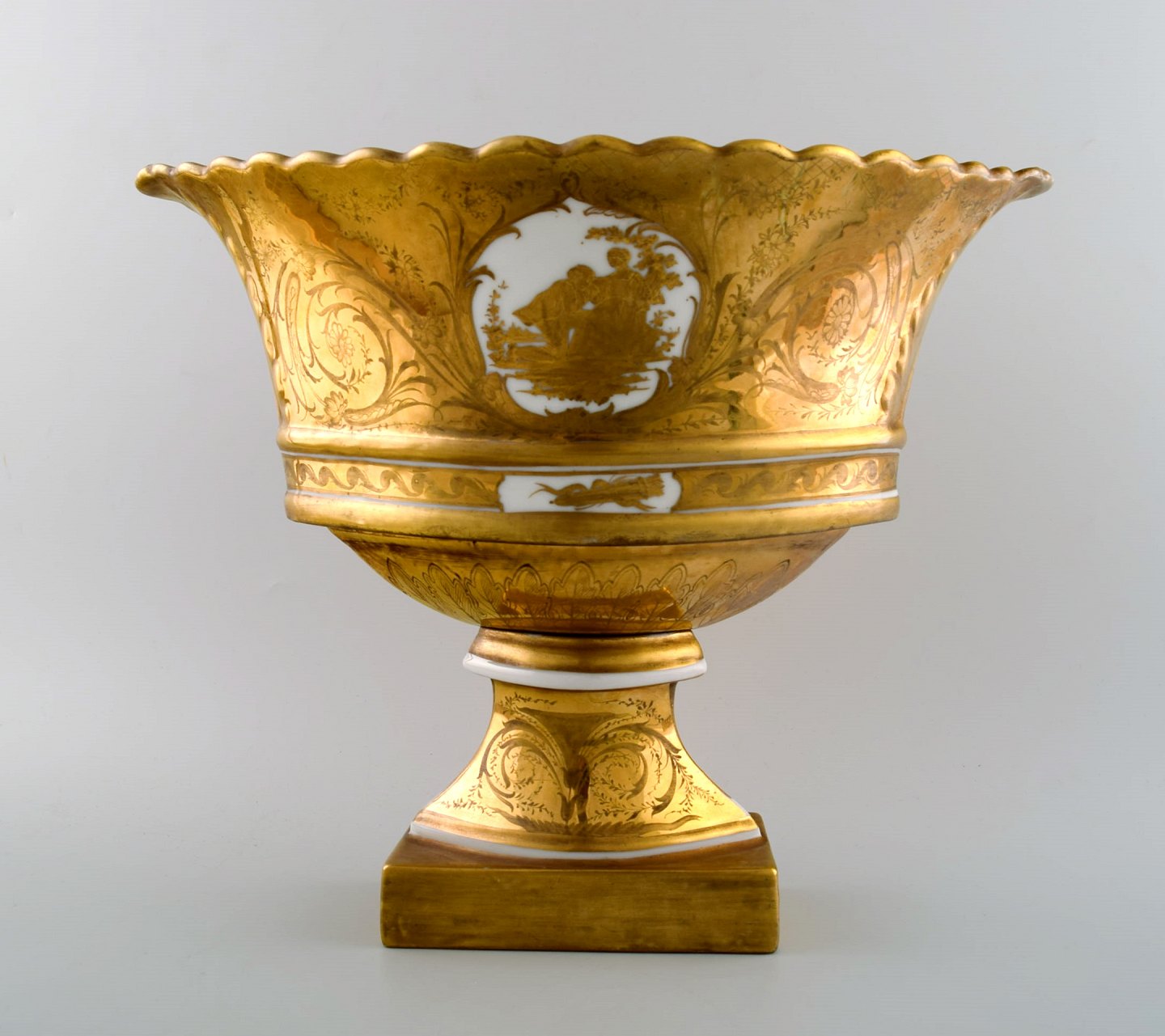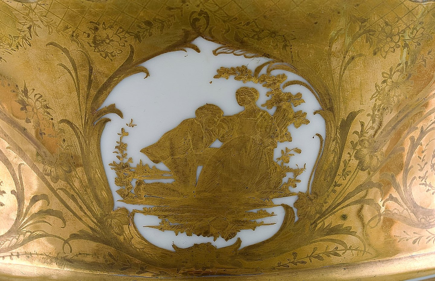 Antik fransk stor opsats i Sevres/Paris stil, guldbelagt med klassicistisk motiv. Måler : 35 cm. x 28,5 cm. Ustemplet. I god stand.