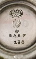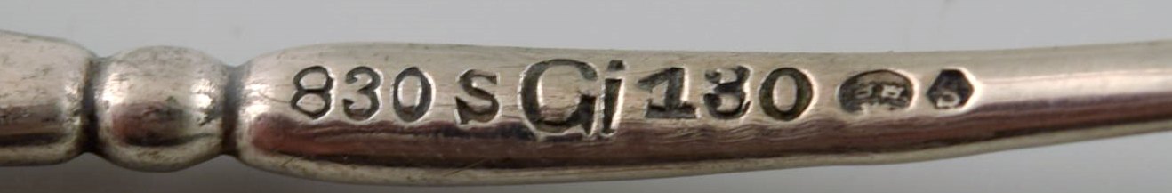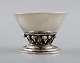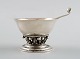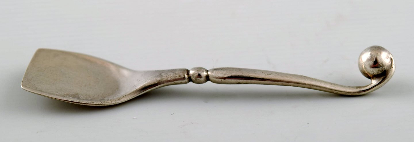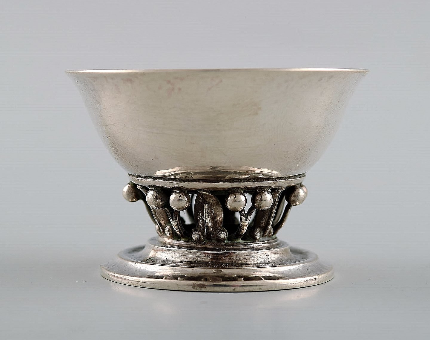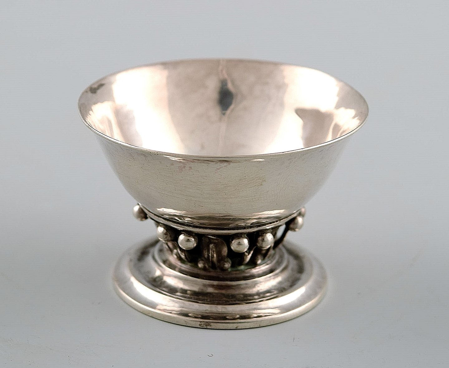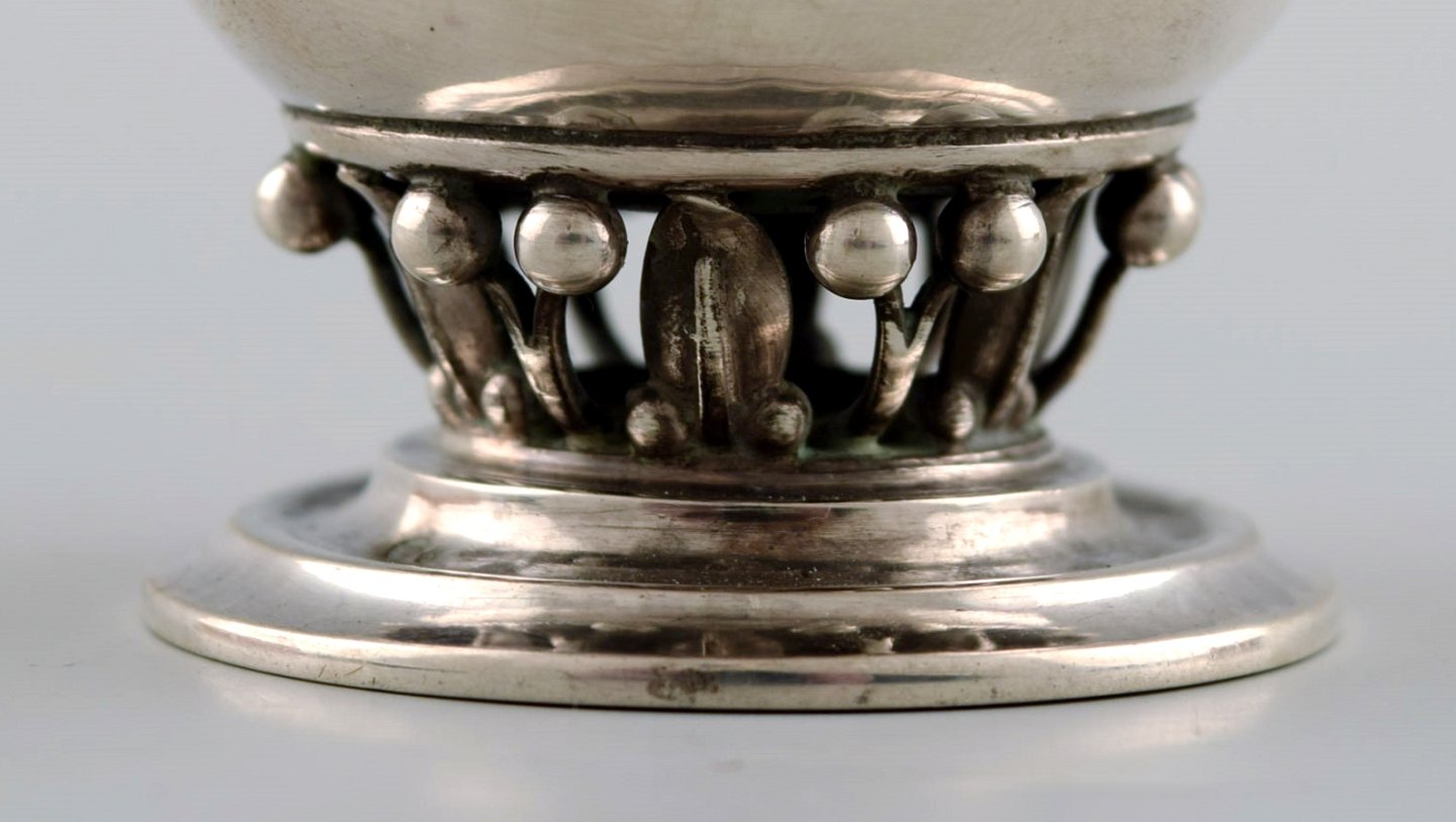 Georg Jensen: To saltkar med tilhørende saltskeer. Saltkar: Højde. 3,5 cm. Diameter 5,2 cm. Saltskeer: Længde 6 cm. Svenske importstempler. Dessin 180. 1915-1927. I flot stand.