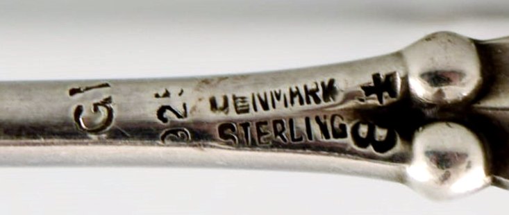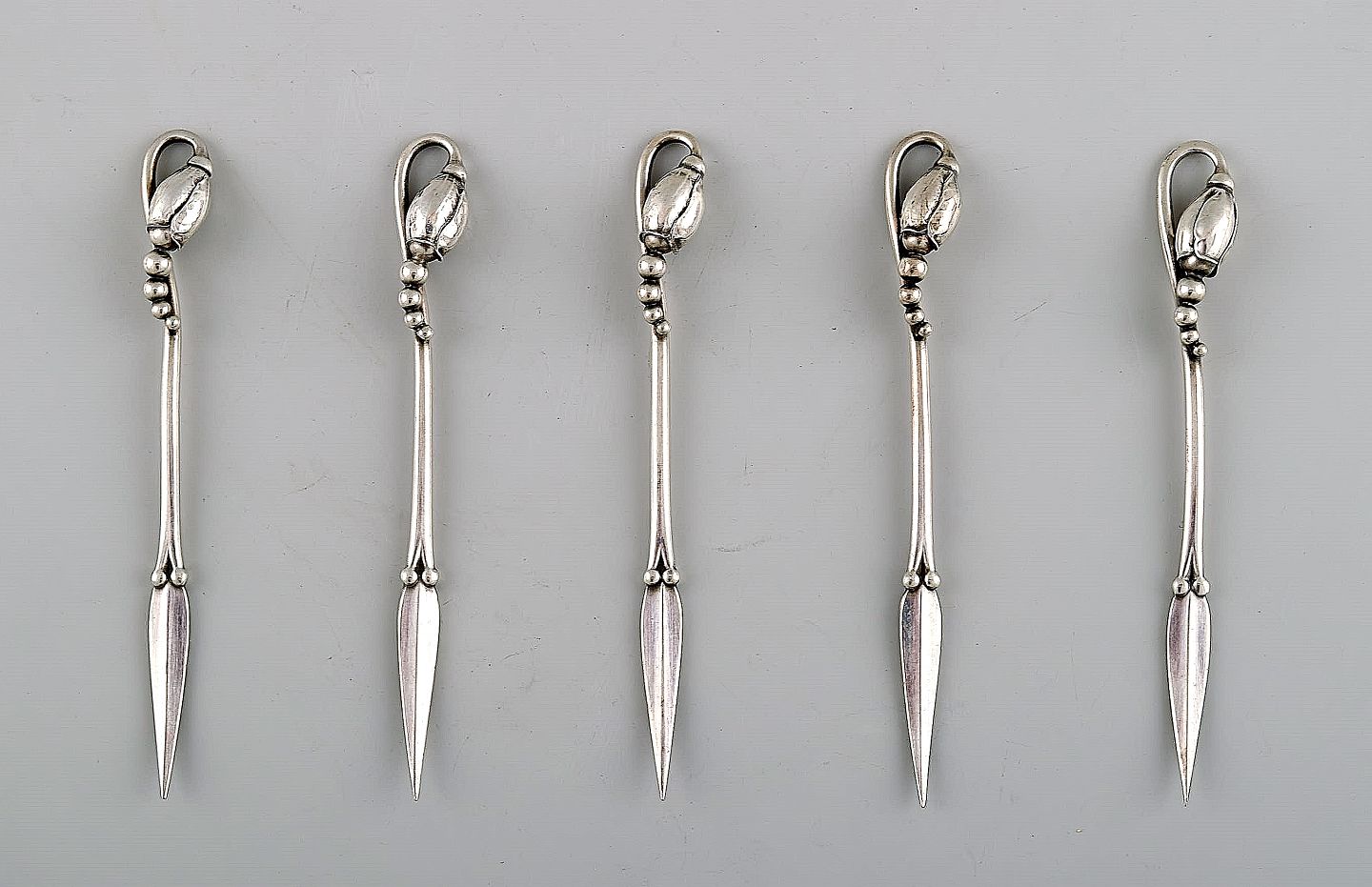 Georg Jensen fem nøddespyd / cocktailspyd af sterlingsølv, 'Magnolia', 1915-1930.