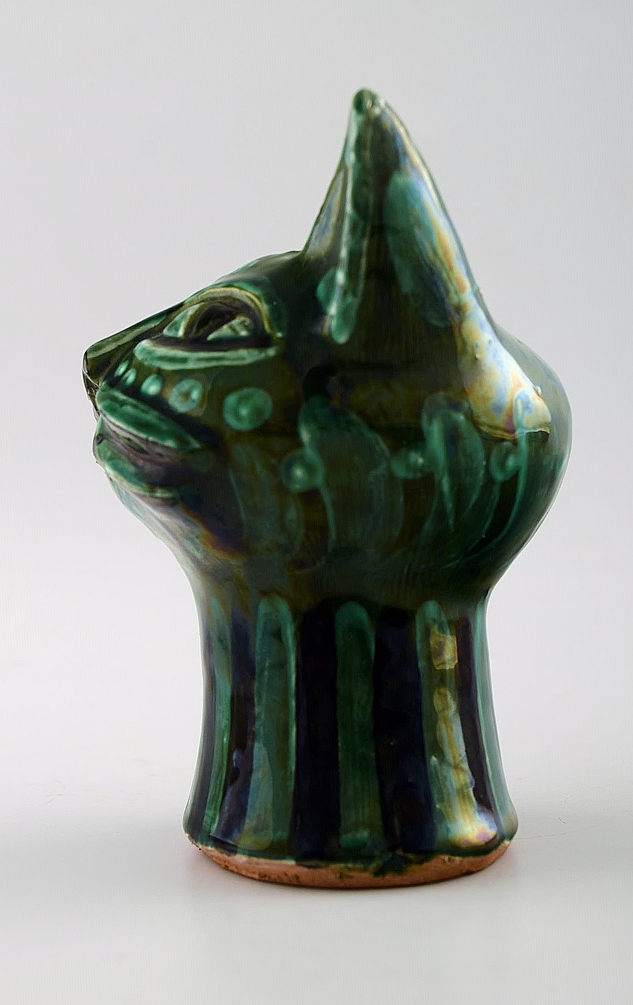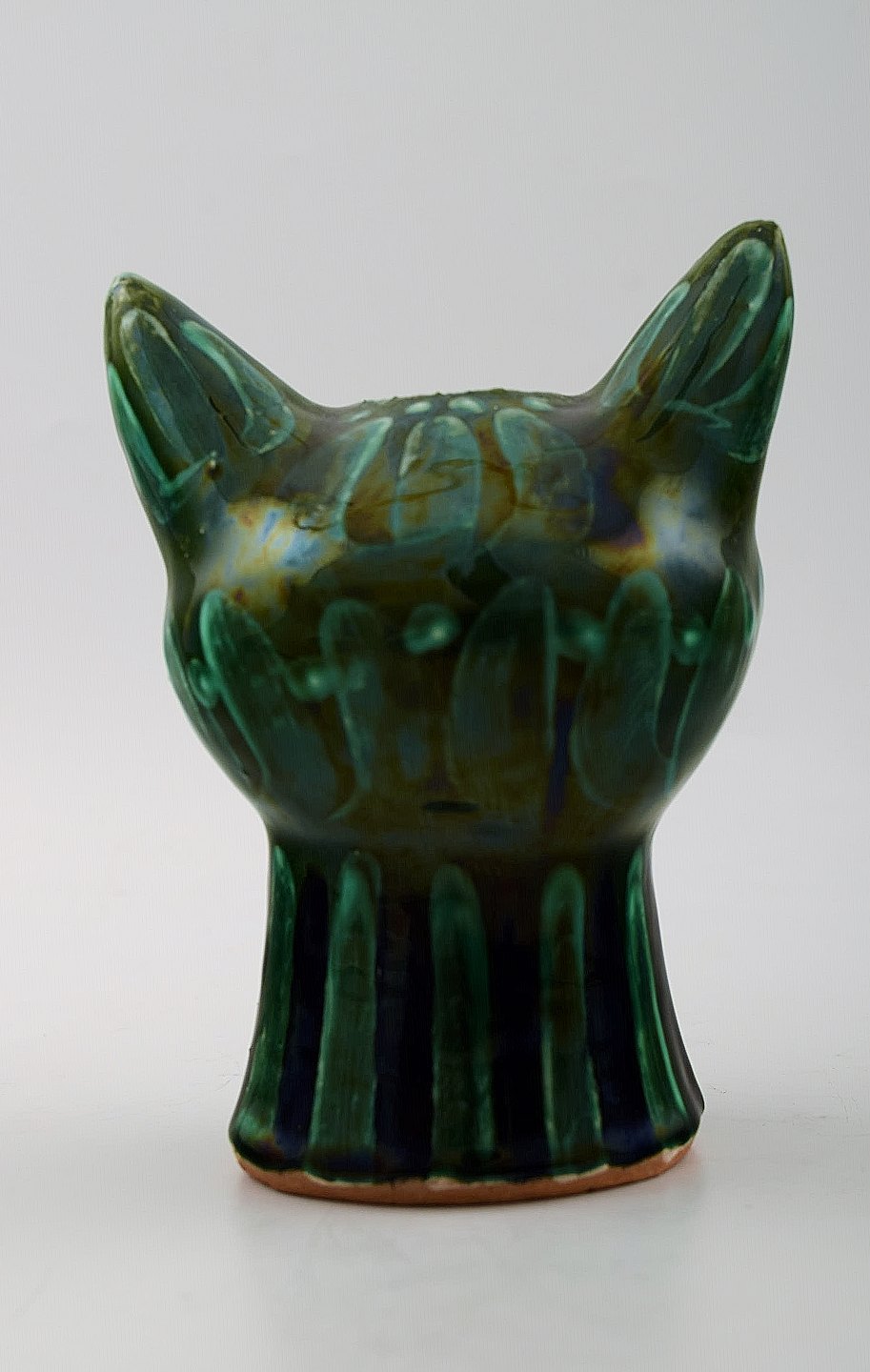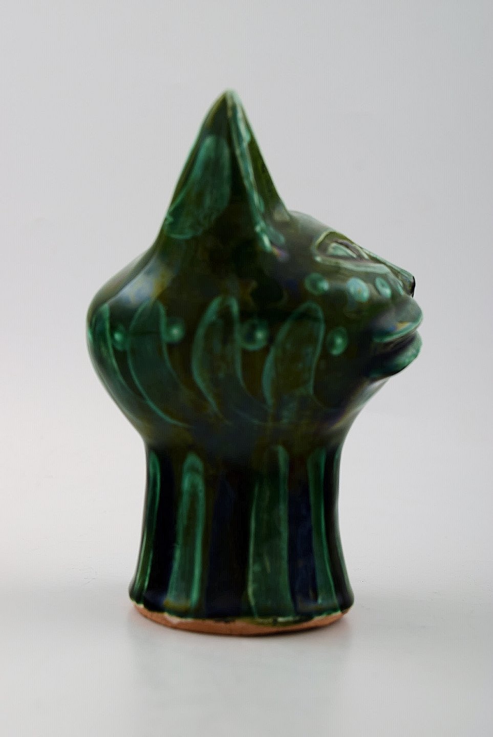 Helge Christoffersen unika figur af kattehoved. Skulptur i keramik af høj kvalitet, flot grøn glasur. Eget værksted. Måler 12 x 10 cm. I flot stand.