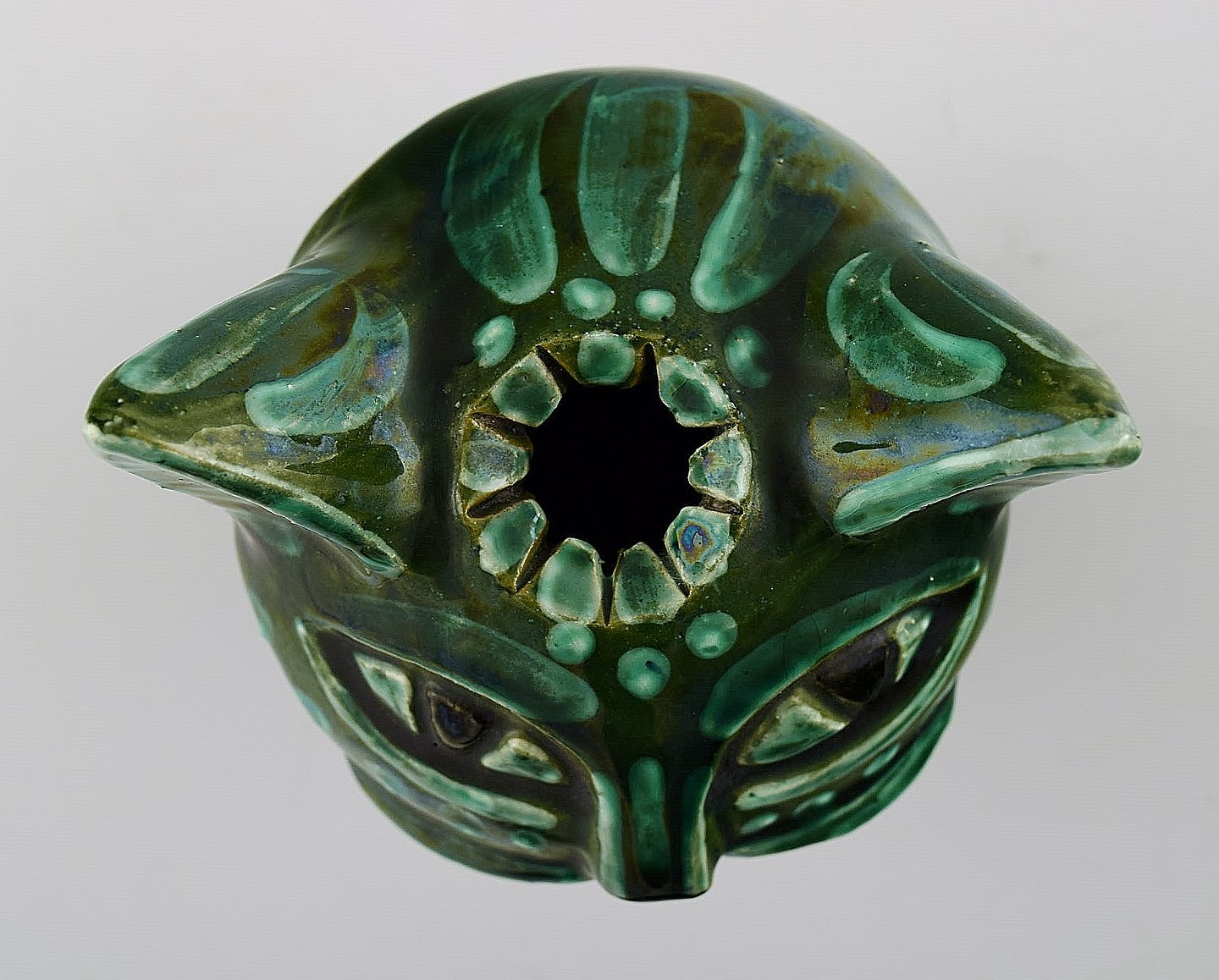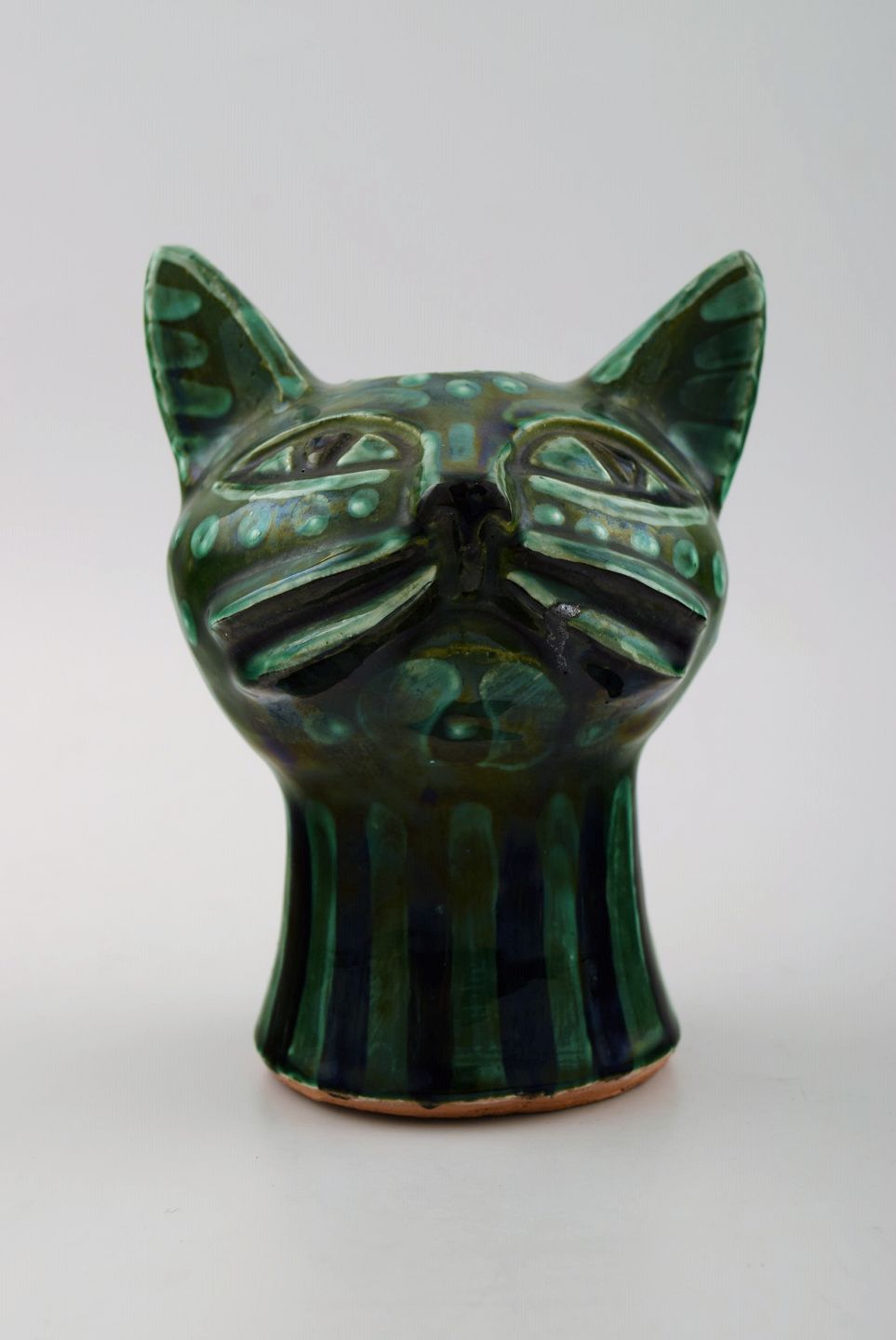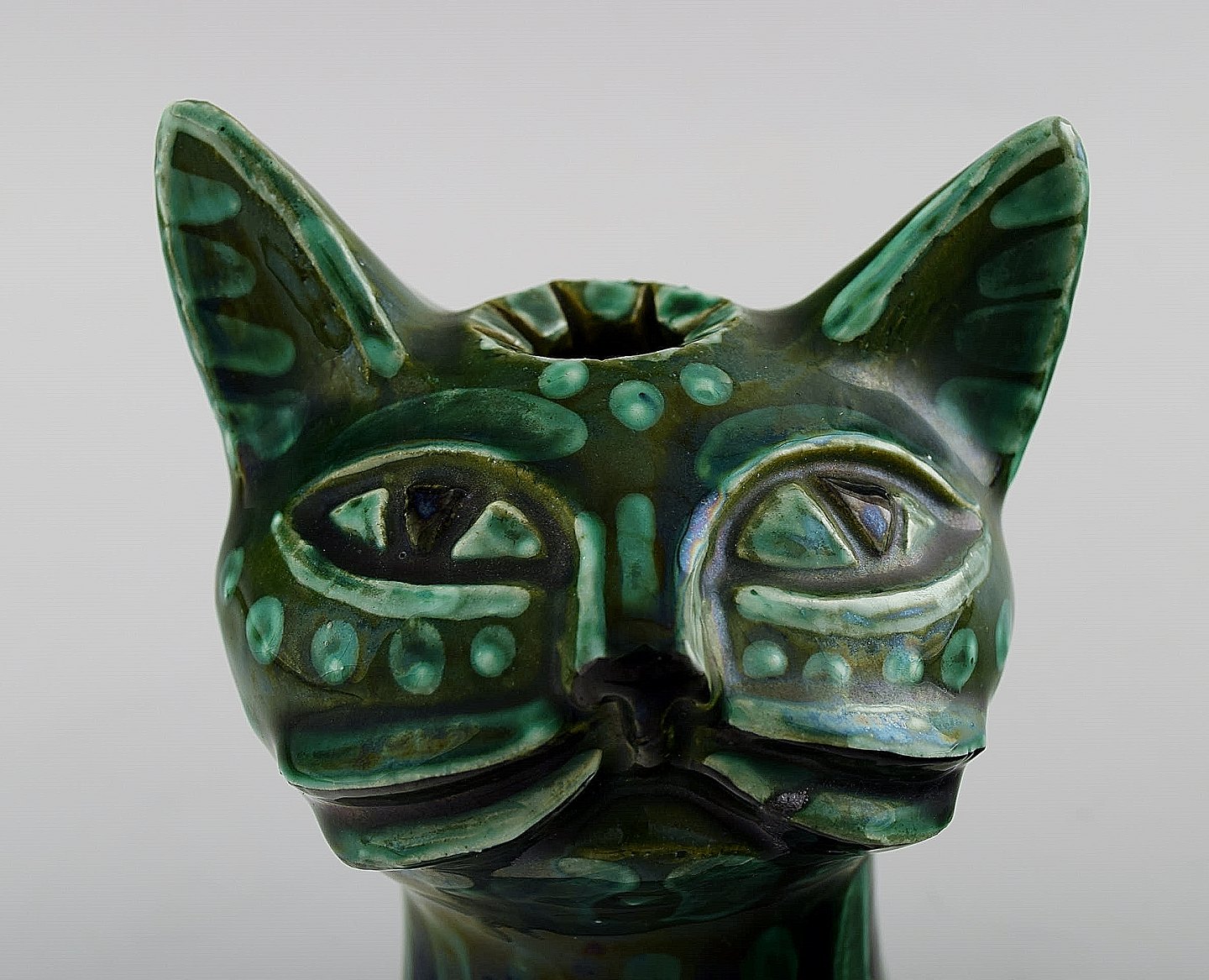 Helge Christoffersen unika figur af kattehoved. Skulptur i keramik af høj kvalitet, flot grøn glasur. Eget værksted. Måler 12 x 10 cm. I flot stand.