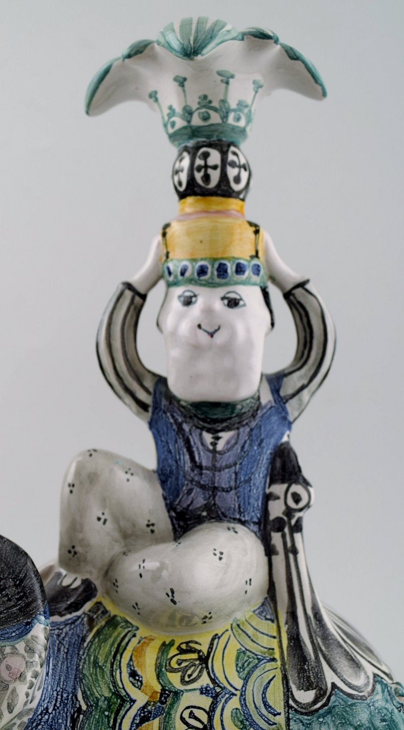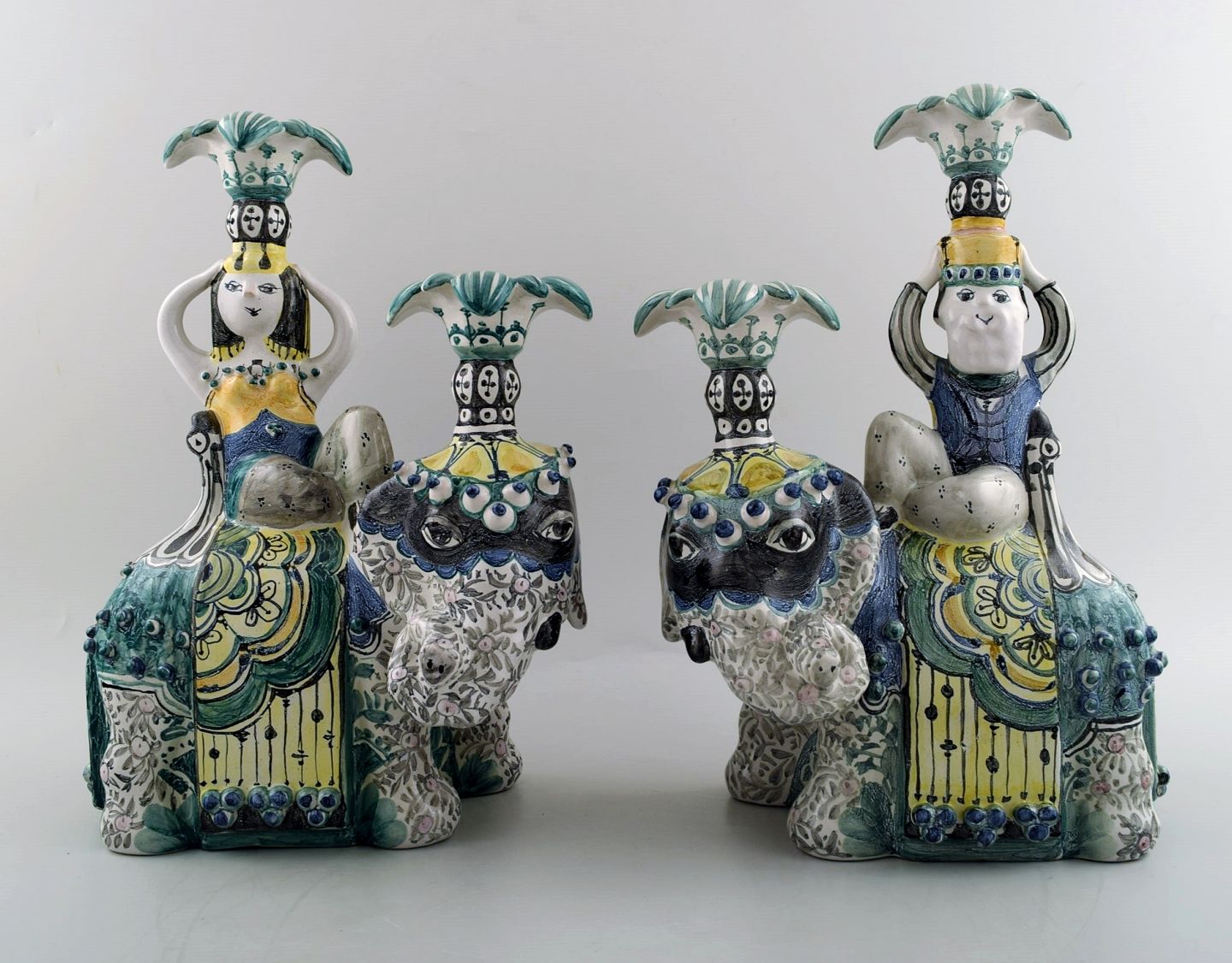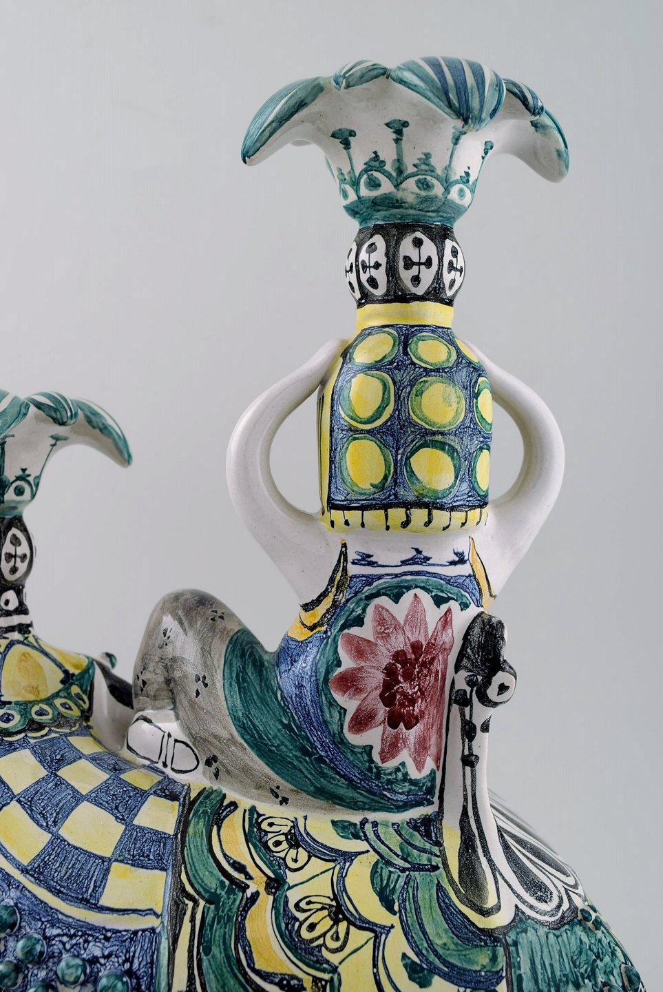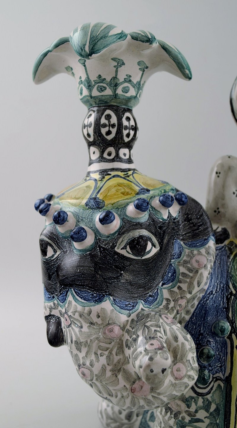 Bjørn Wiinblad, 1918-2006 : Unika Figurstager i form af Kong Salomon og Dronningen af Saba ridende på elefanter, af glaseret keramik.