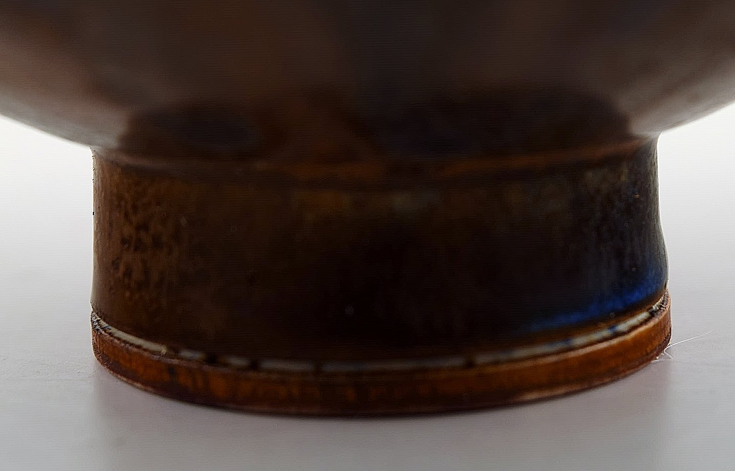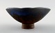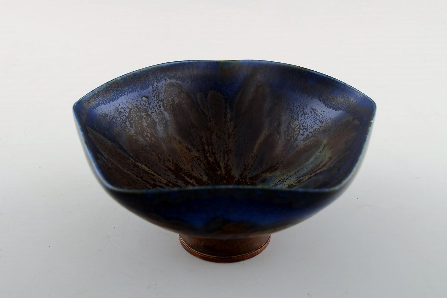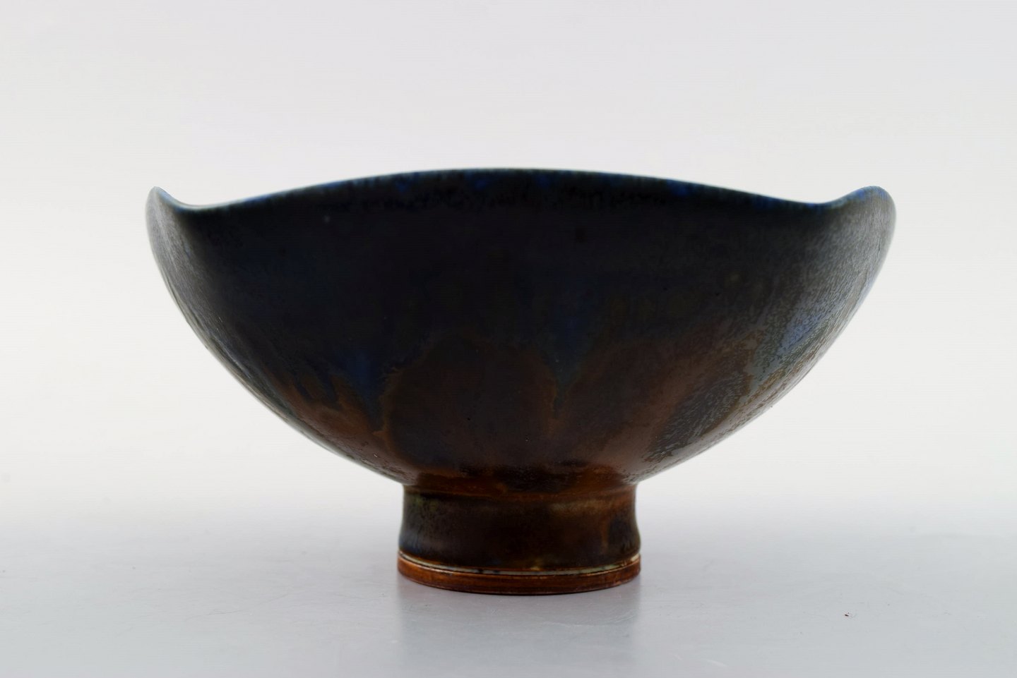 Berndt Friberg Studio hand ceramic bowl. Modern Swedish design. Unique, handmade. Early stamp 1940s. Fantastic glaze in blue / brown shades. Perfect. 1st. factory quality. Measures 14 x 7 cm.
