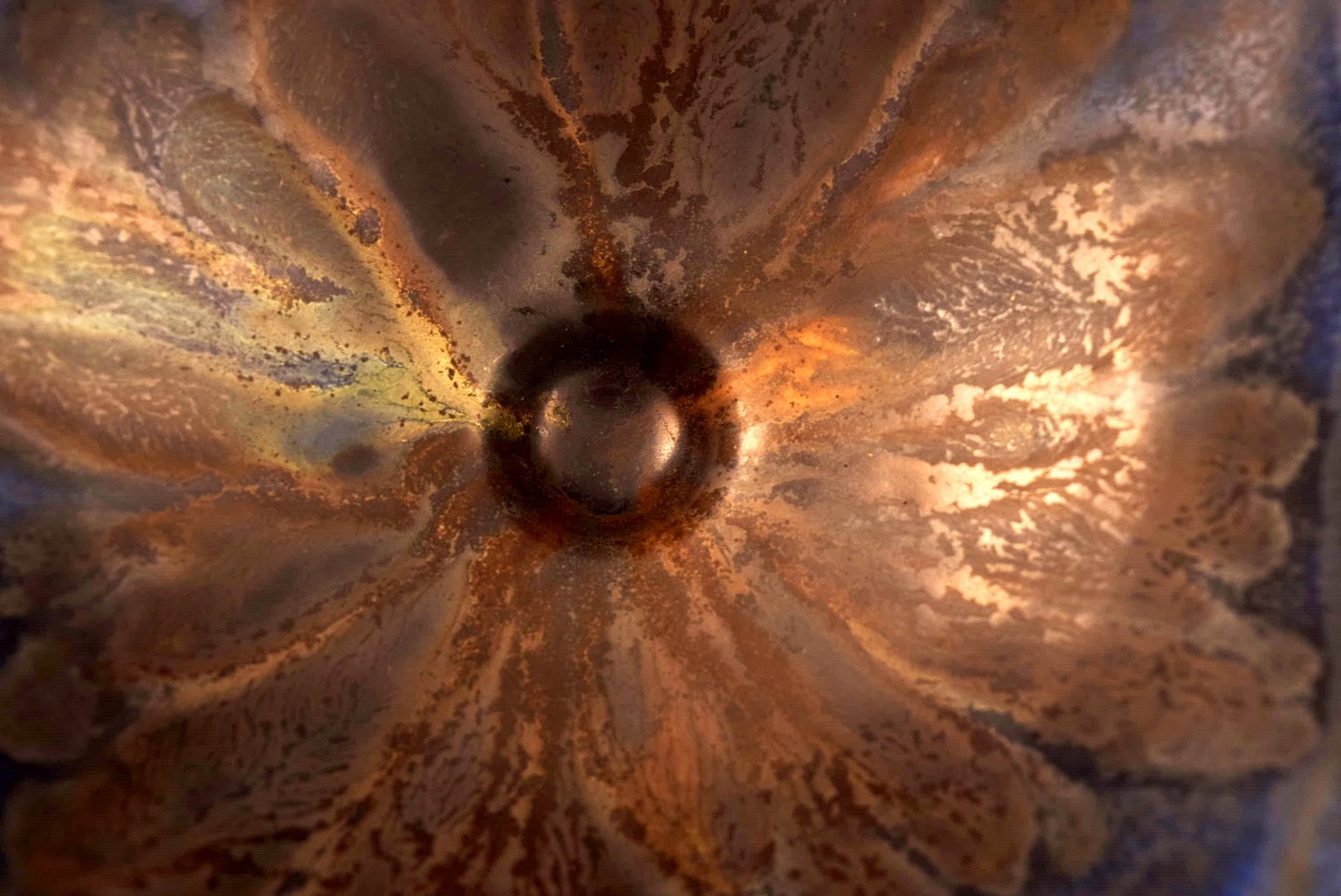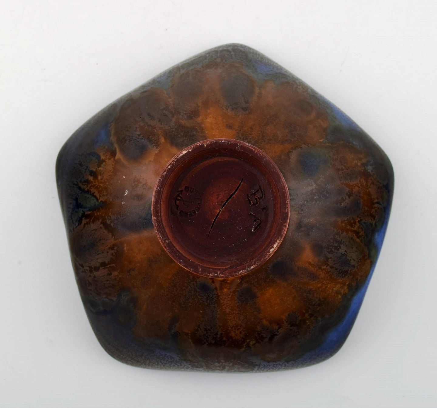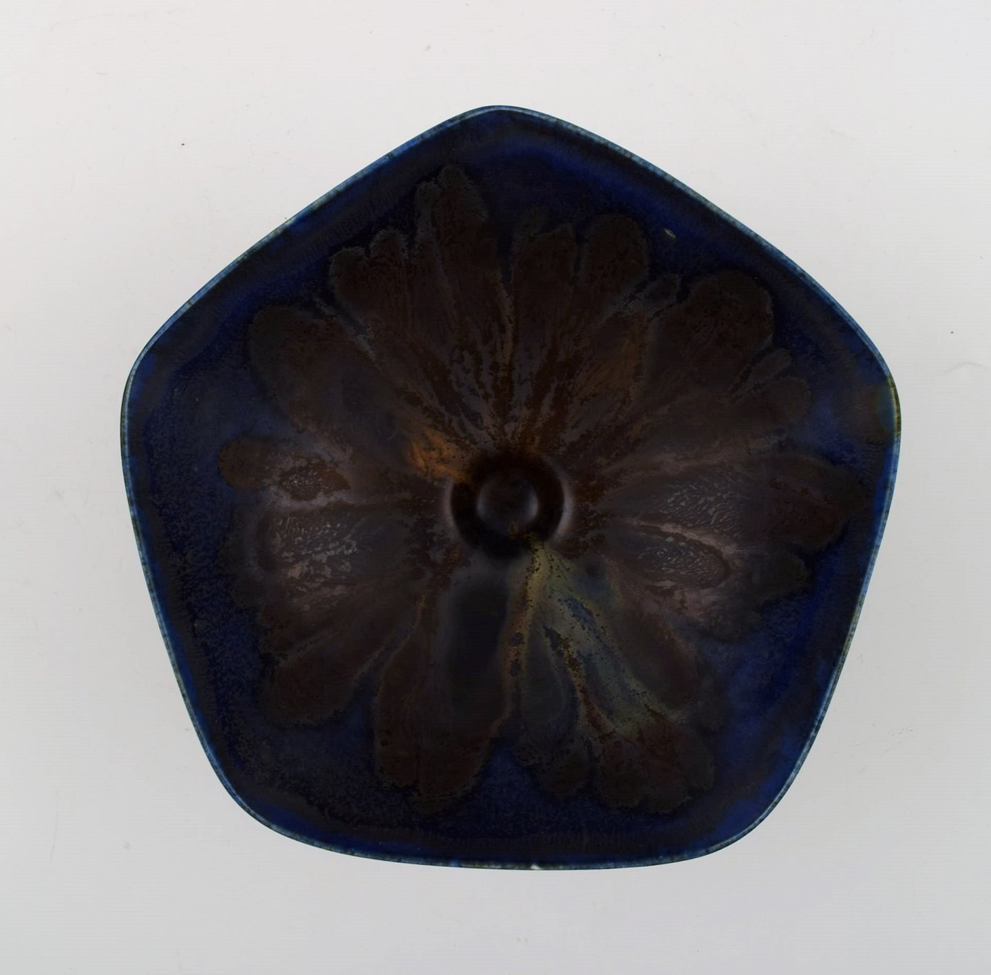Berndt Friberg Studio hand ceramic bowl. Modern Swedish design. Unique, handmade. Early stamp 1940s. Fantastic glaze in blue / brown shades. Perfect. 1st. factory quality. Measures 14 x 7 cm.