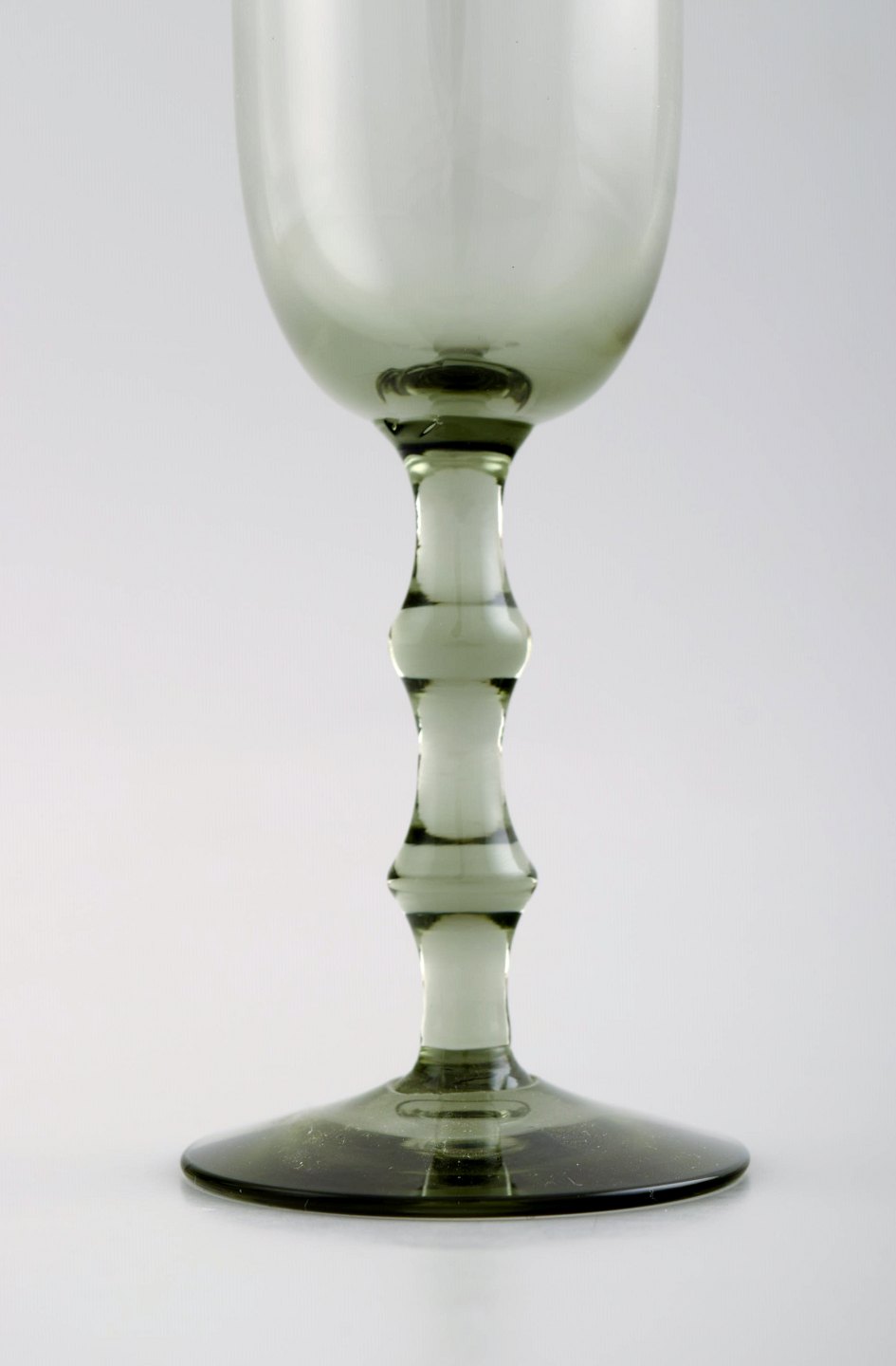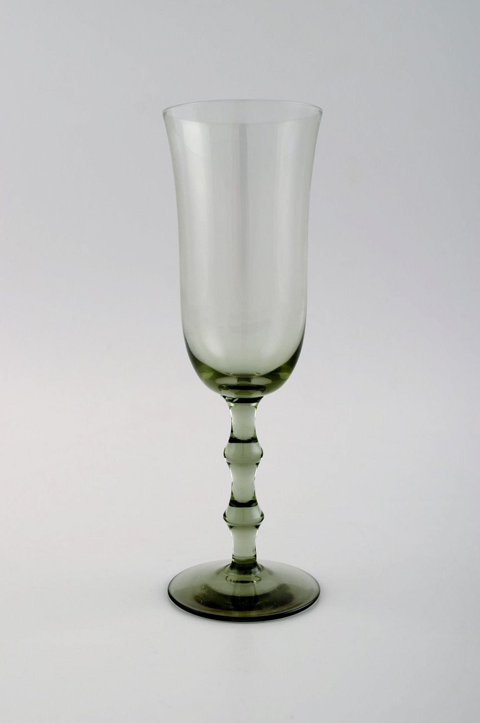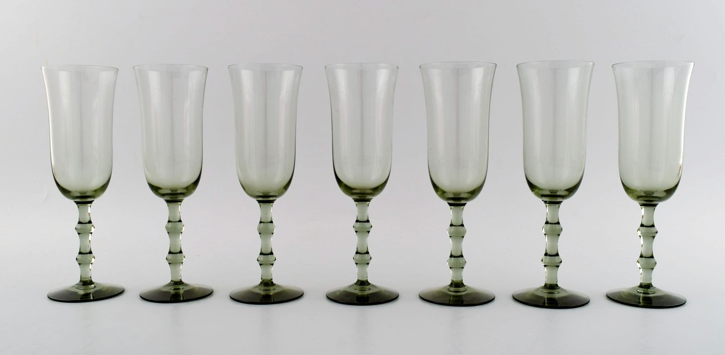 SIMON GATE for Orrefors, Et sæt på syv røgfarvede champagne kunstglas. Designer: Simon Gate Serie: Salut Producer: Orrefors Land: Sverige Designet: 1923 Størrelse: Højde 19 cm, diameter 6 cm.