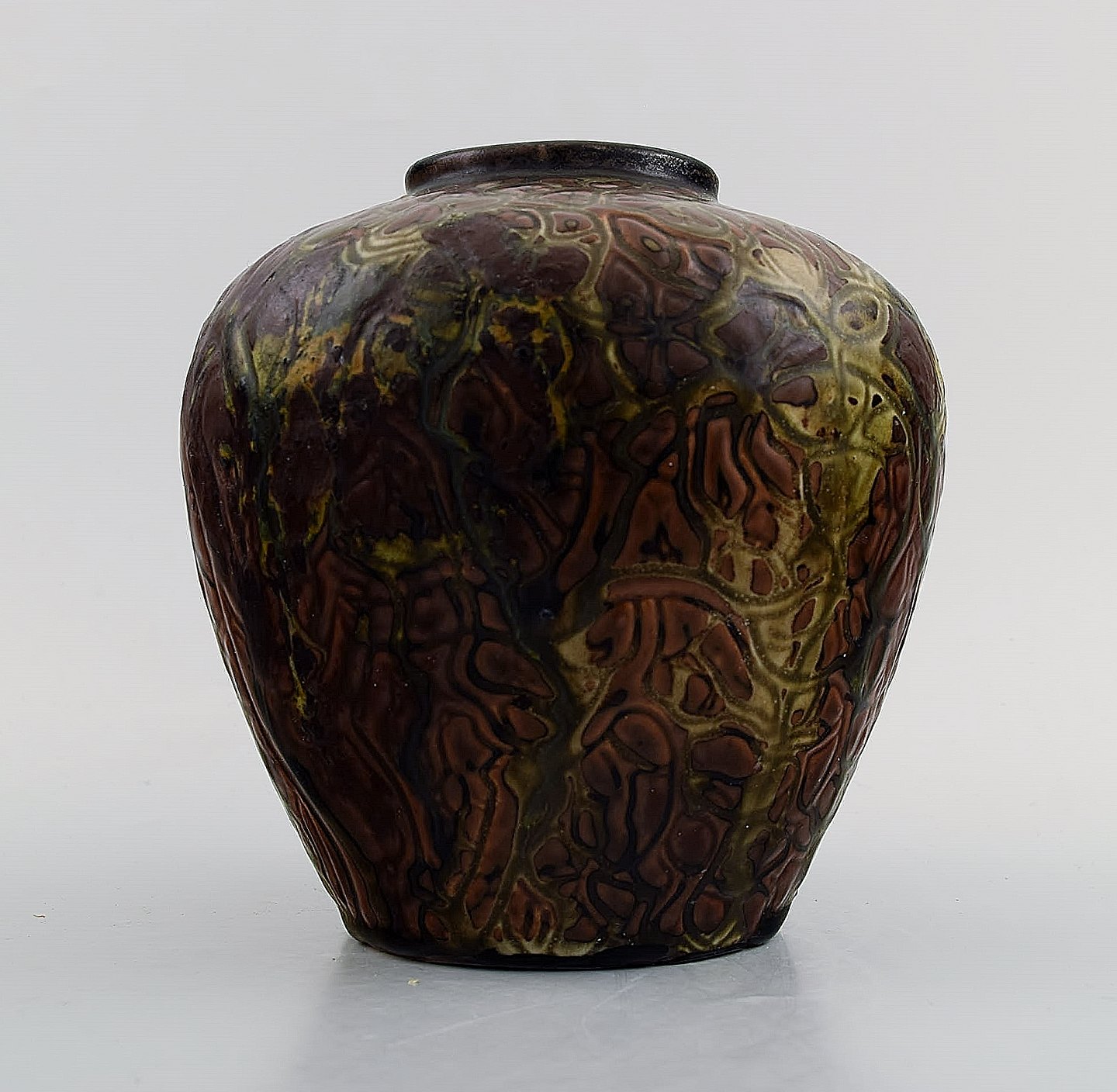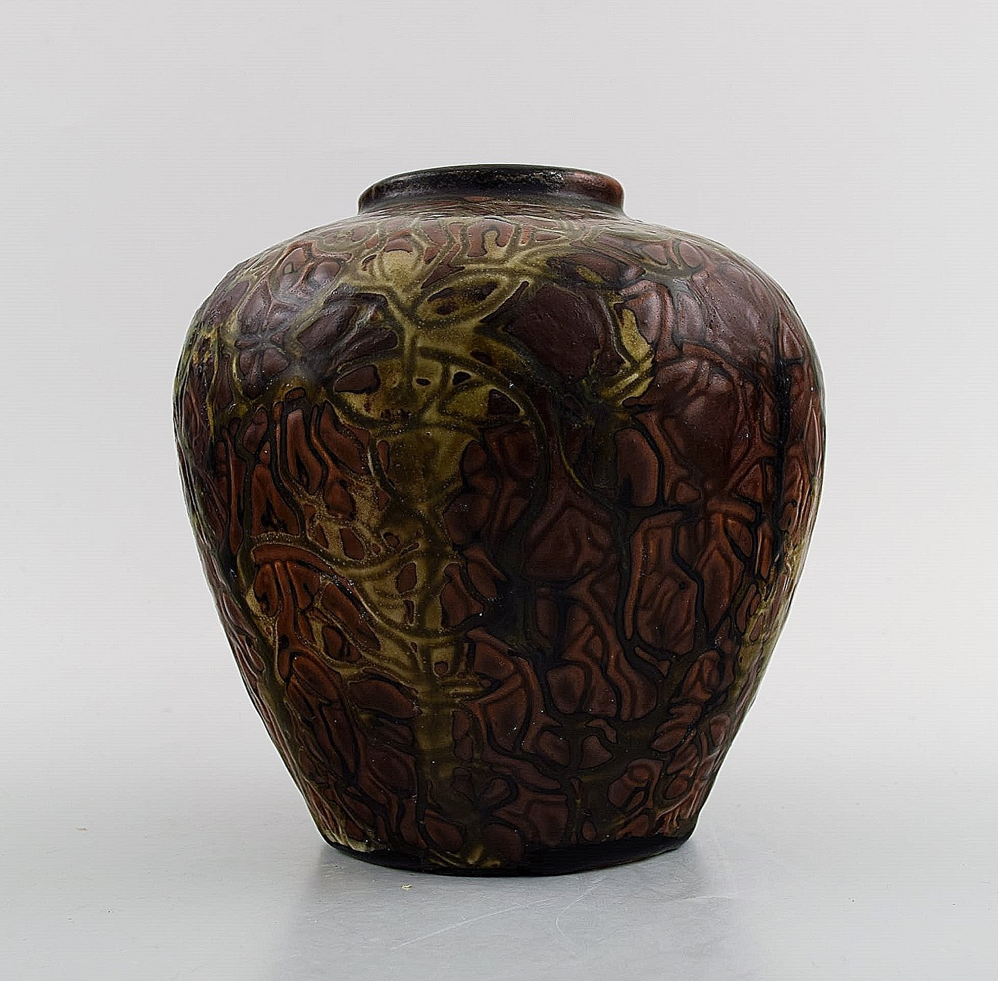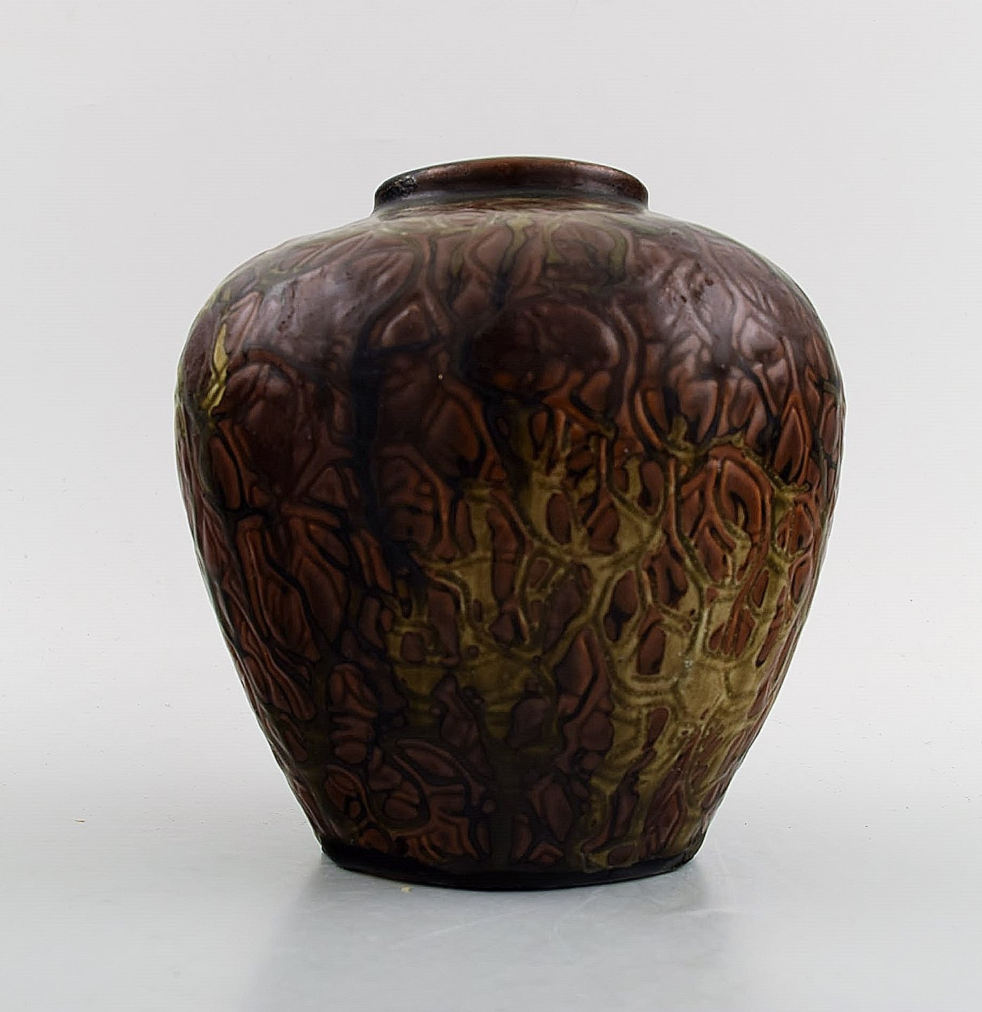 Early Axel Salto for Royal Copenhagen Stoneware vase decorated with foliage, sung glaze. Signed Salto. In perfect condition. 1st. factory quality. Measures 16 cm. X 15 cm.