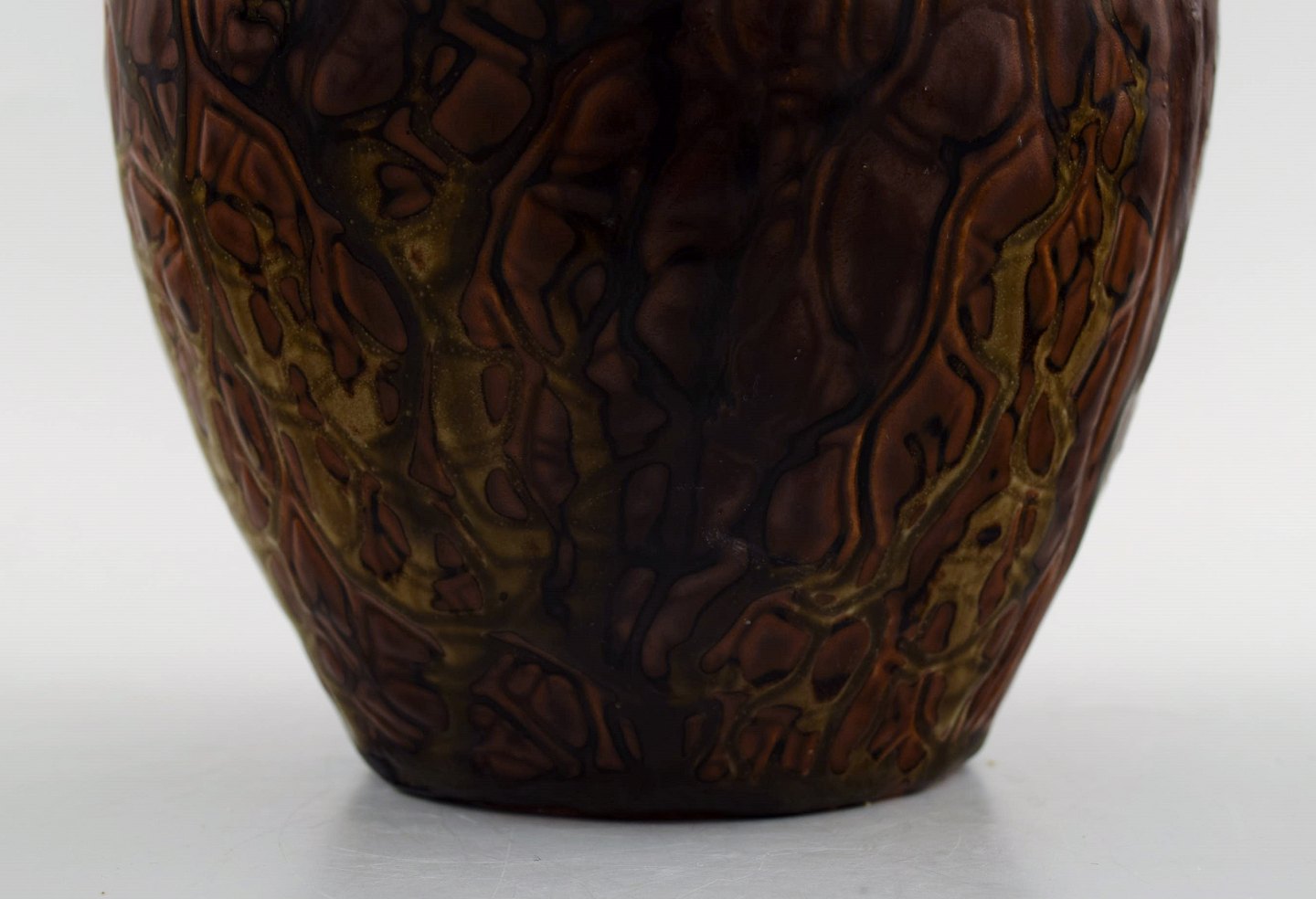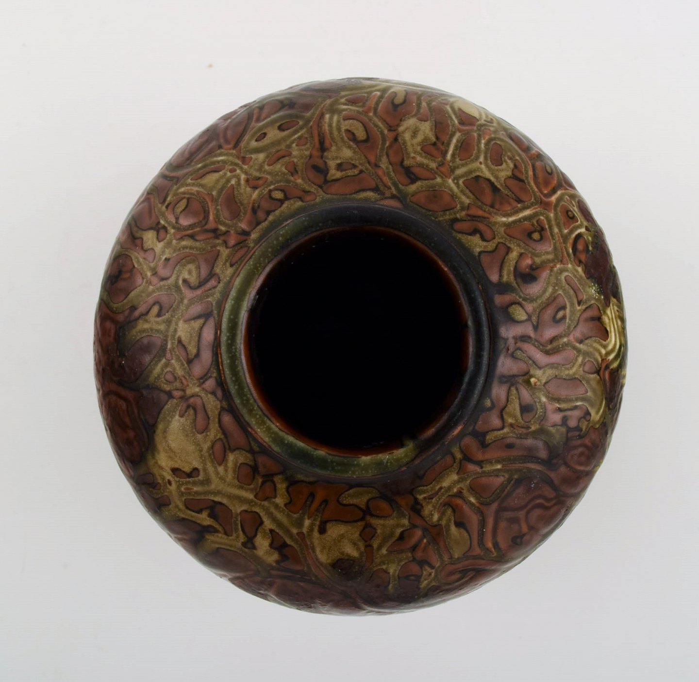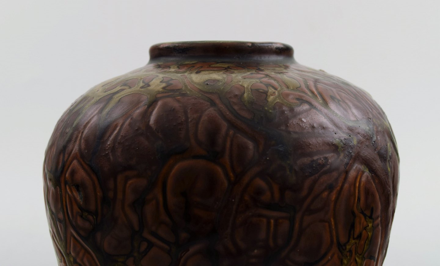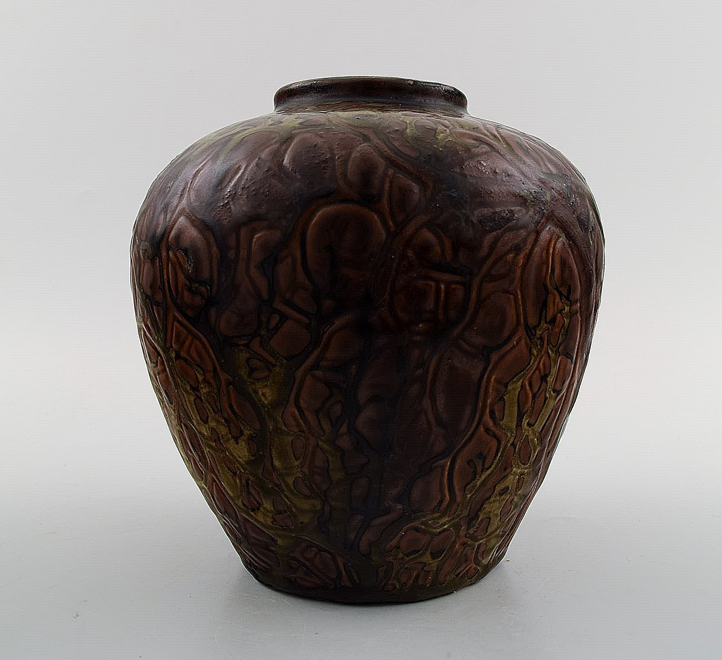 Early Axel Salto for Royal Copenhagen Stoneware vase decorated with foliage, sung glaze. Signed Salto. In perfect condition. 1st. factory quality. Measures 16 cm. X 15 cm.