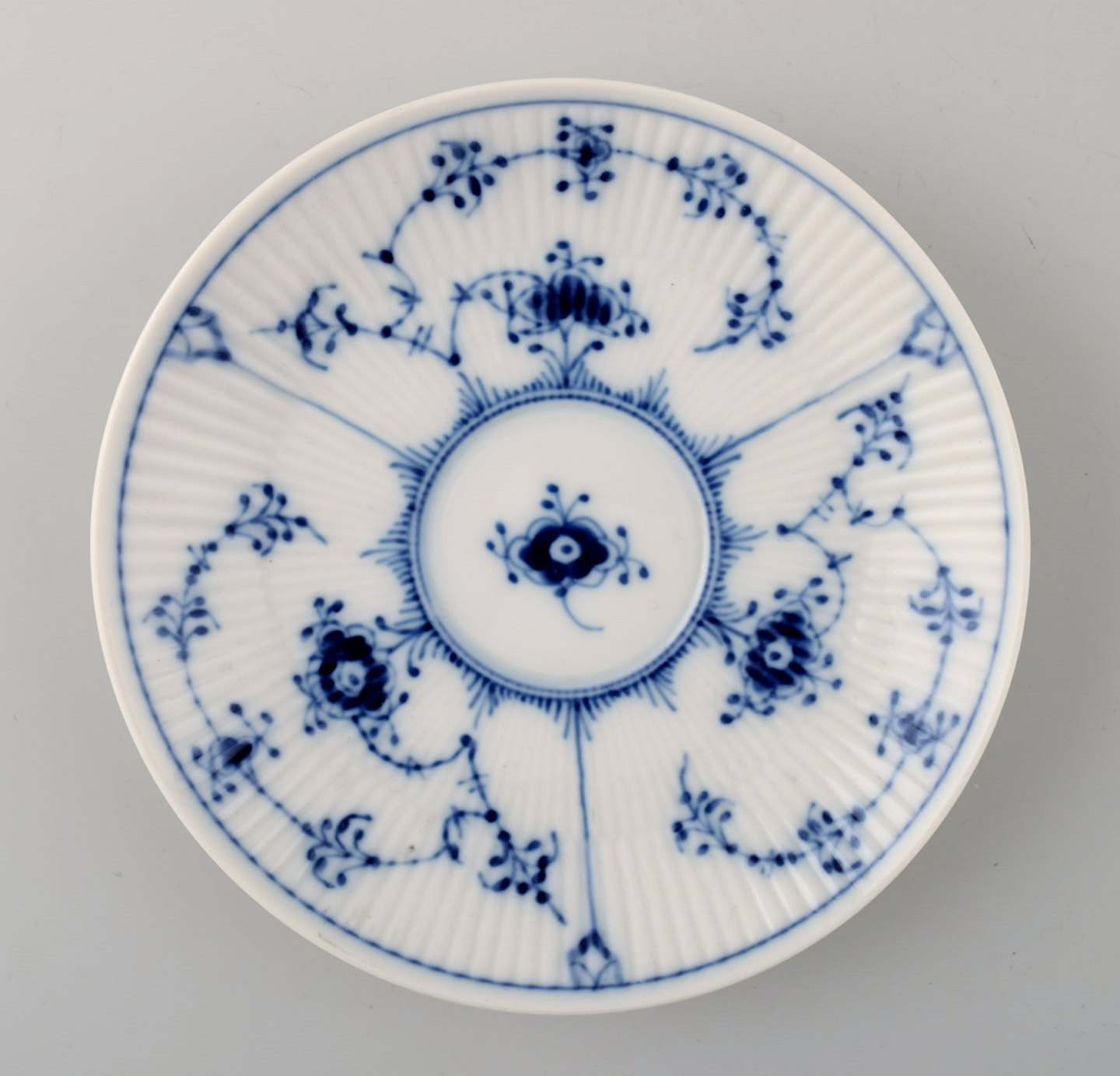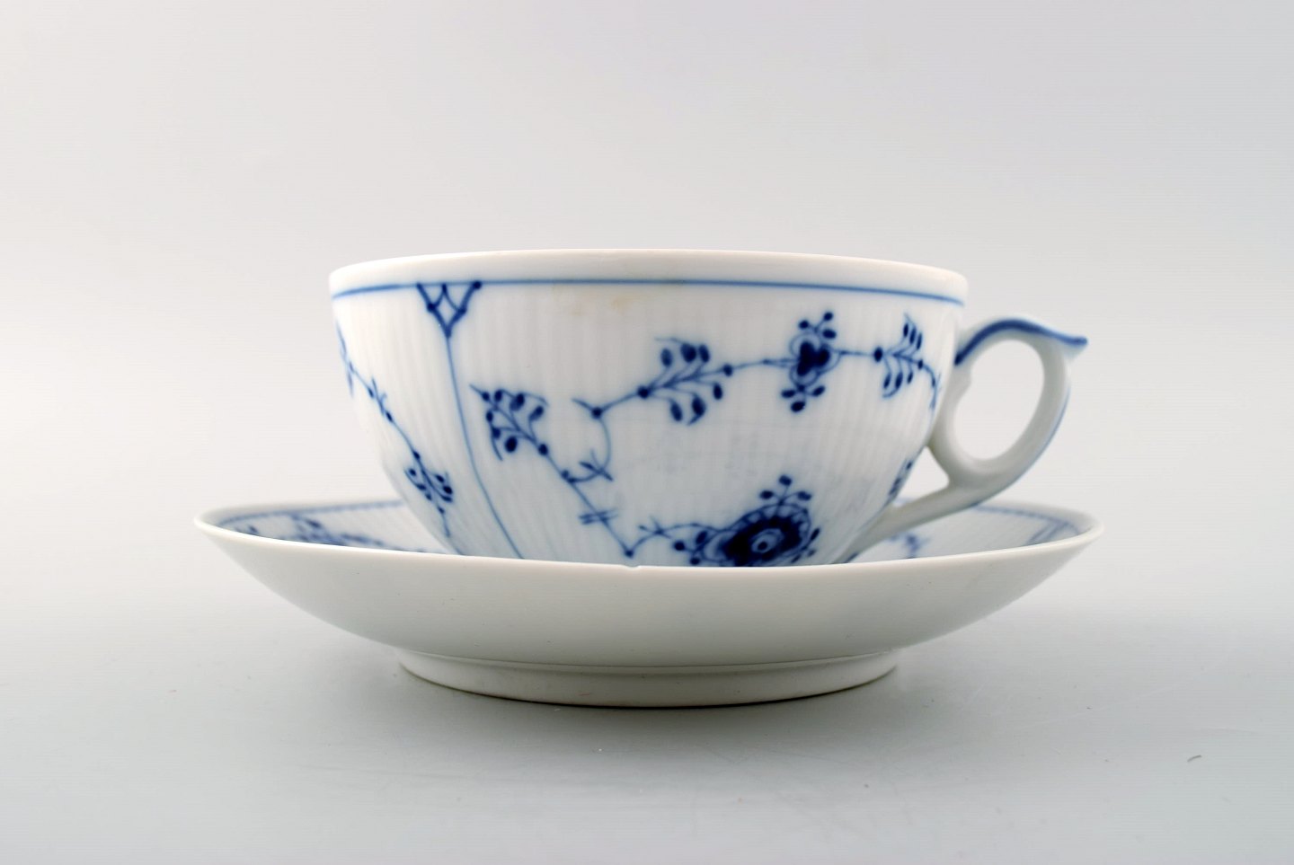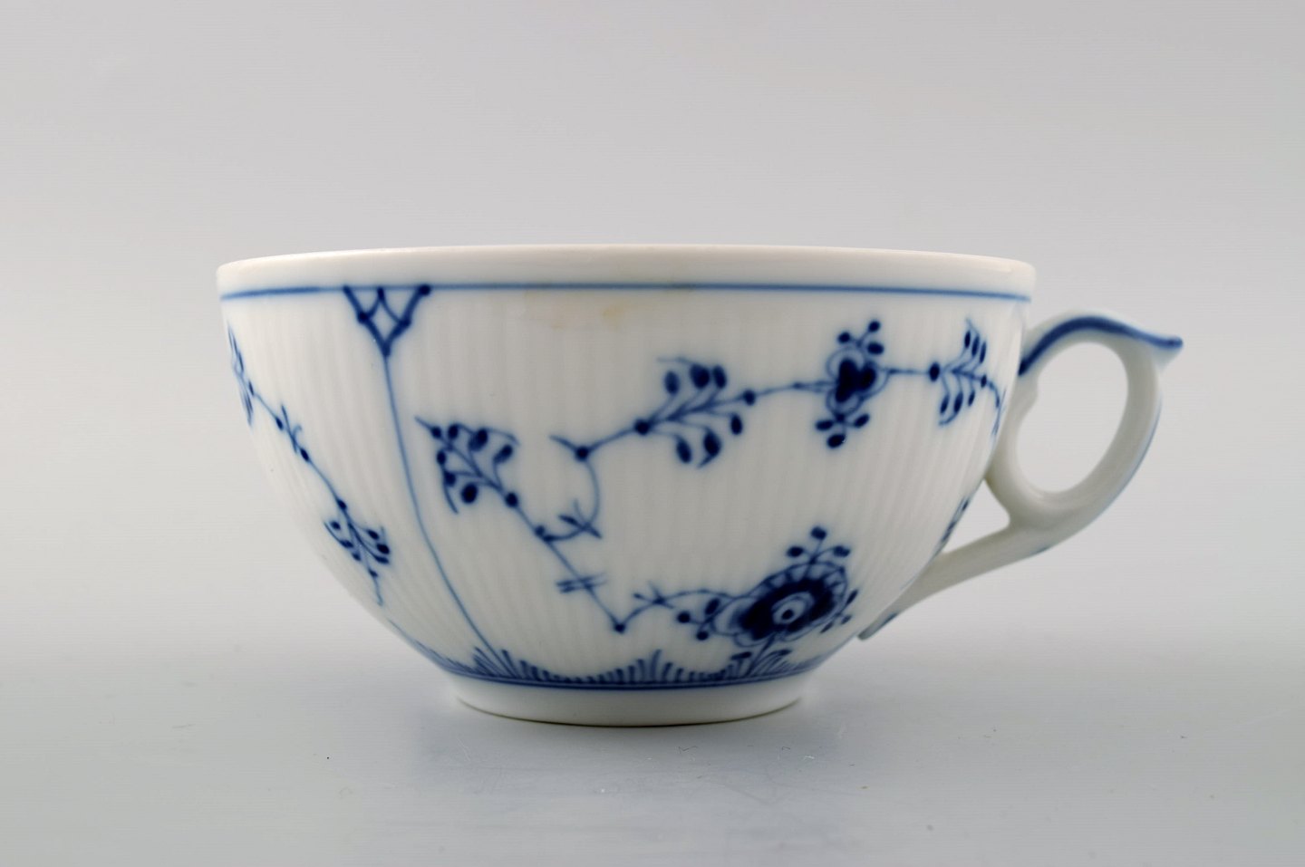 6 par Kgl. Musselmalet riflet Kongelig porcelæn. Royal Copenhagen Musselmalet riflet. Musselmalet stor thekop nr. 315. Højde 5,6 cm. Diameter 10,5 cm. 1. sortering, i perfekt stand. 2 sæt i anden sort.