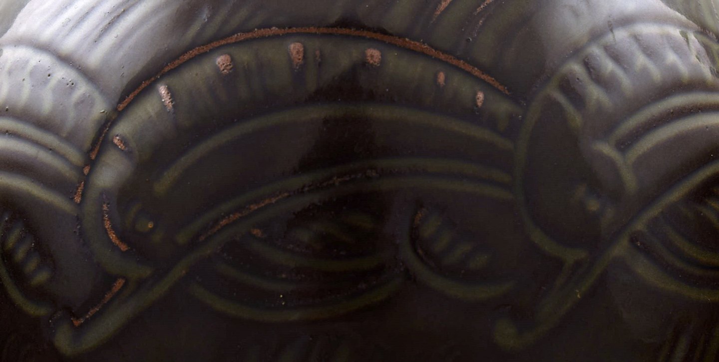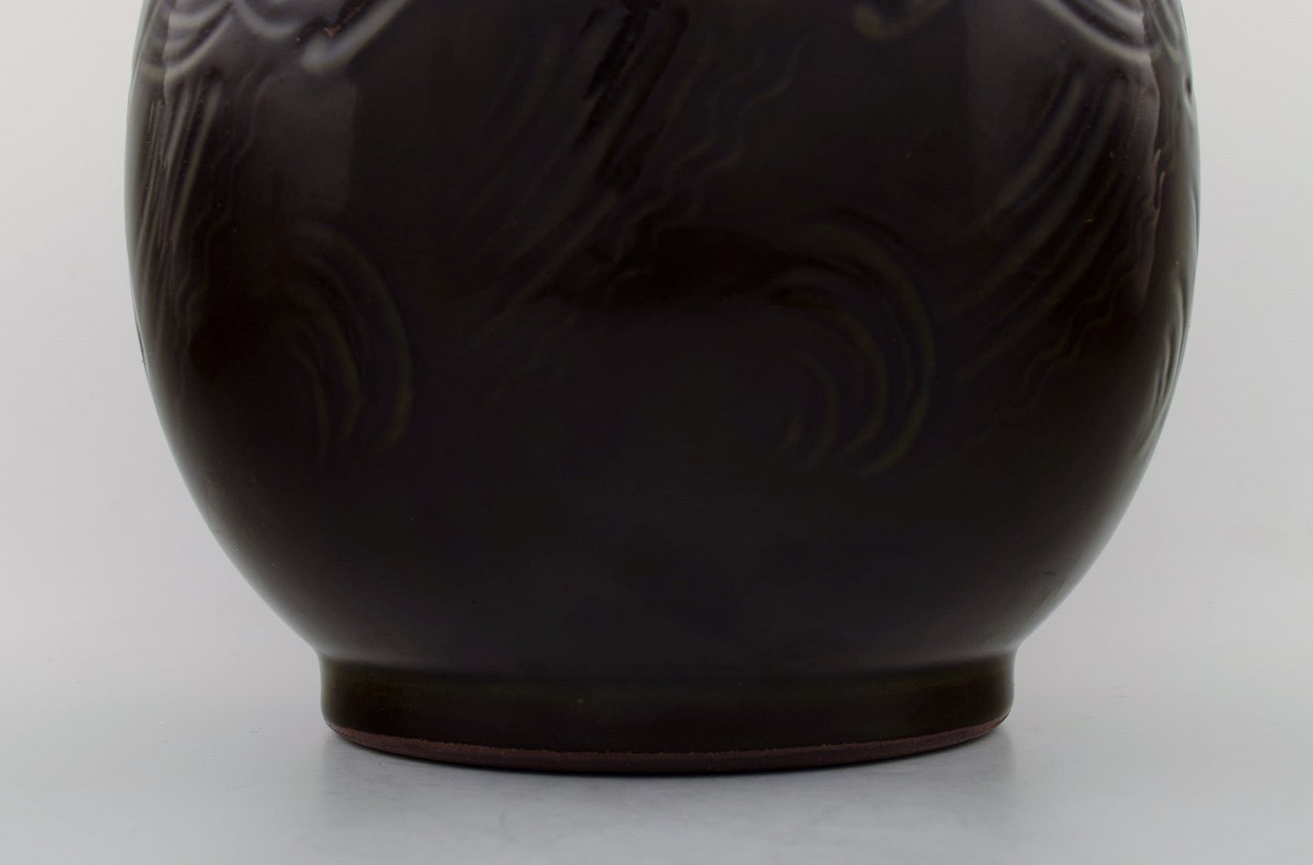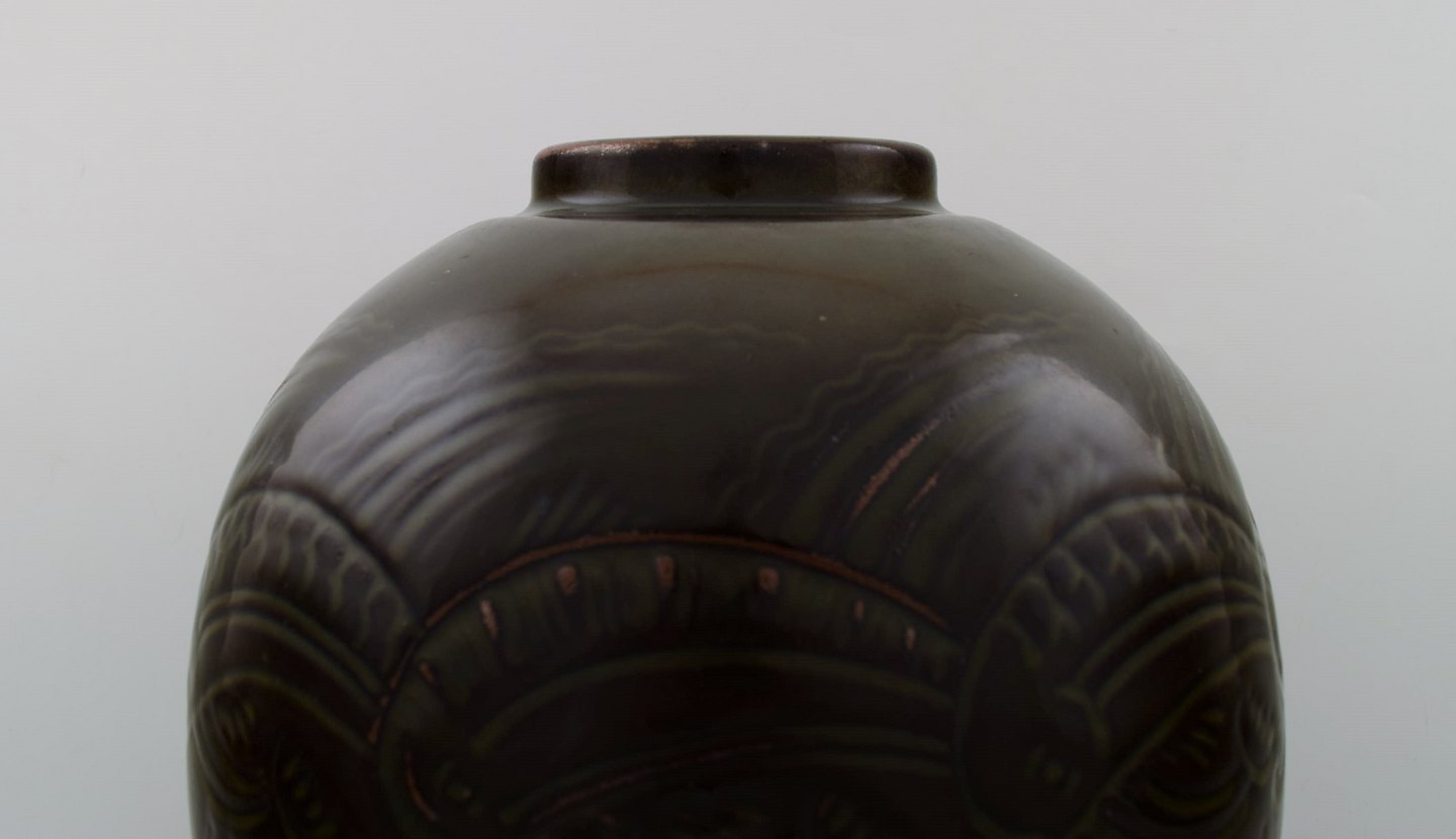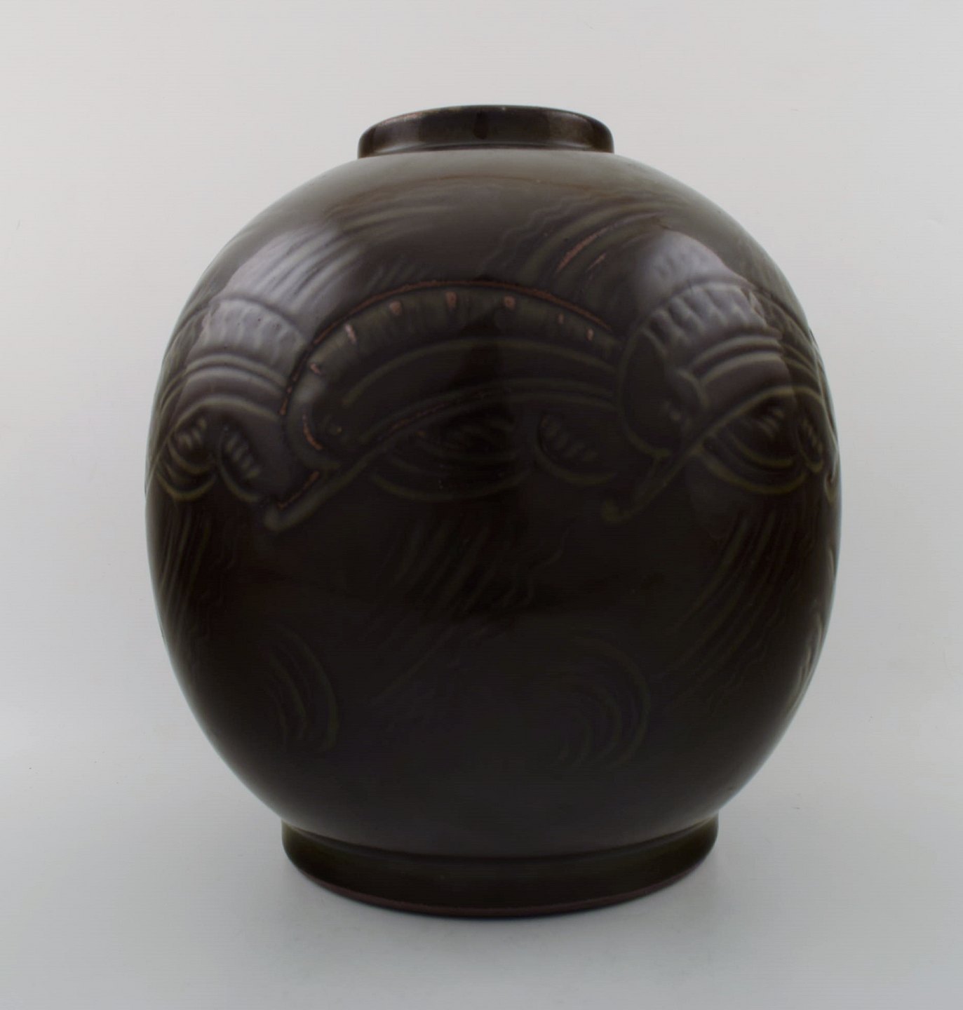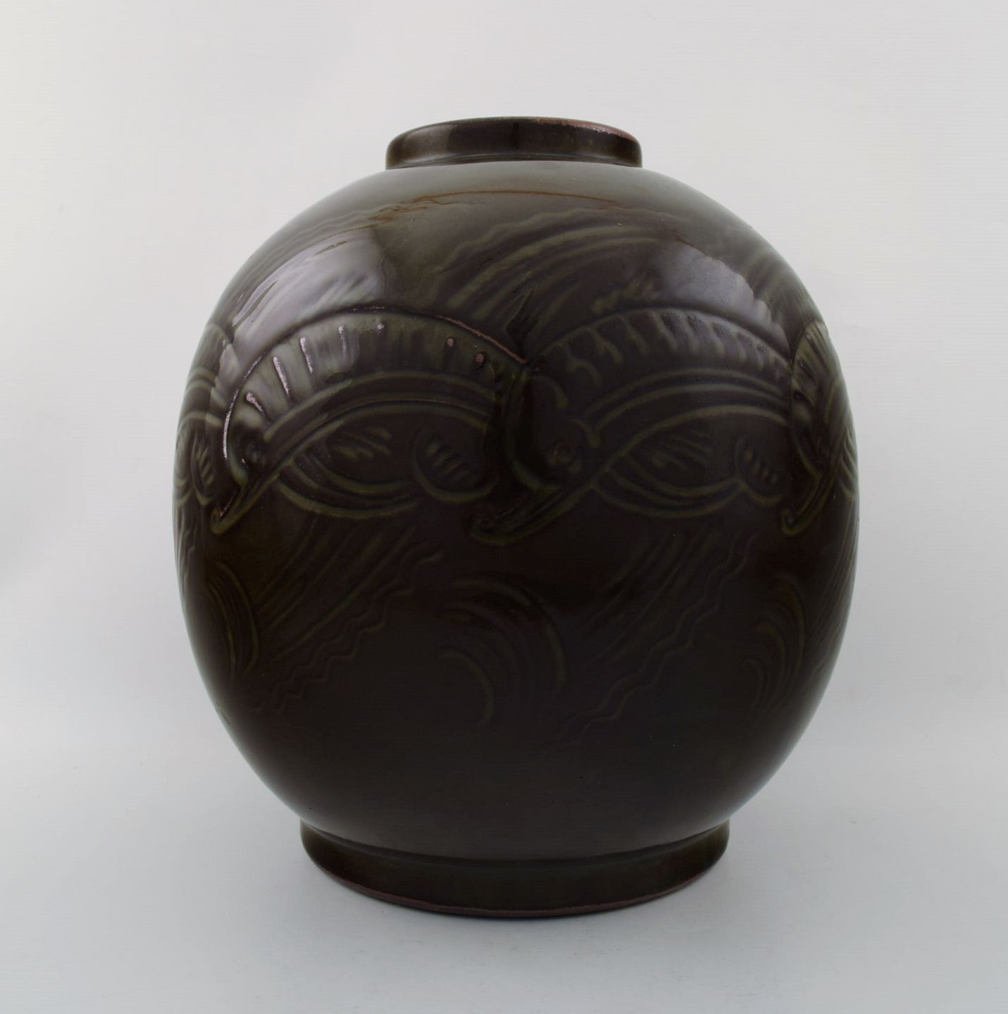 Nils Thorsson for Royal Copenhagen. Large jar in stoneware, motifs in the form of sea plants and fish. Mid 20 c.