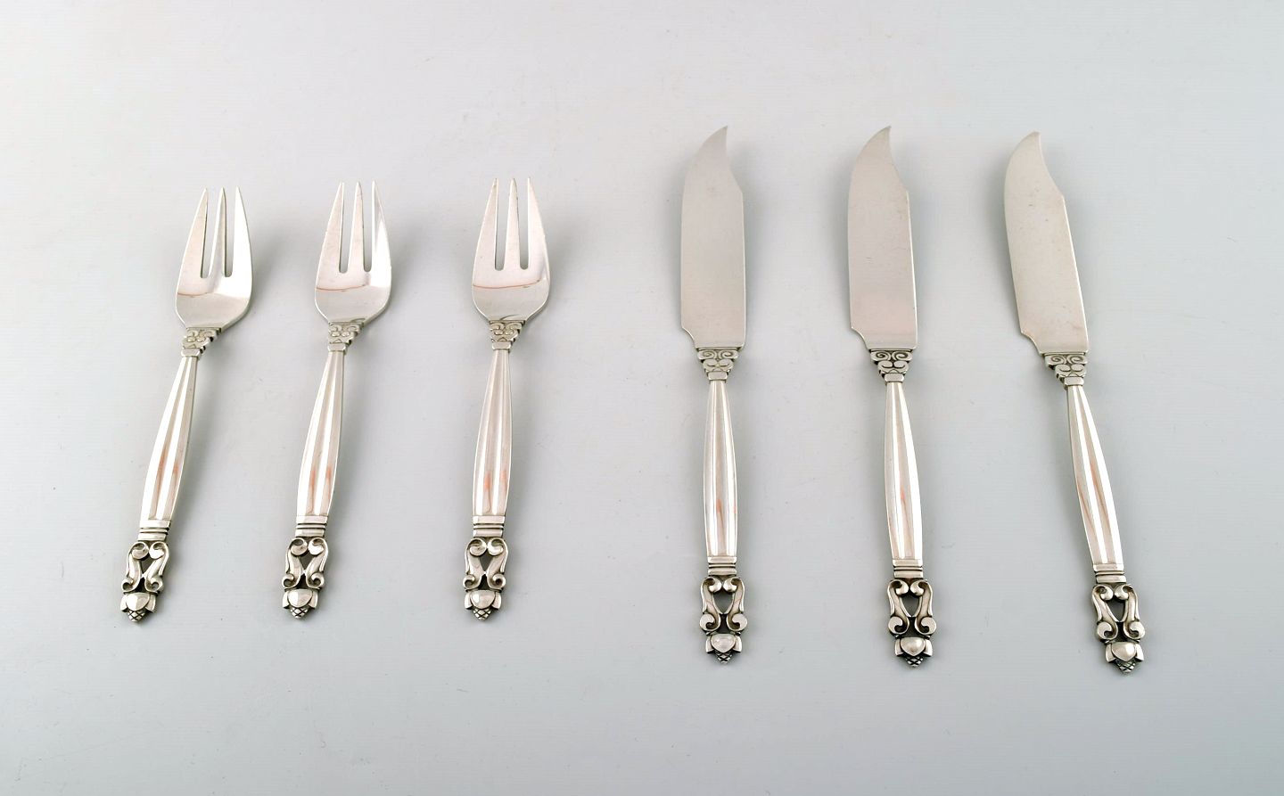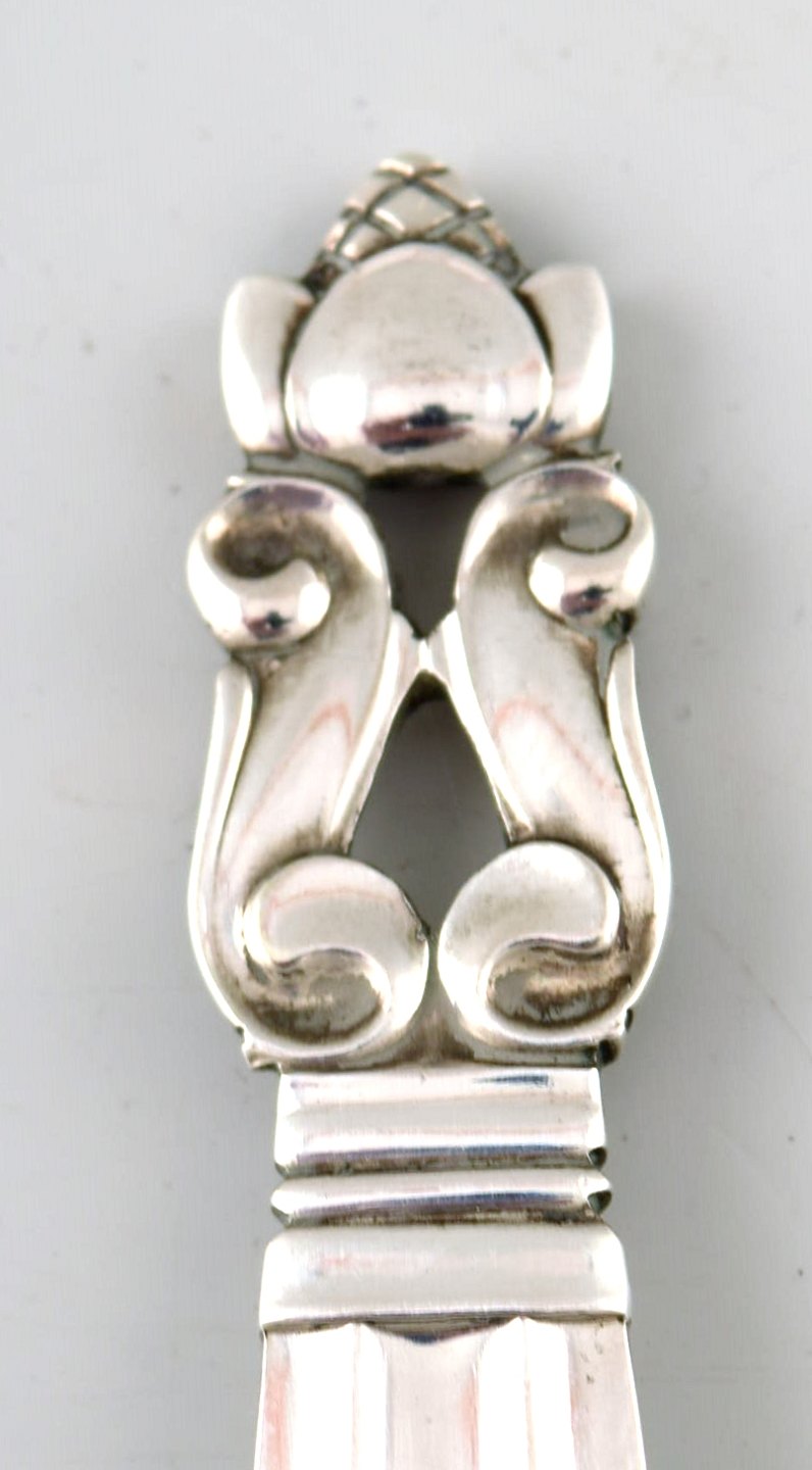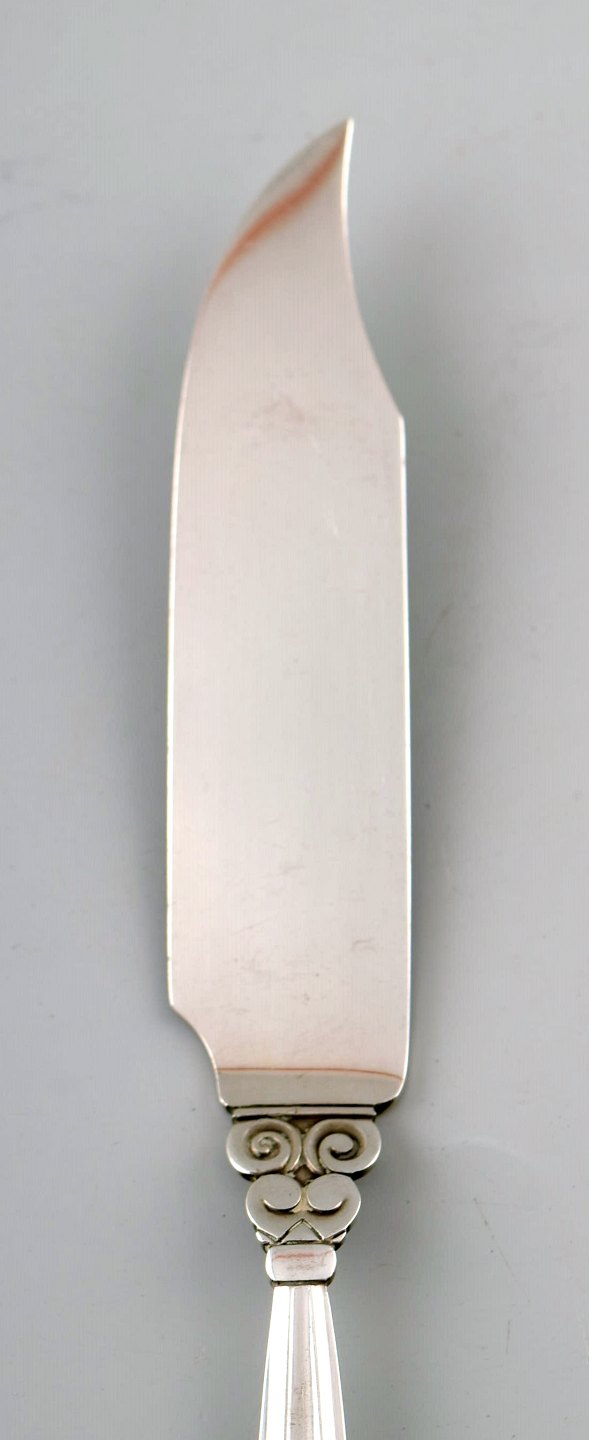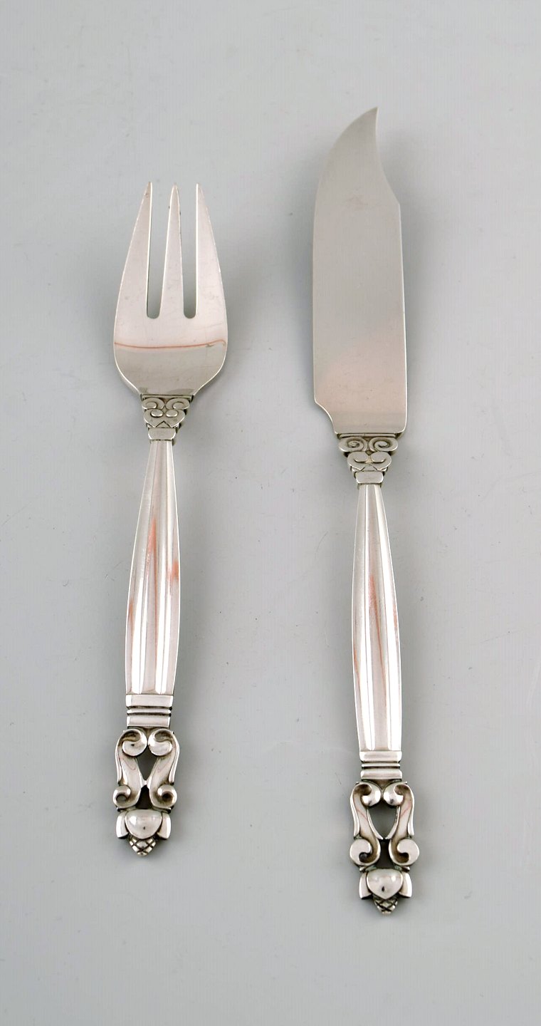 Georg Jensen "KONGE" fiskeservice til tre. Designer: Johan Rohde. Sterlingsølv. Længde: kniv 21 cm. Stemplet. I perfekt stand.