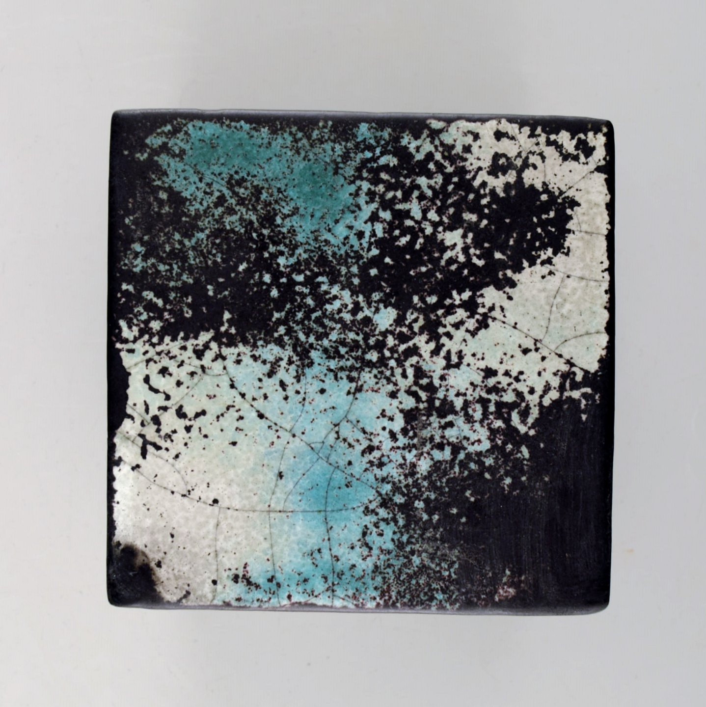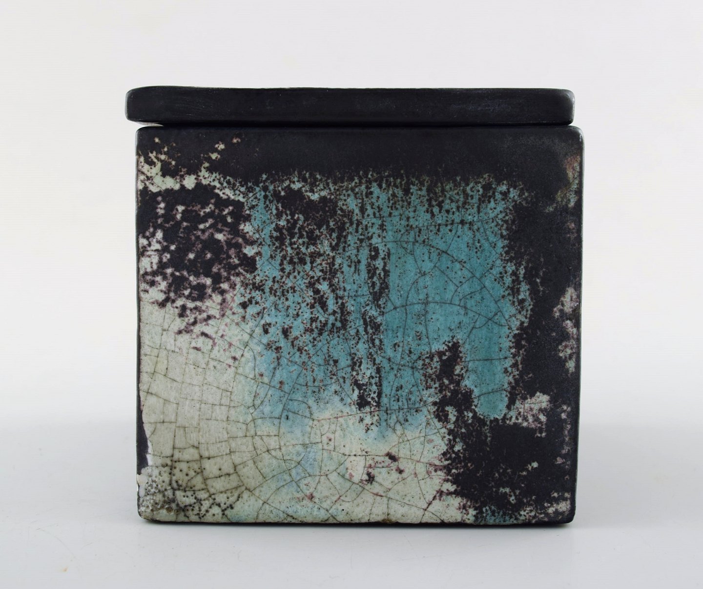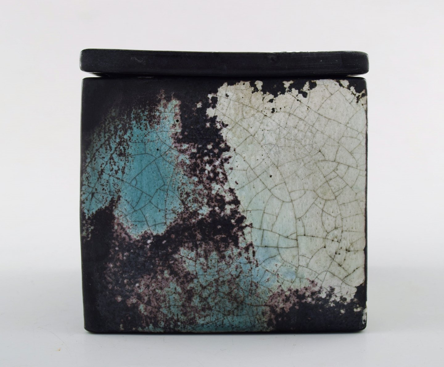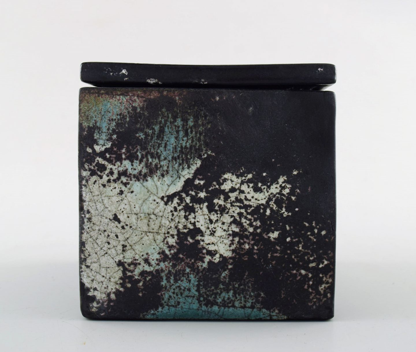 Svend Hammershoi for Kähler, Denmark, glazed stoneware jar with lid, 1930s. Designed by Svend Hammershoi. Turquoise green / black gray double glaze. Measures 10 x 10 cm. Stamped. In perfect condition.