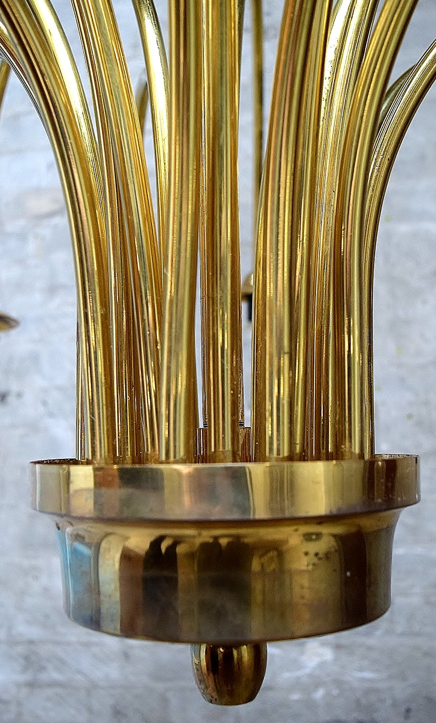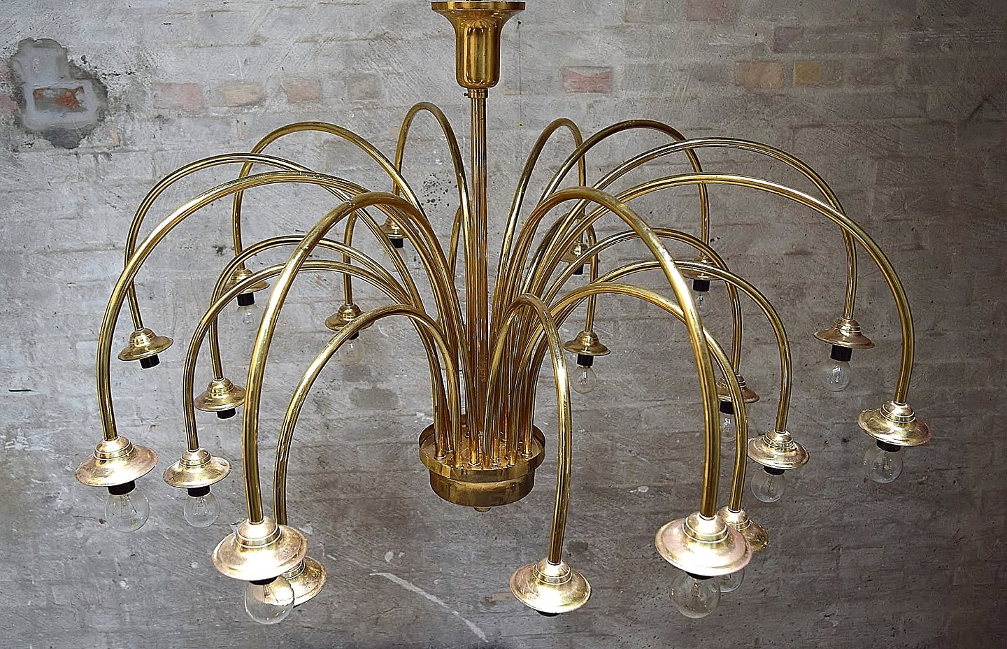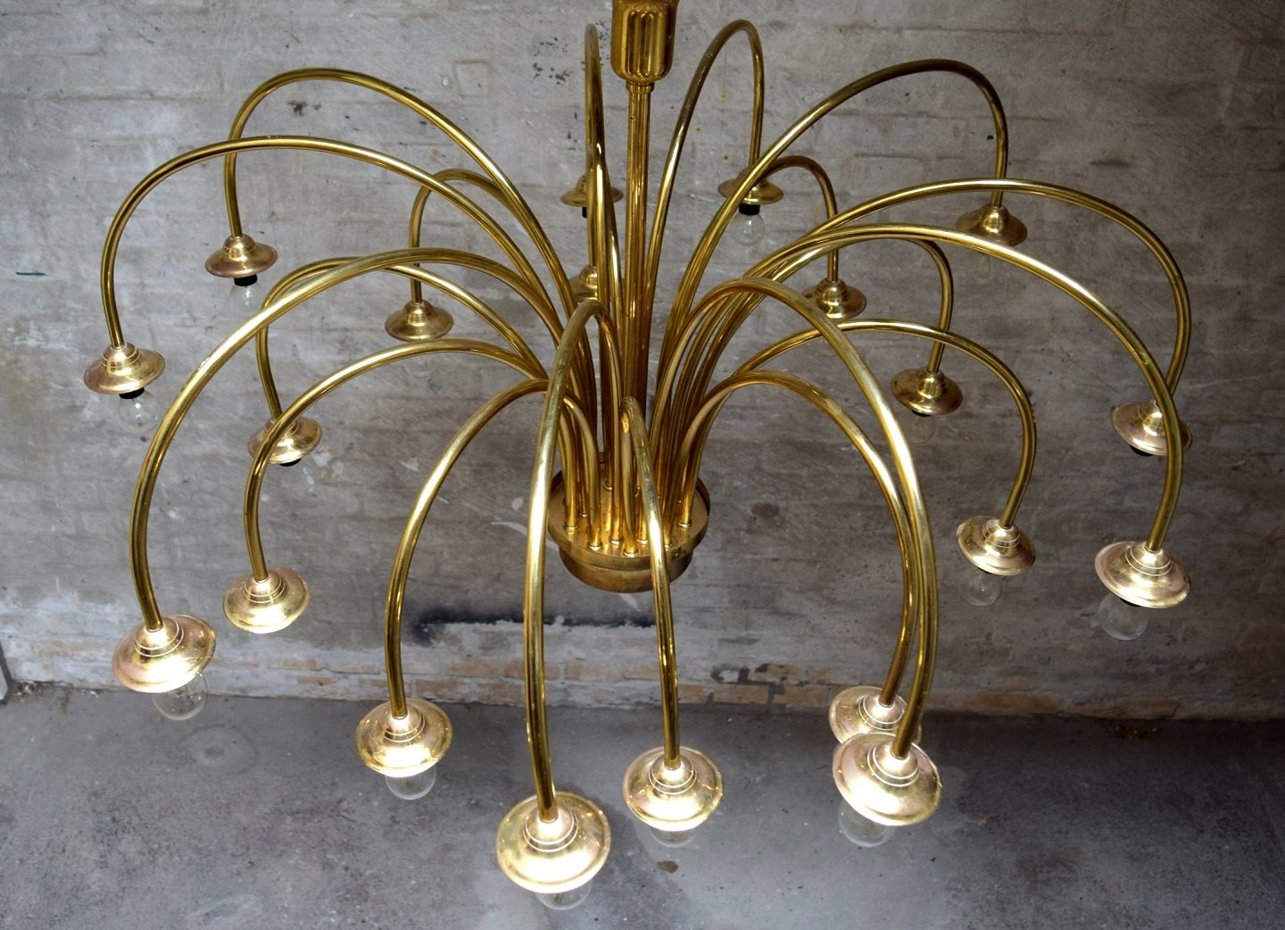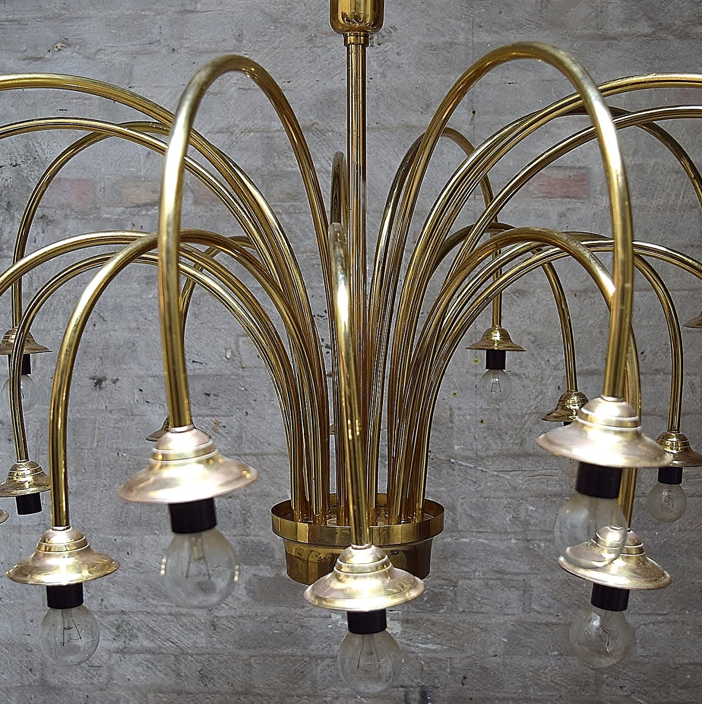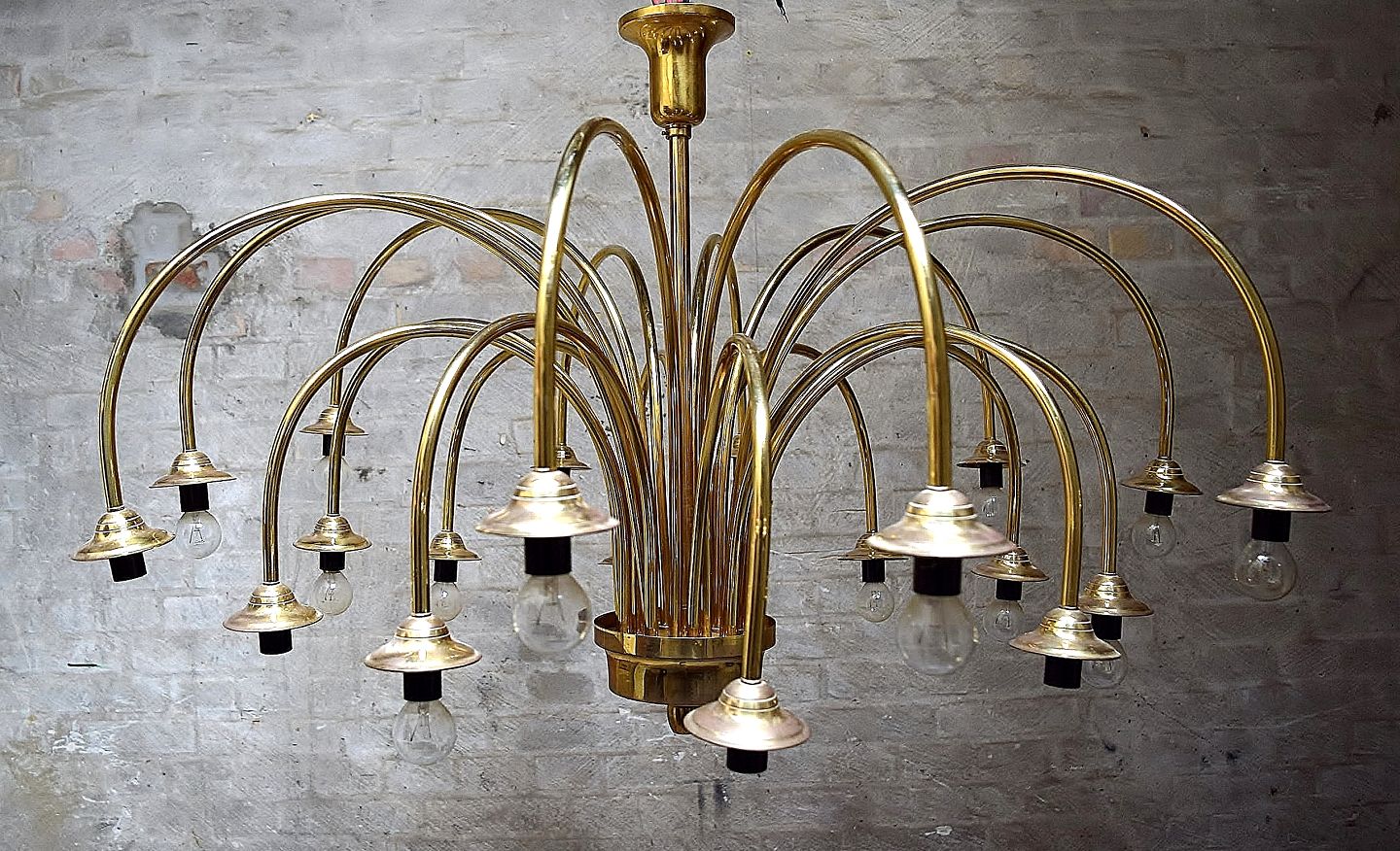 Skandinavisk design: Kolossal 20-armet lysekrone af messing. Diameter 110 cm. I perfekt stand.