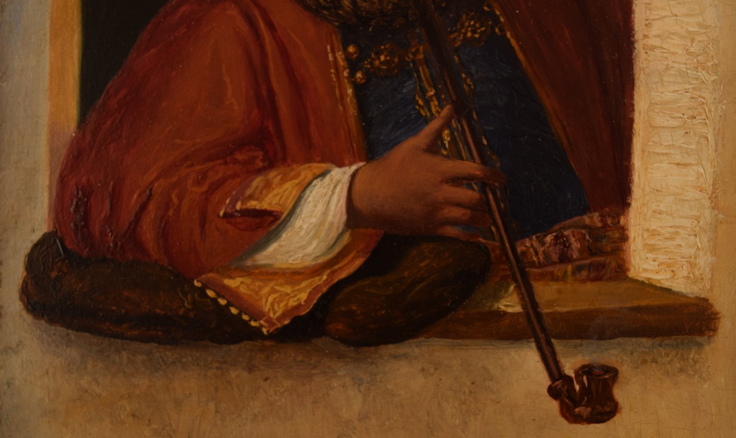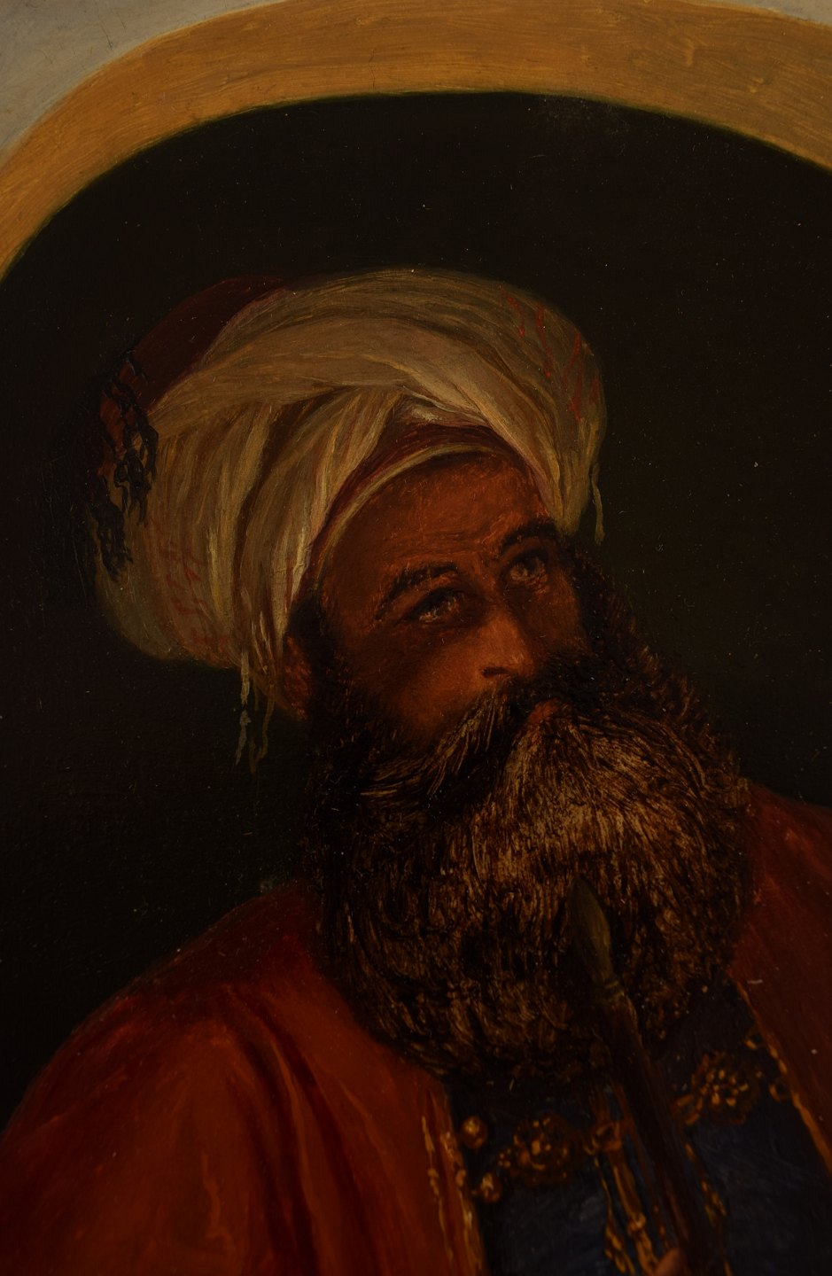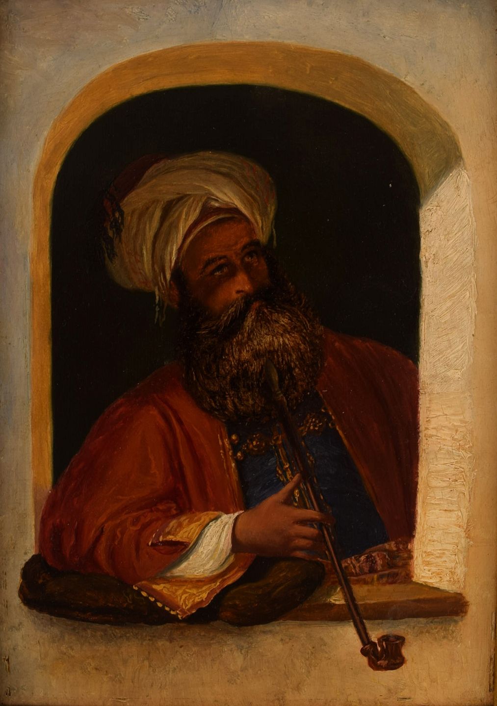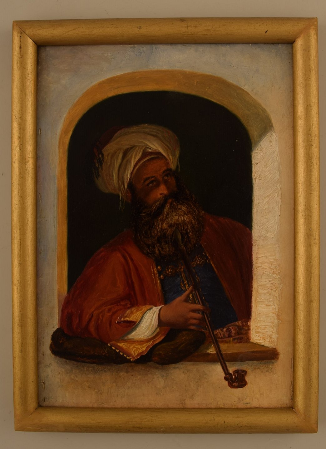 Painter unknown, 19th century. A pipe-smoking Turk with turban. Unsigned. Oil on wood.