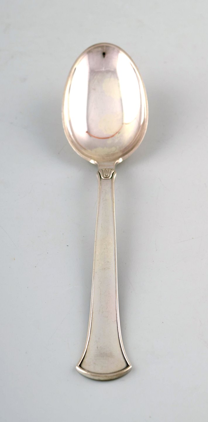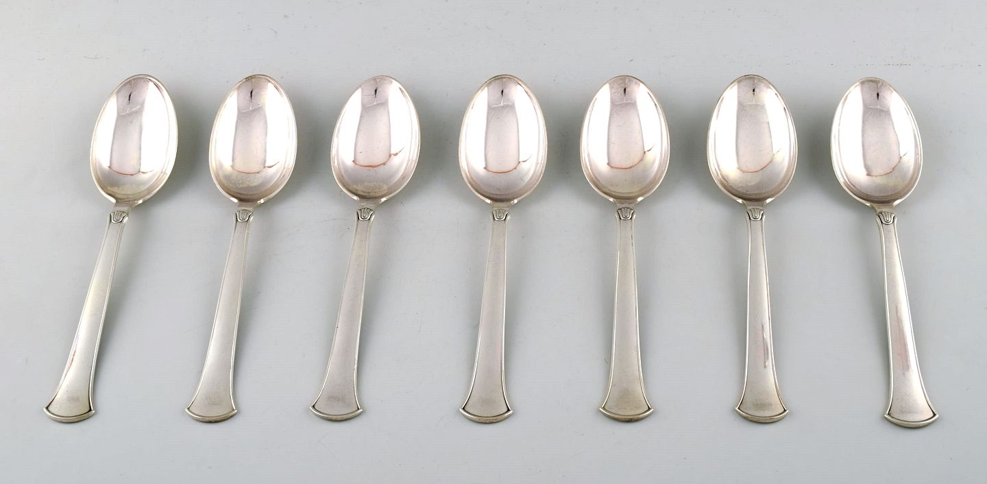 Hans Hansen sølvtøj Arvesølv nr. 5, Hans Hansen Arvesølv nr. 5, syv dessertskeer i sterlingsølv. Måler : 17 cm. Perfekt stand. Stemplet.
