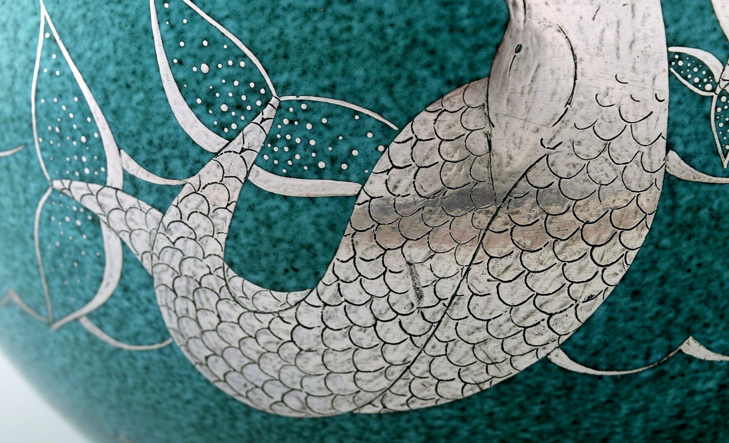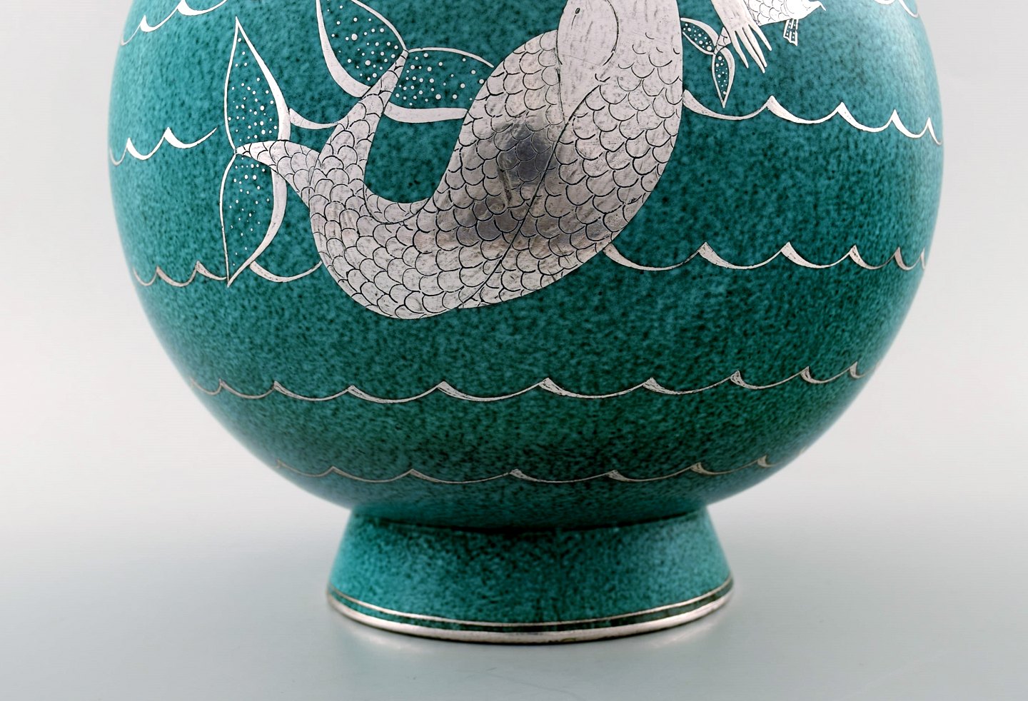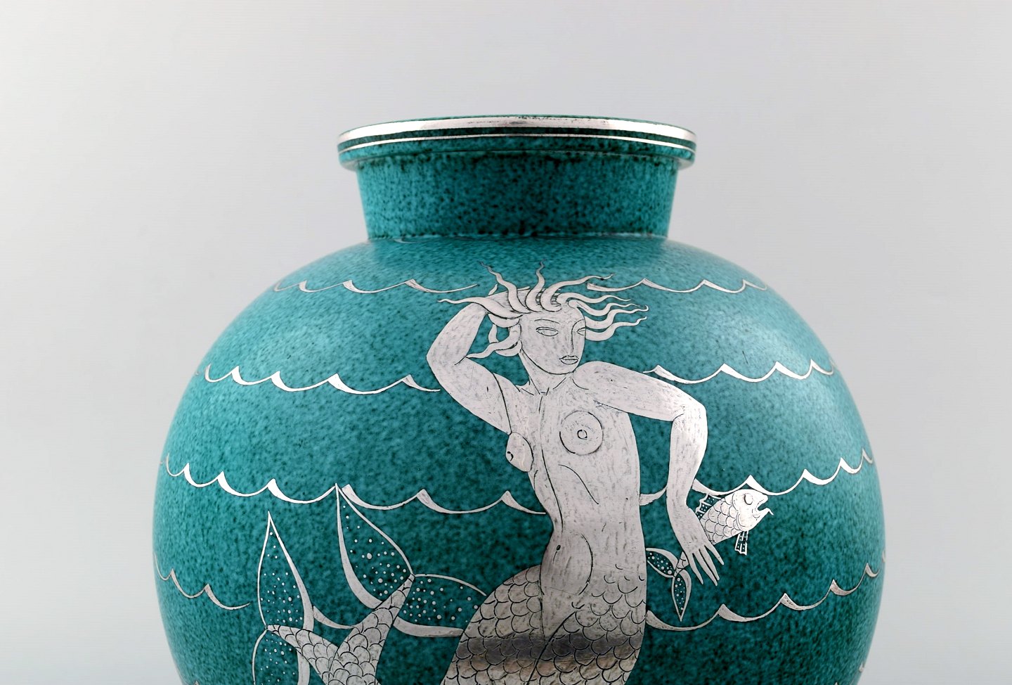 Wilhelm Kåge, Gustavsberg, Argenta Art deco stor kuglerund keramikvase dekoreret med havfrue. Sverige 1940´erne. Måler 26 x 22 cm. Stemplet Gustavsberg, Kåge. I perfekt stand.