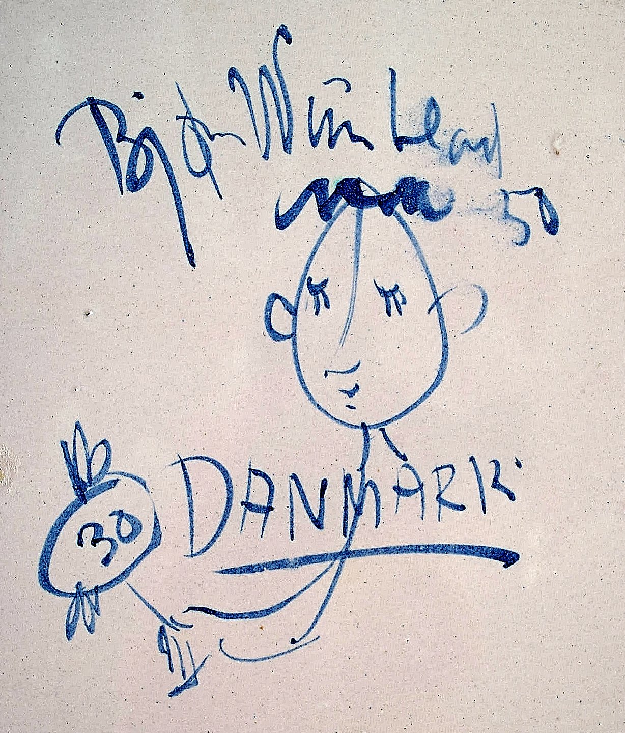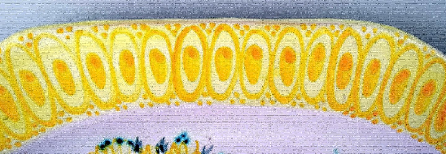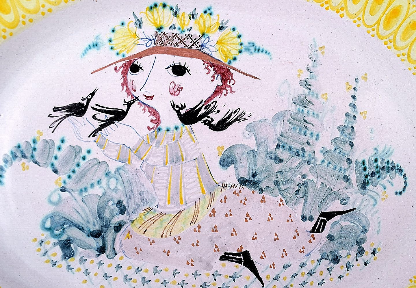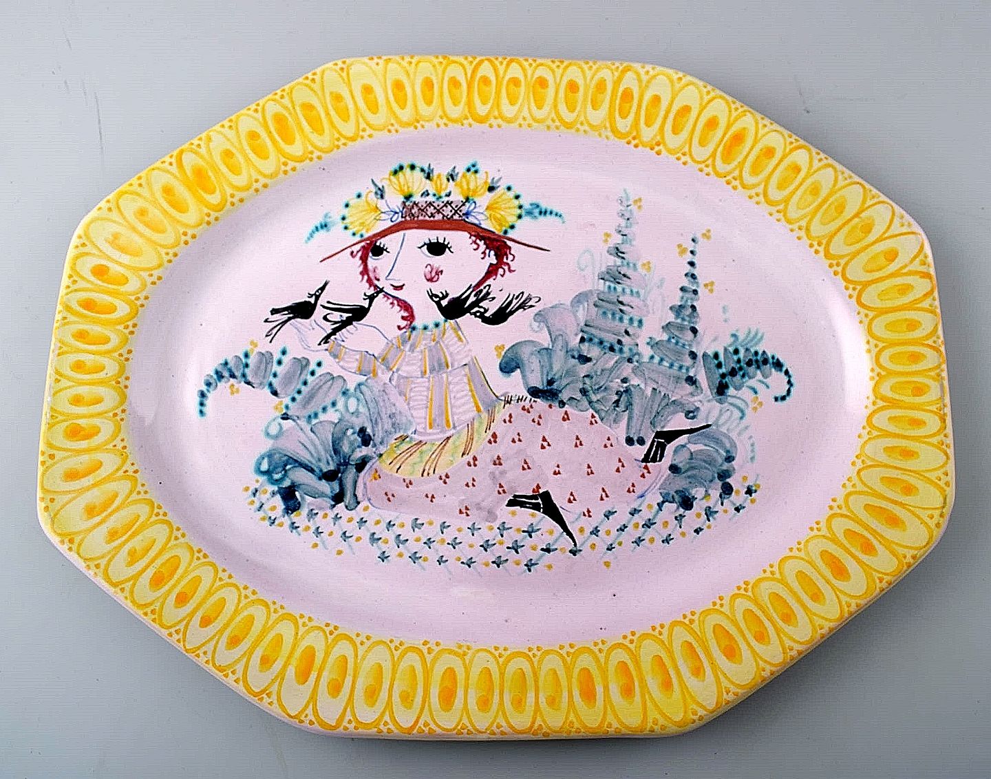 Bjørn Wiinblad : Sjældent og tidligt unika stort aflangt gult fad dekoreret med kvinde med blomster i håret, Bjørn Wiinblad 50. Længde : 36 cm. x 28 cm. bredt. I perfekt stand. Signeret 1950.