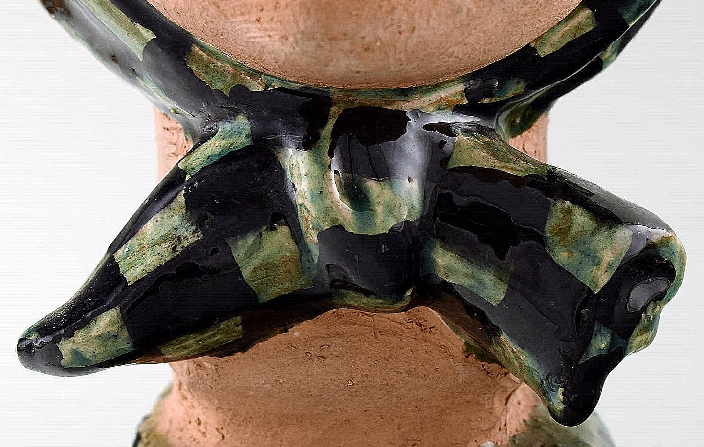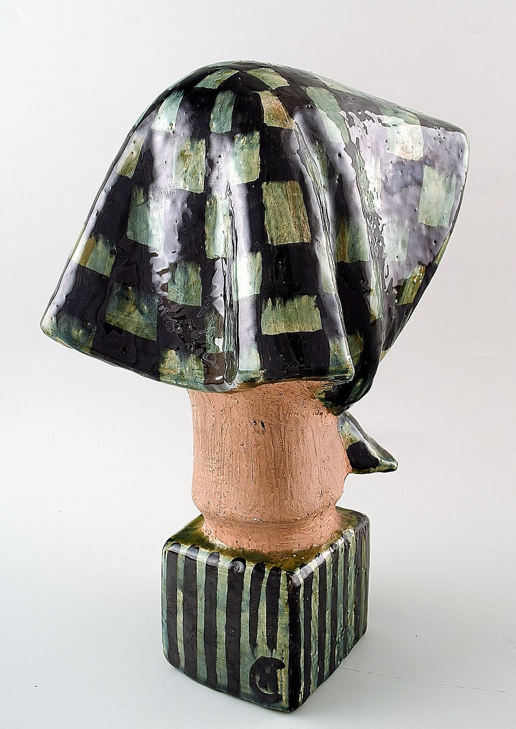 Helge Christoffersen, Eget værksted, stor unika figur af ung model iført tørklæde. Skulptur i keramik af høj kvalitet, flot glasur. Måler 29 x 20 cm. I perfekt stand. Signeret.