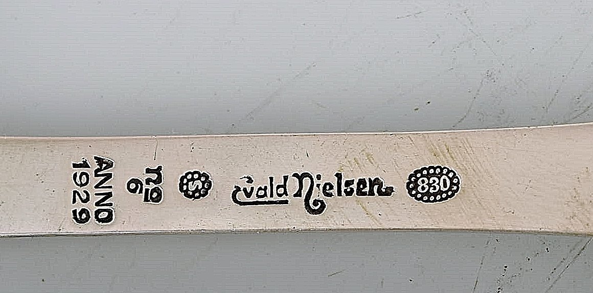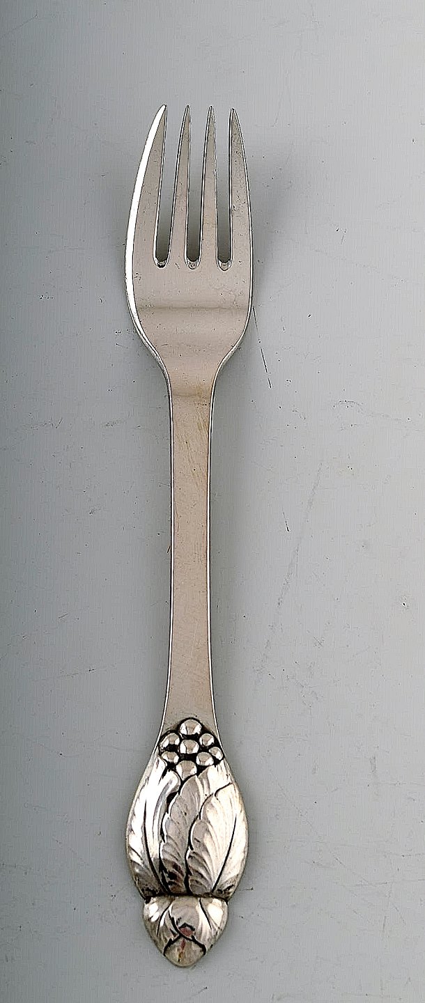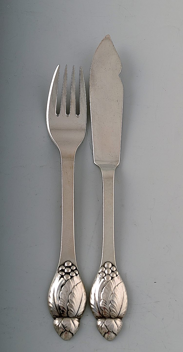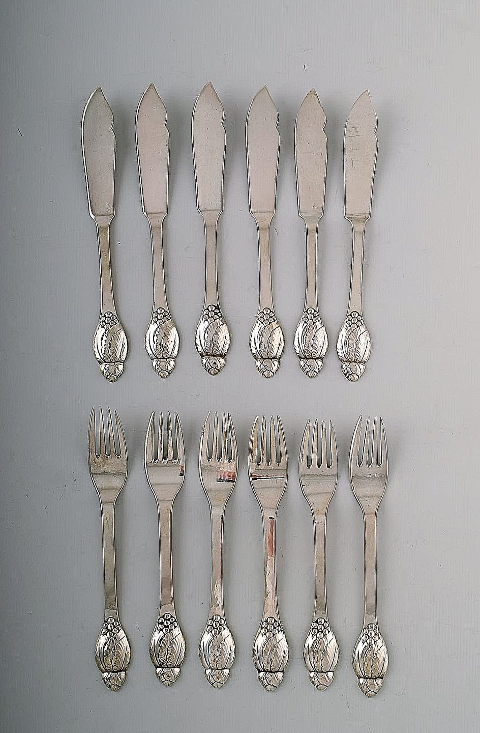 Evald Nielsen nummer 6, sjældent og komplet fiskeservice til seks personer i sølv. Dateret 1929. Måler : fiskekniv 20 cm. Stemplet. I perfekt stand.