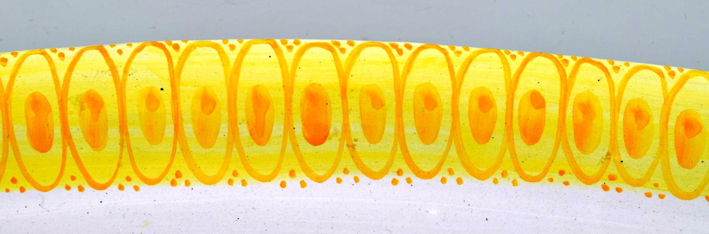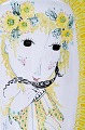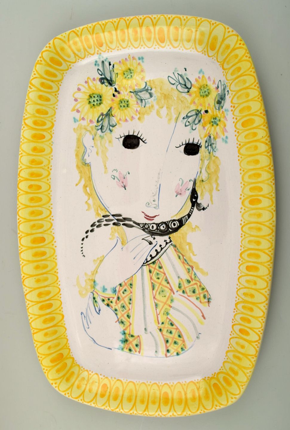 Bjørn Wiinblad : Sjældent og tidligt unika stort aflangt gult fad dekoreret med kvinde med blomster i håret, Bjørn Wiinblad 50. Længde : 42 cm. x 27 cm. bredt. I perfekt stand. Signeret 1950.