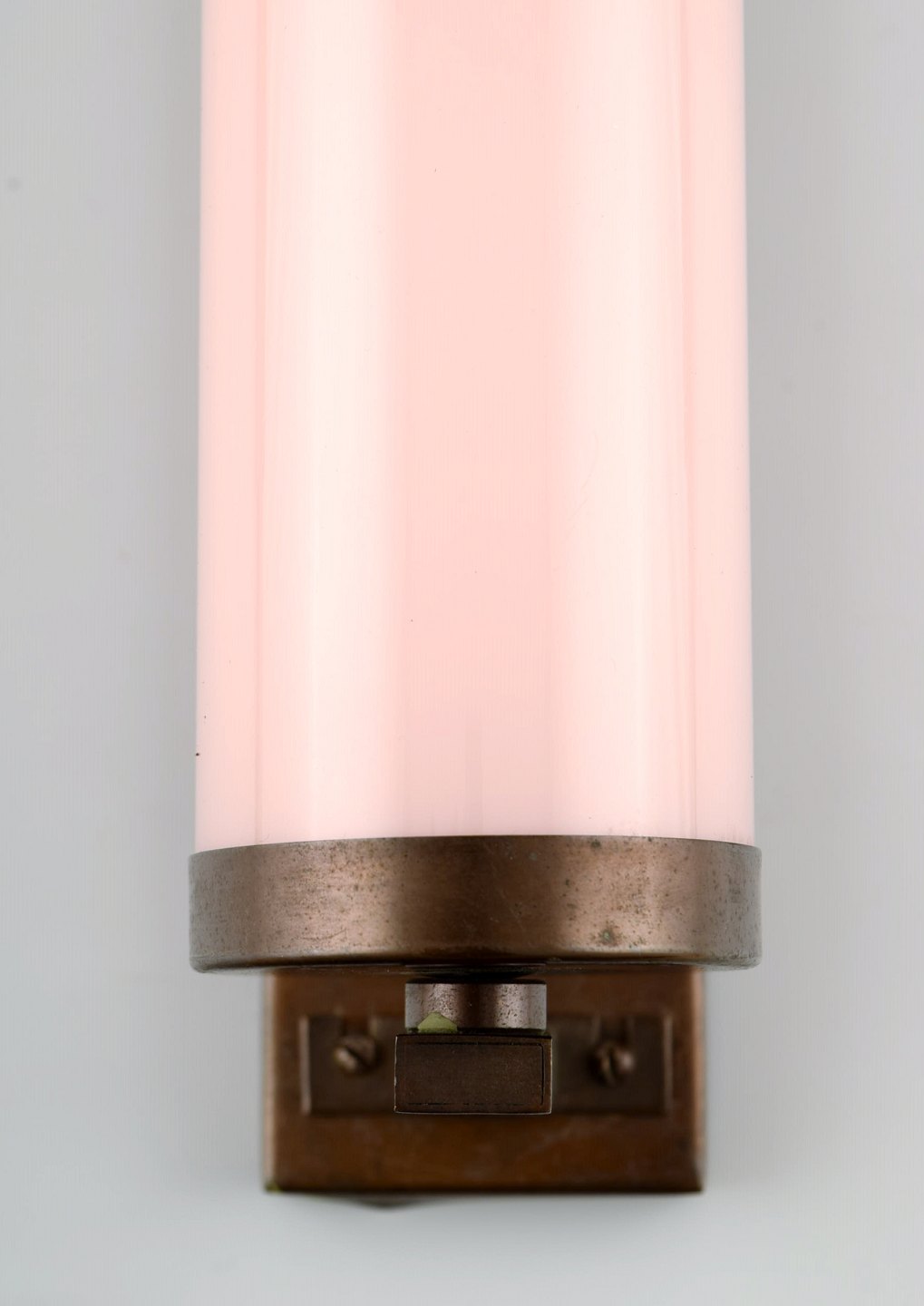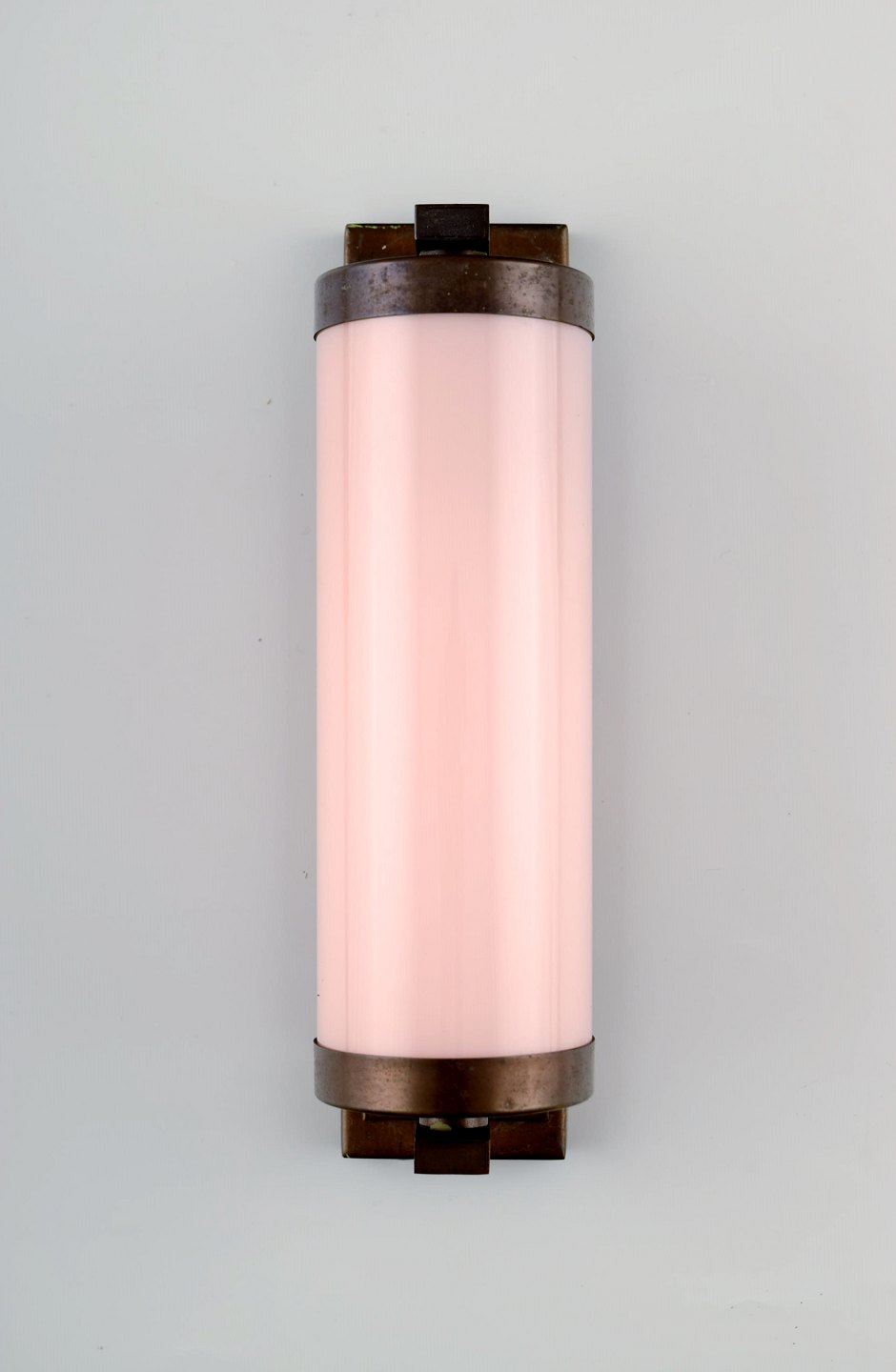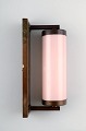 Scandinavian designer, a pair of Art Deco wall lamps in brass with pink glass shades. Measures: 22 cm. x 7 cm. Unstamped. In fine original condition.