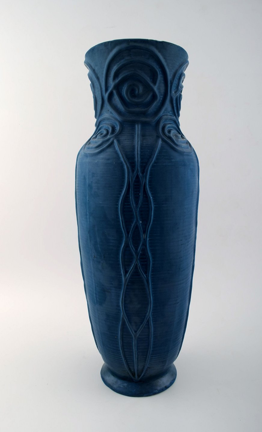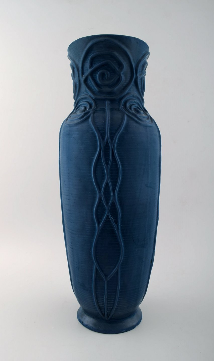 Stor Höganäs Art Nouveau keramikgulvvase. Blomster i relief. Smuk mørkeblå glasur. Stemplet, ca. 1910. 42 cm. x 16 cm. I perfekt stand.