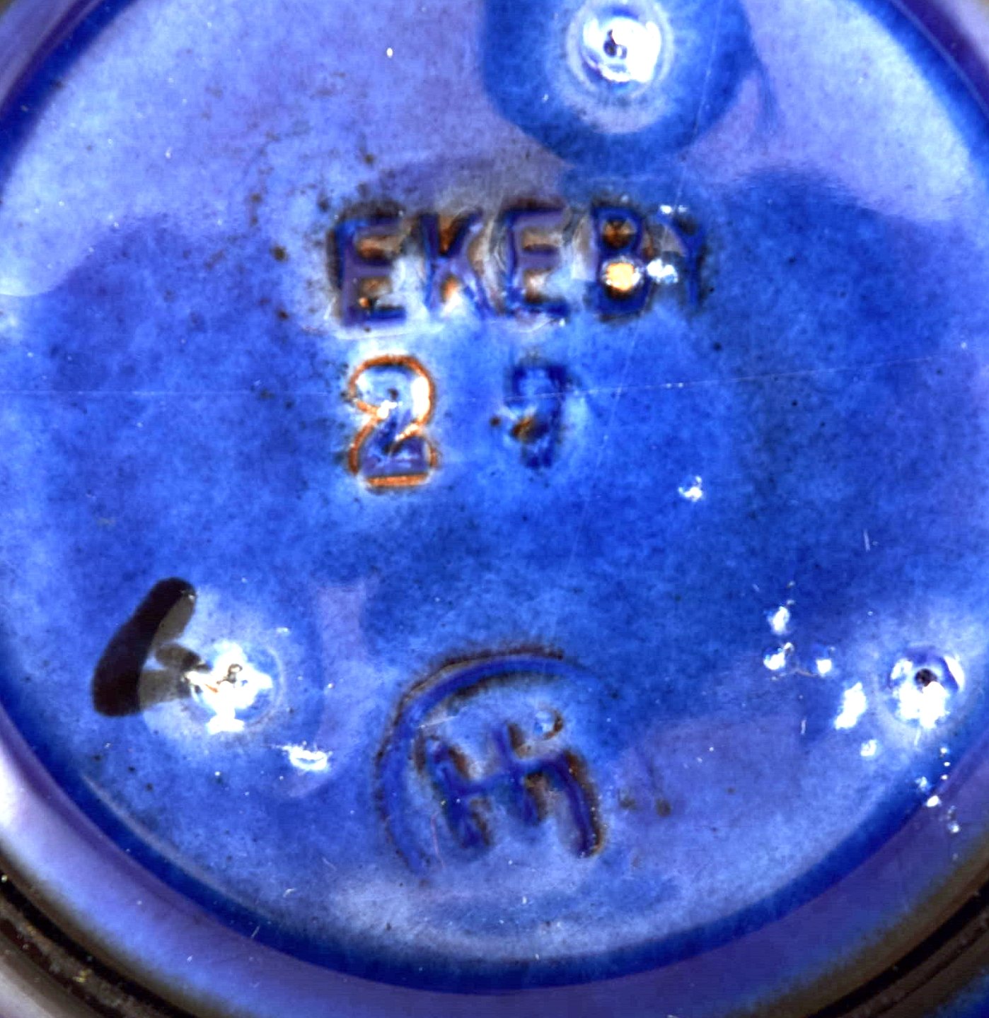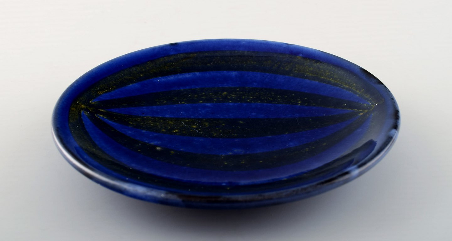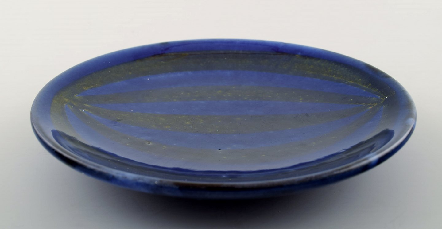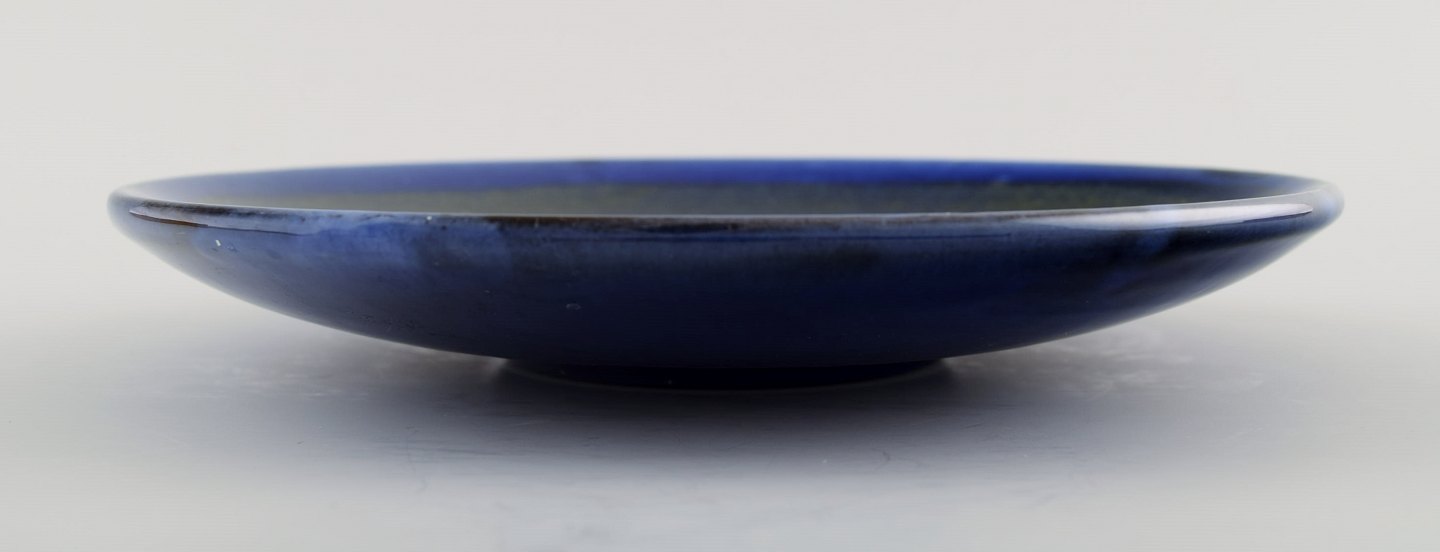 Upsala-Ekeby keramik fad. Glasur i blå og sorte nuancer. Sverige, 1950´erne. I perfekt stand. Måler 19 cm. Stemplet.
