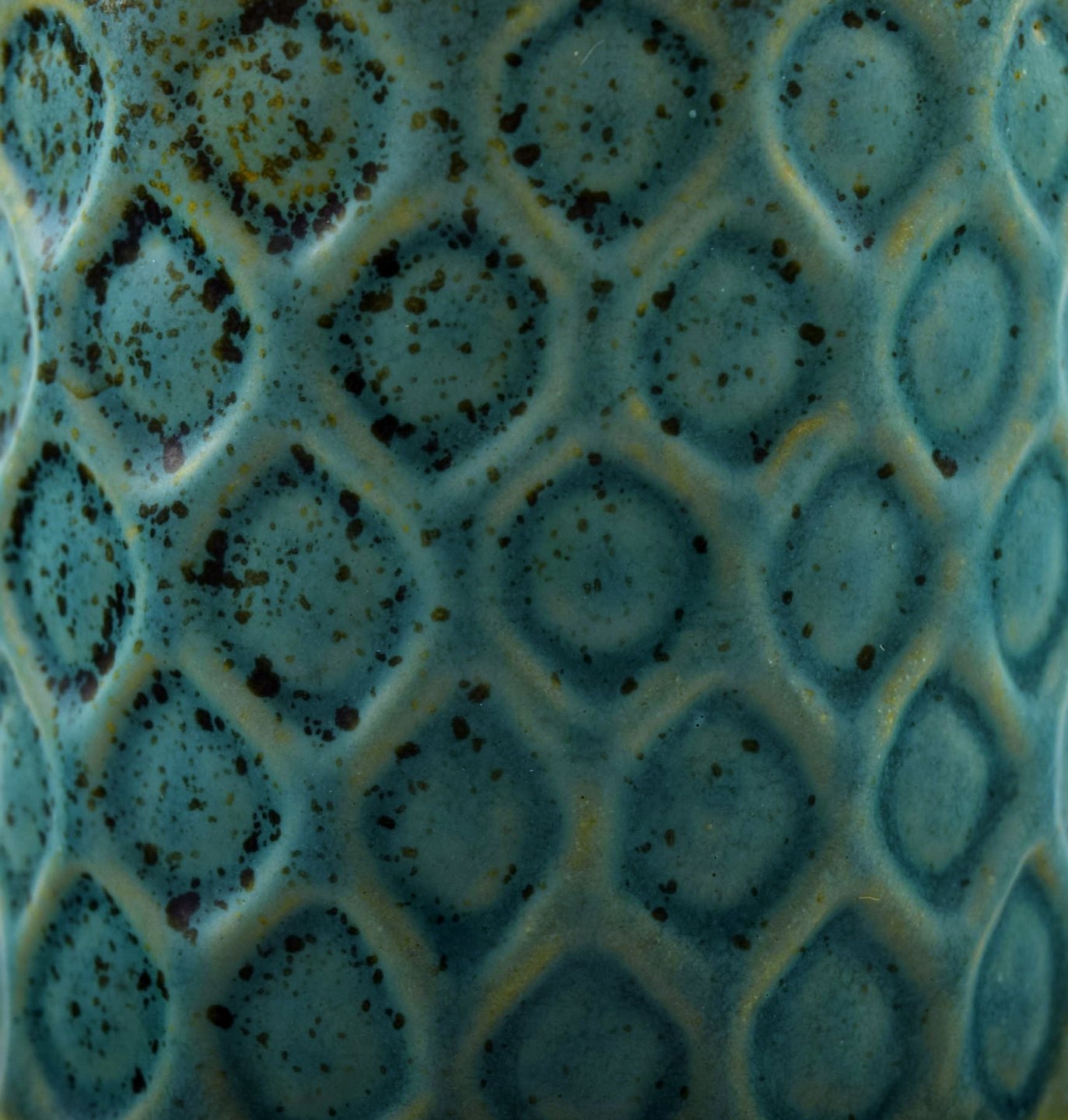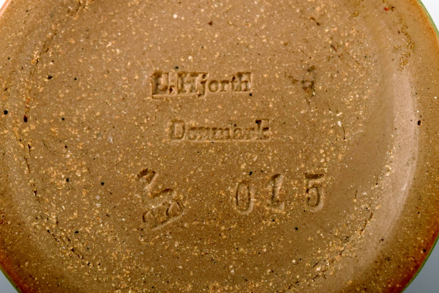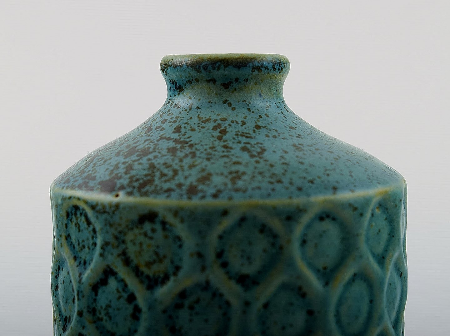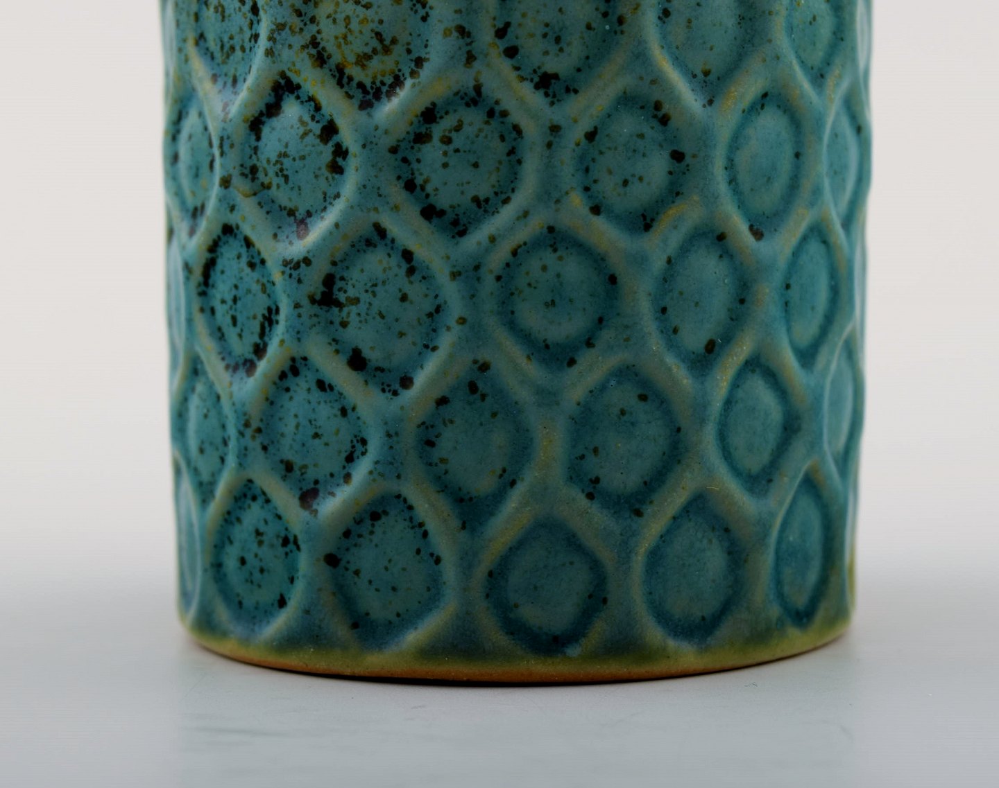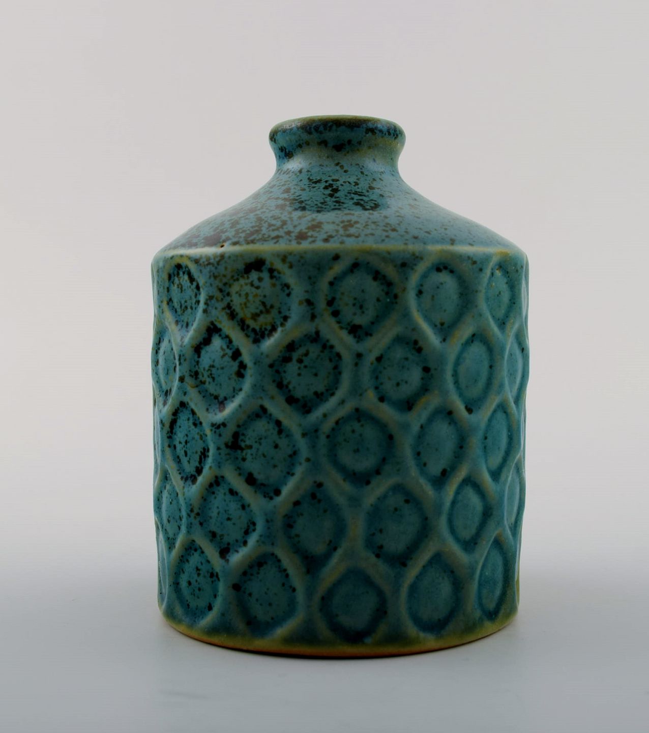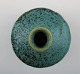 Hjorth (Bornholm) glaseret stentøjsvase i moderne design. Fin turkis glasur. Måler: 9 cm. høj. 7 cm. bred. Signeret Hjorth. I perfekt stand.