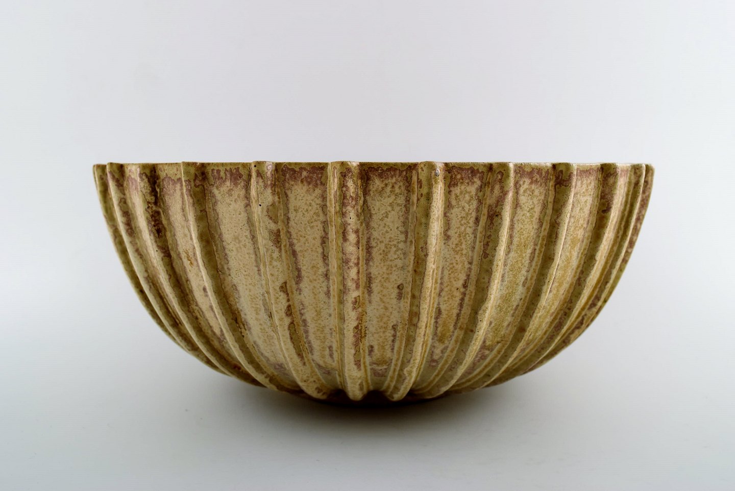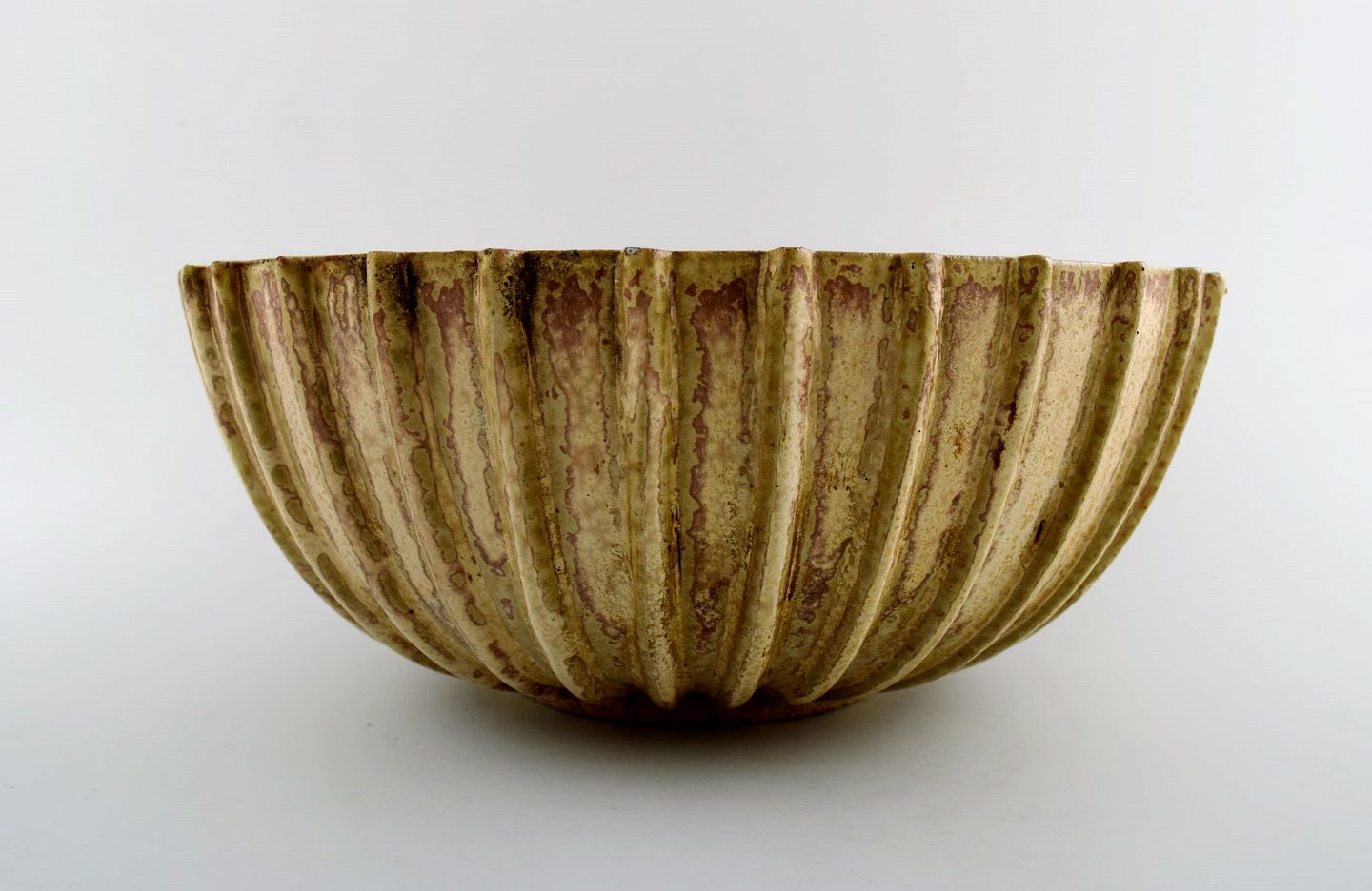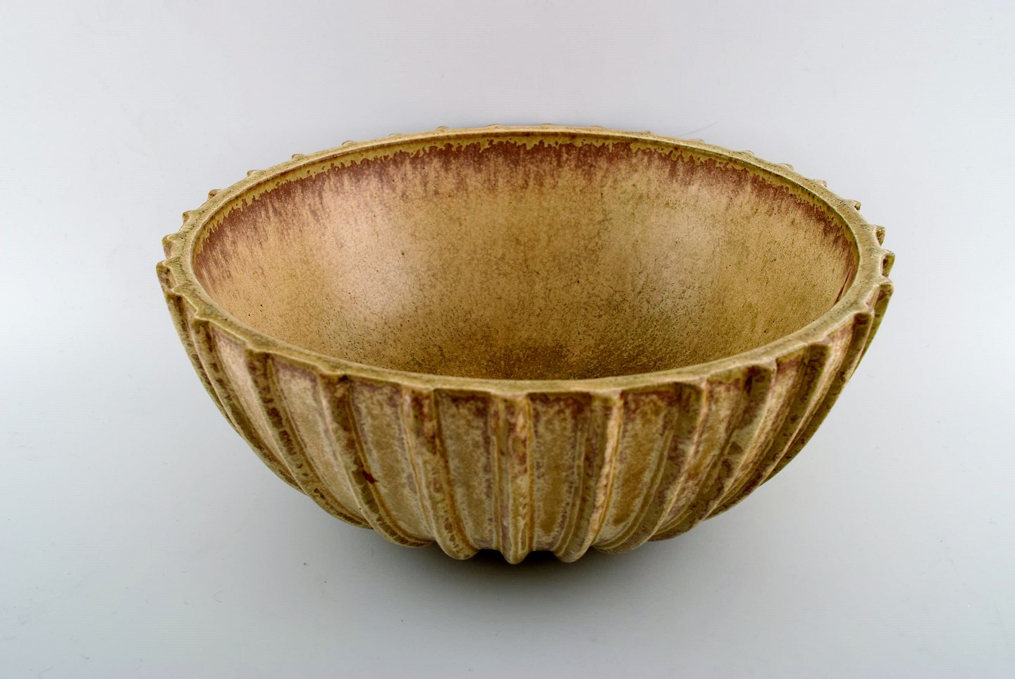 Arne Bang. Stoneware bowl with fluted corpus decorated with brown / ocher speckled glaze.