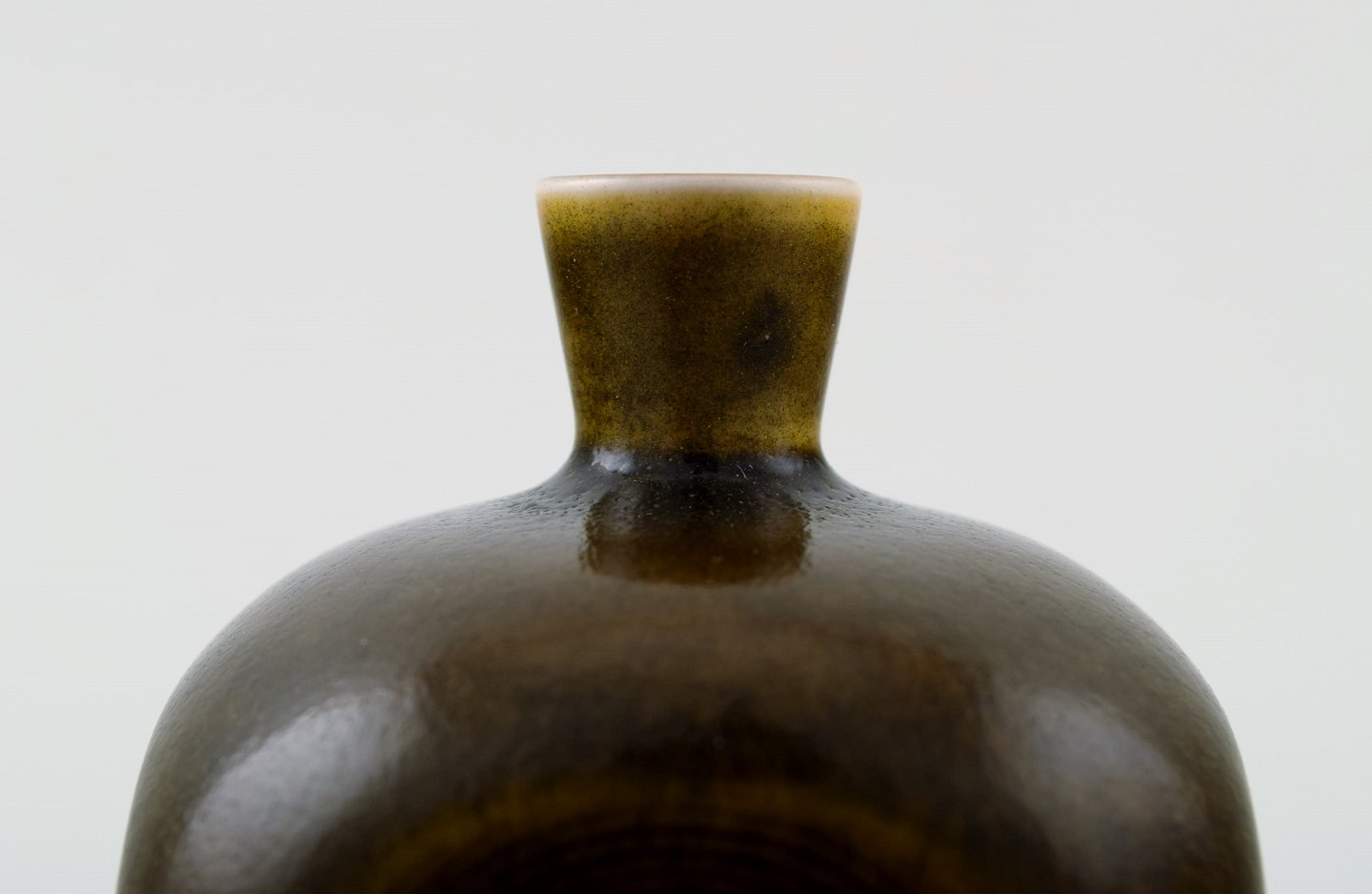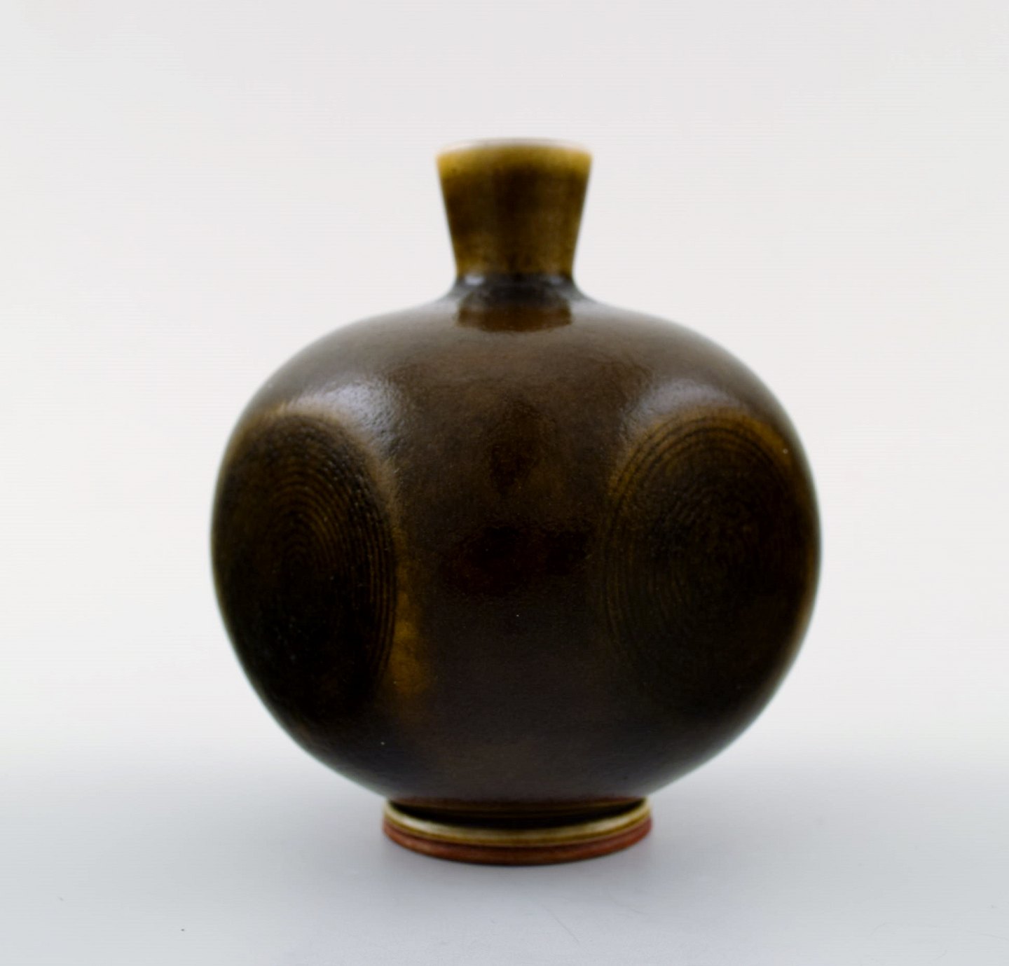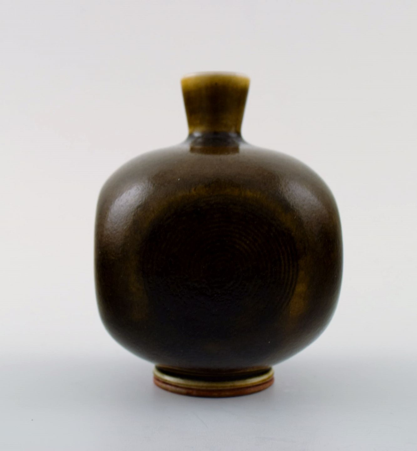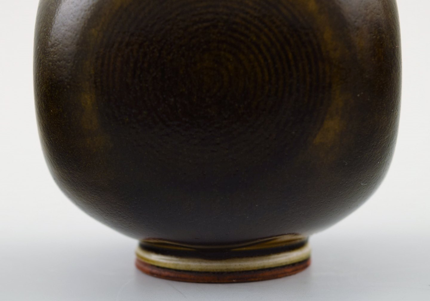 Berndt Friberg Studio keramikvase. Moderne svensk design. Unika, håndlavet. Fantastisk glasur i brune og gule toner. Perfekt stand. 1. sortering. Måler: 9 cm. x 7 cm.