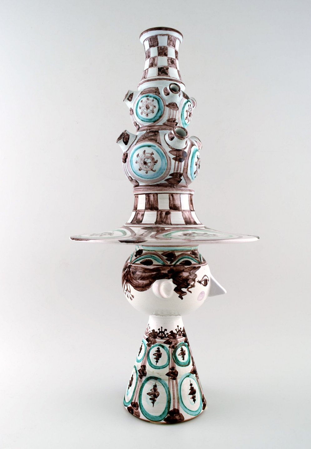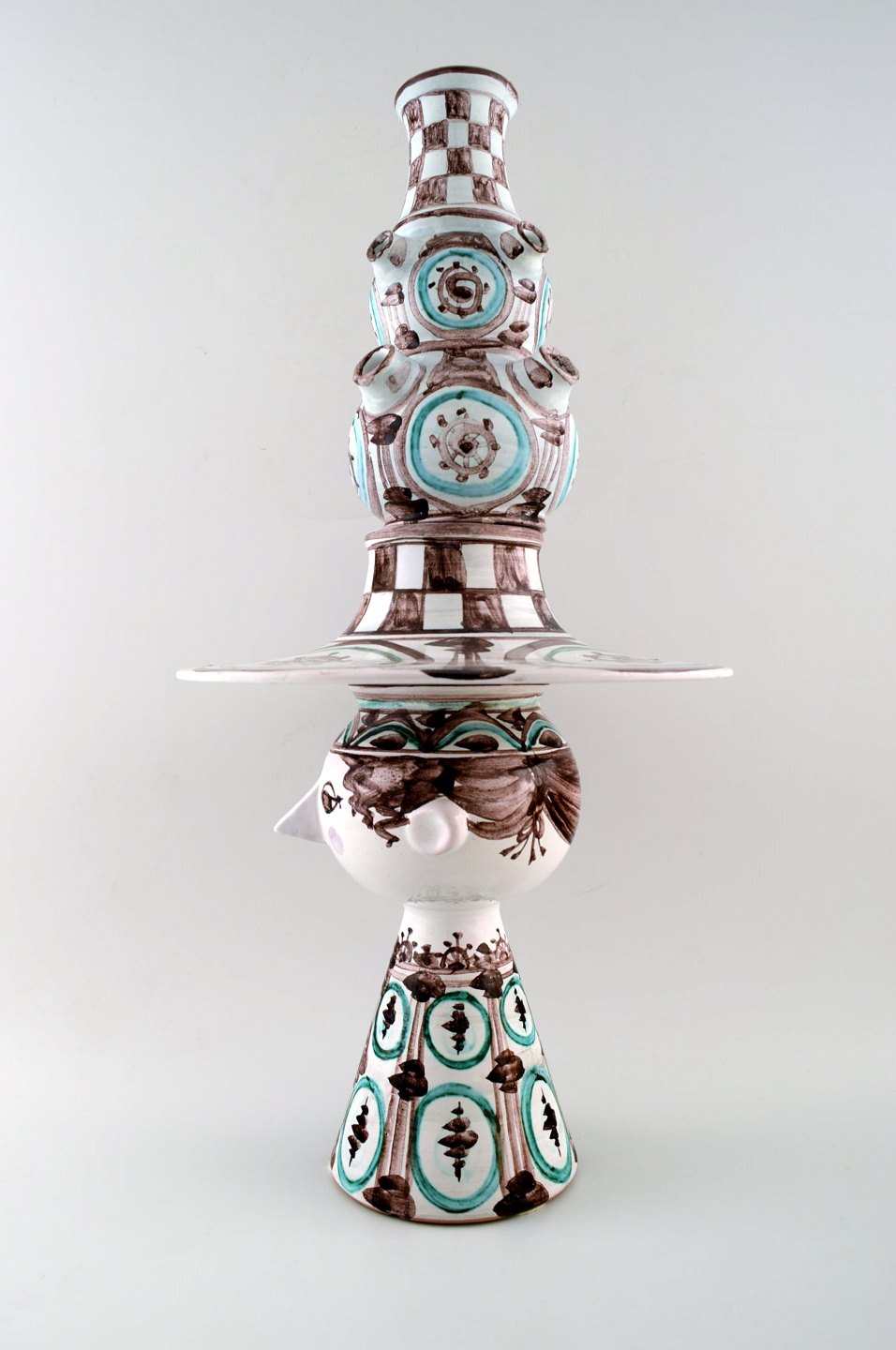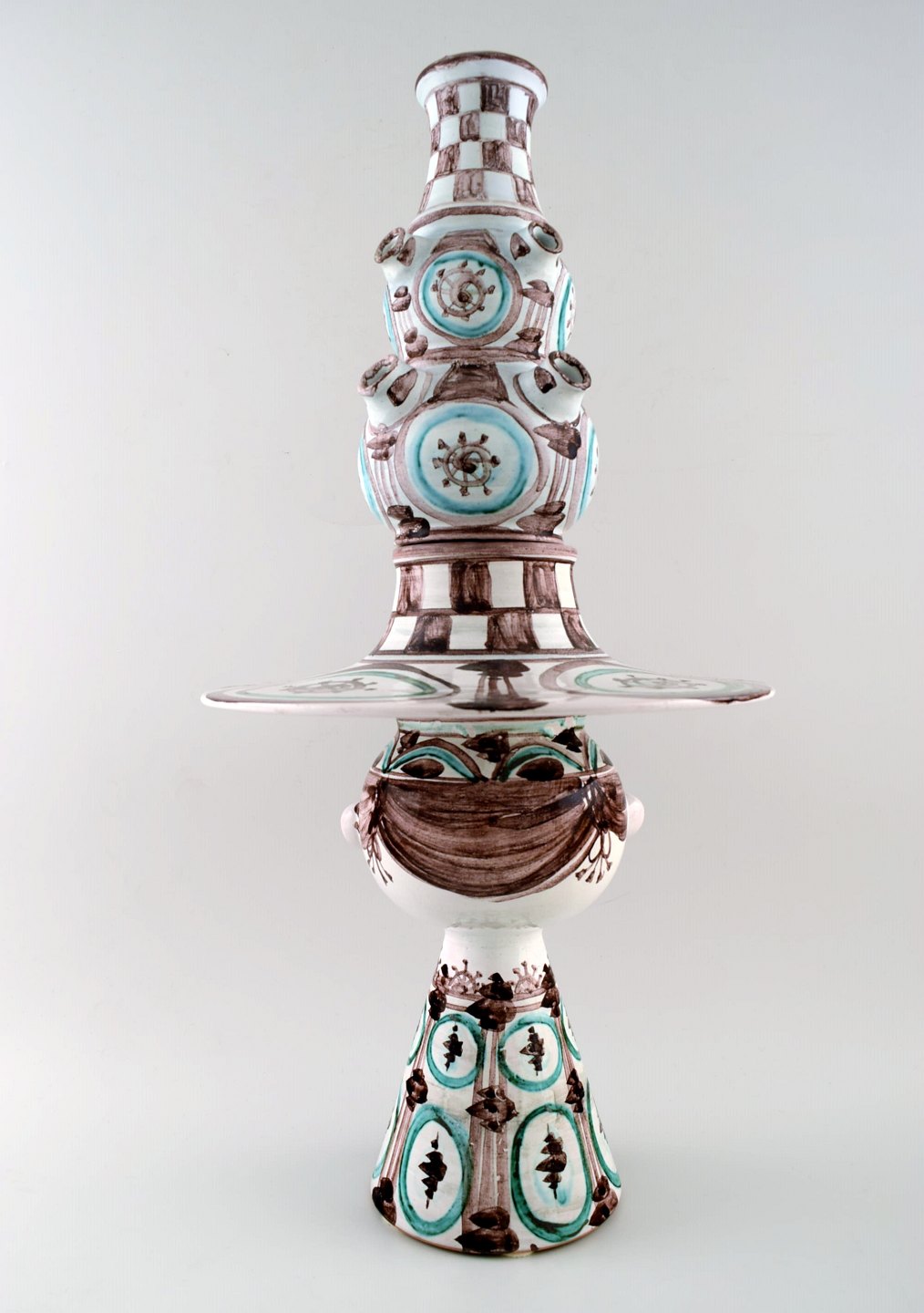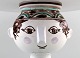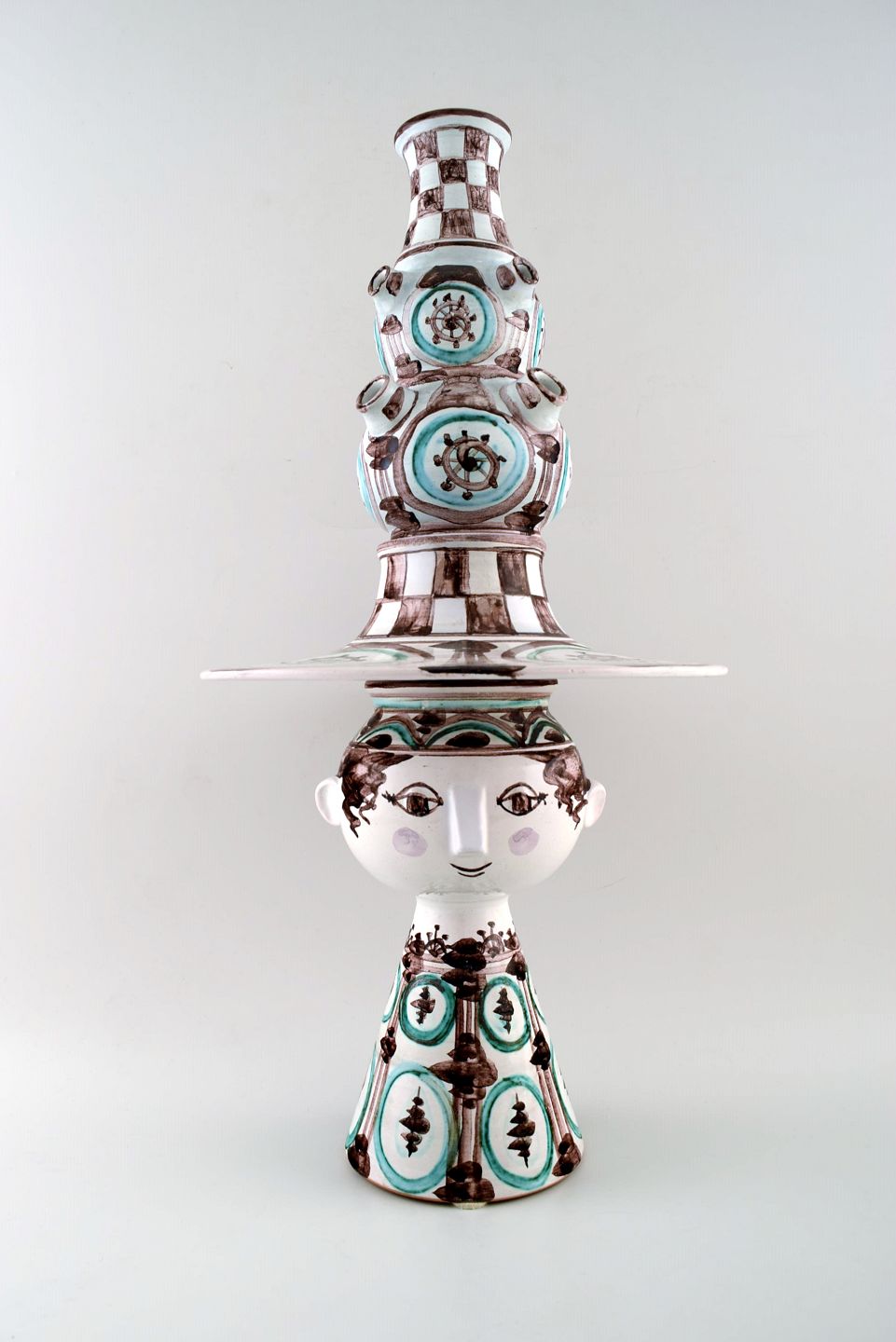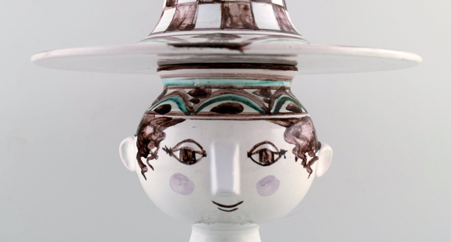 Bjørn Wiinblad : Tre-delt vase hånddekoreret i grønt og brunt lertøj, kvinde med hat.