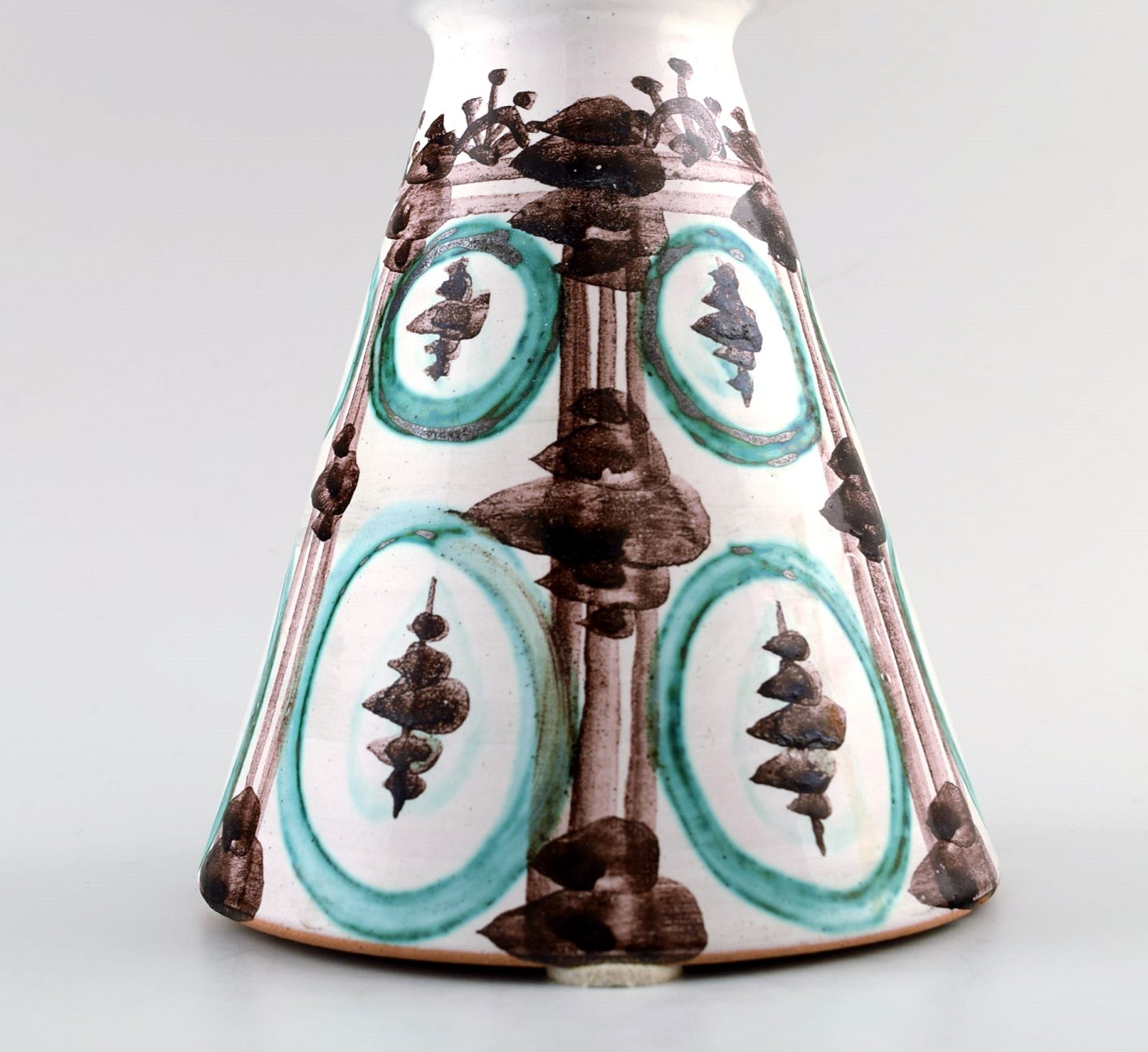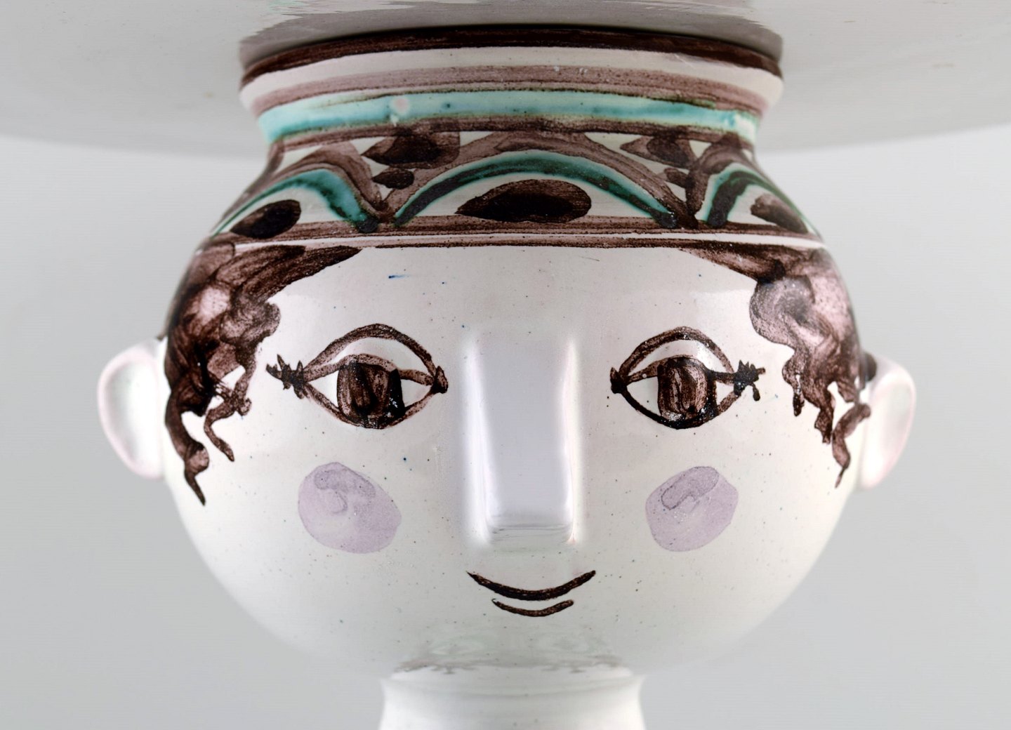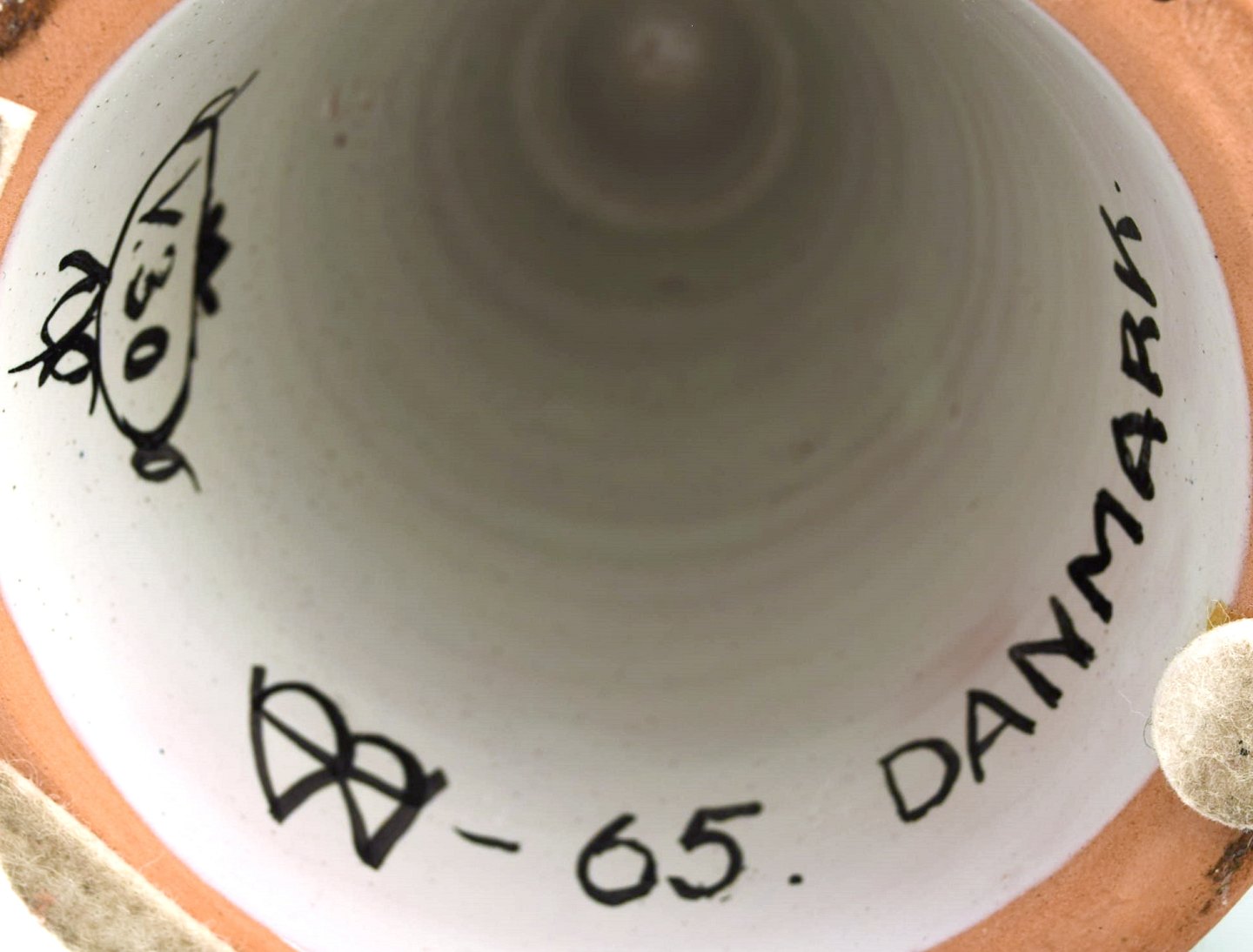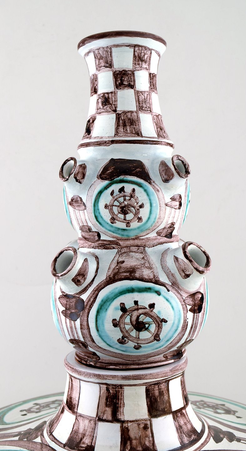 Bjørn Wiinblad : Tre-delt vase hånddekoreret i grønt og brunt lertøj, kvinde med hat.