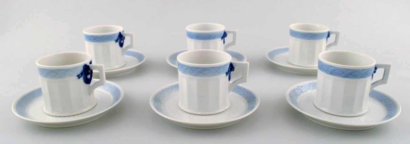 6 sets of Royal Copenhagen Blue Fan pattern Coffee cup and saucer no. 11548. 2 x 6 p. sets on stock. Height 6 cm. 1st. factory quality. Perfect condition.