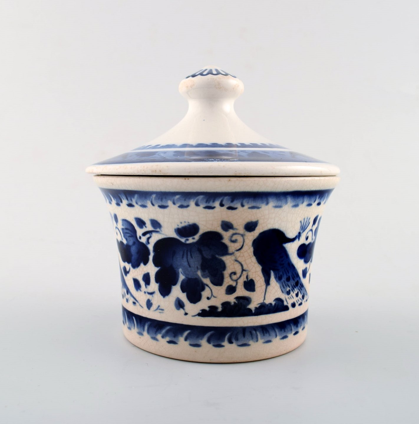 Peacock from Copenhagen faience / Aluminia. Sugar bowl in faience. We have many parts in stock. Measures: 11.5 cm. x 12.5 cm. In very good condition.