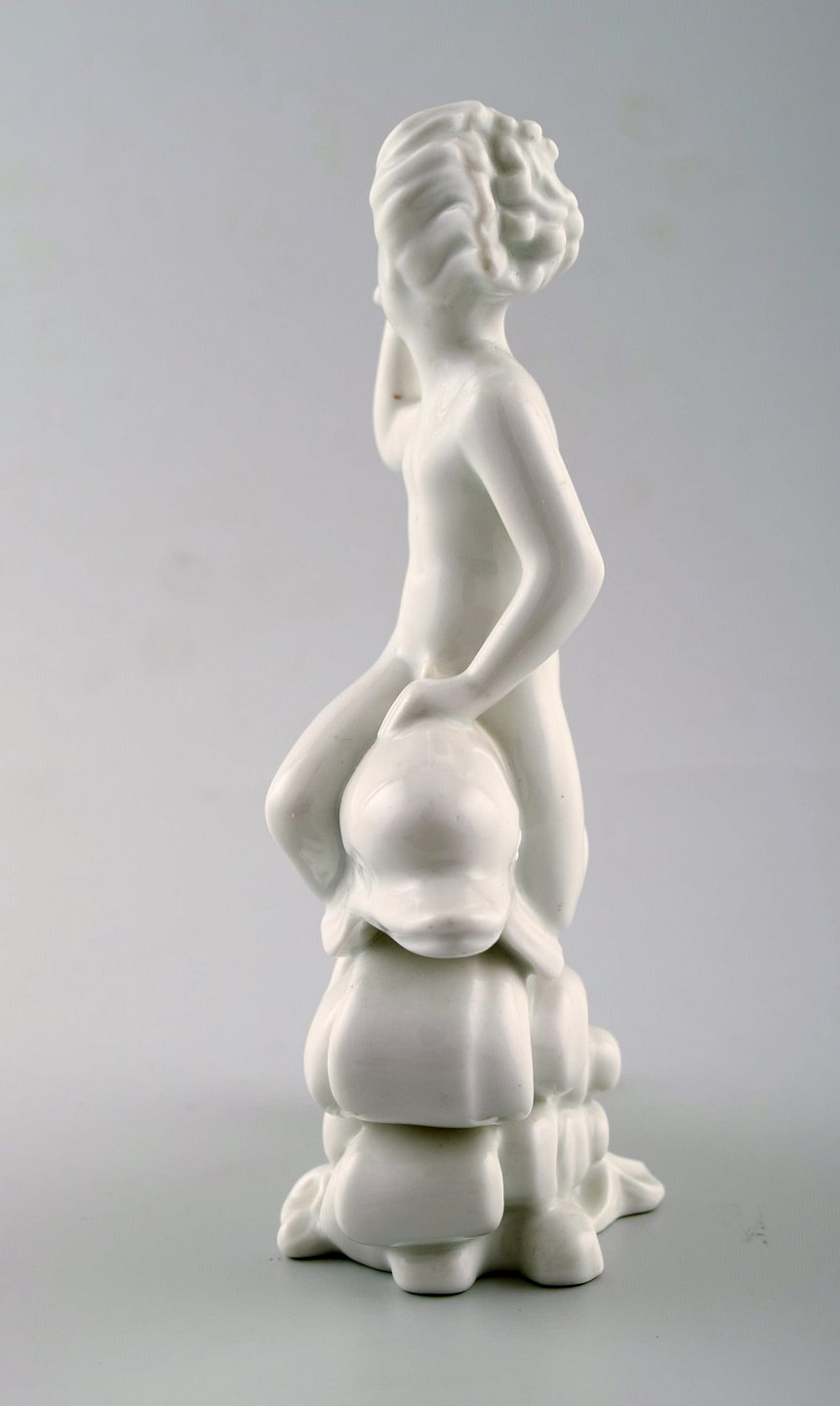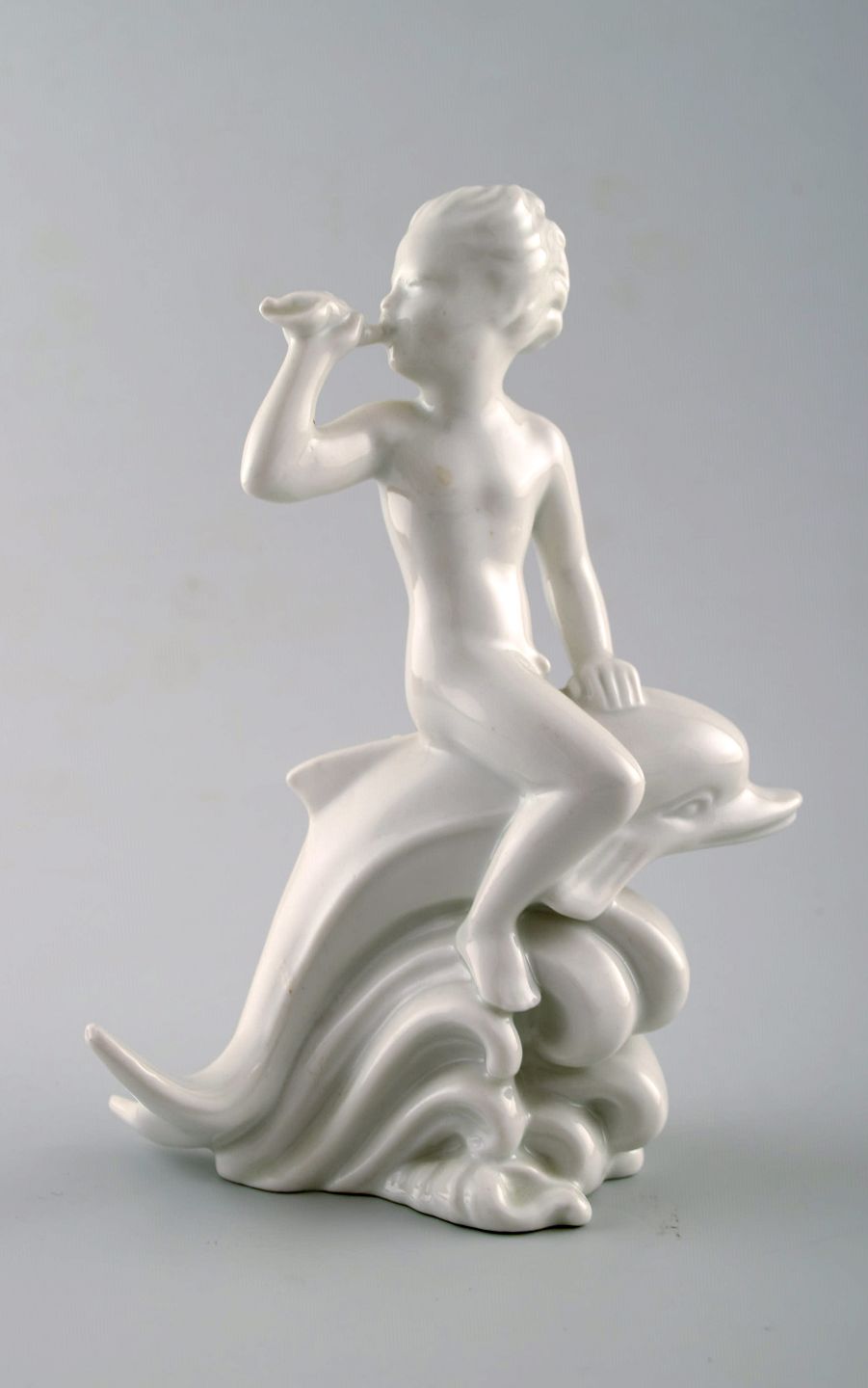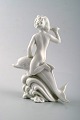 Harald Salomon for Rörstrand, blanc de chine/hvidglaseret figur forestillende faun/panfigur ridende på delfin.