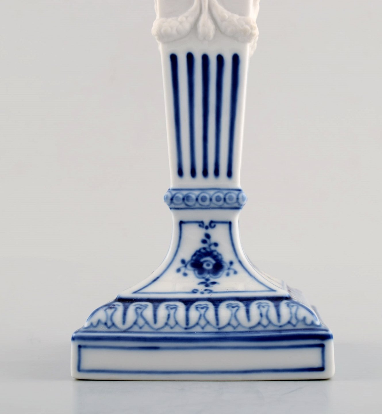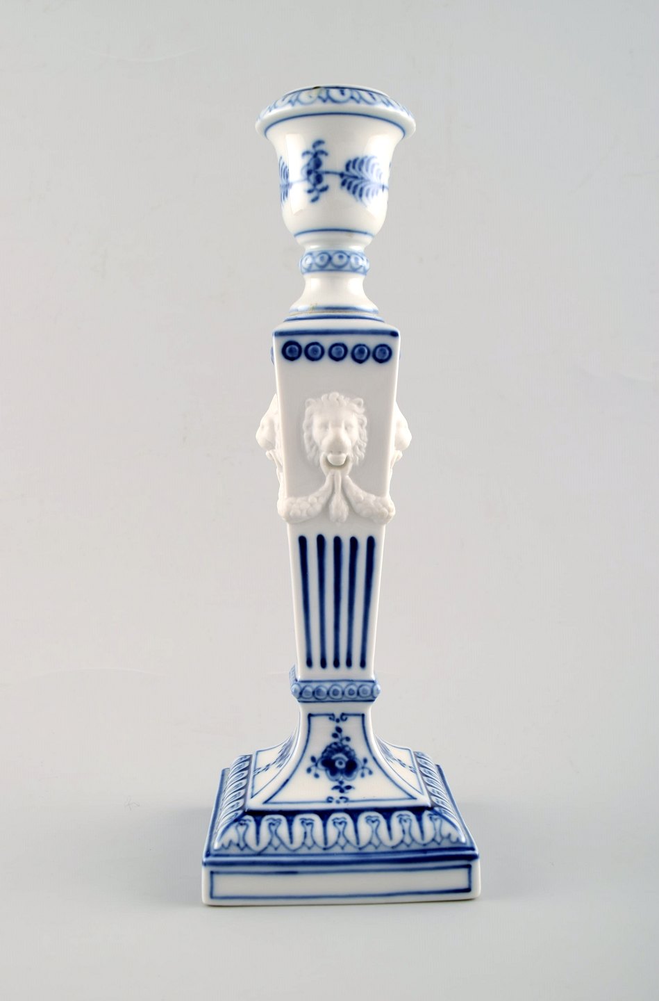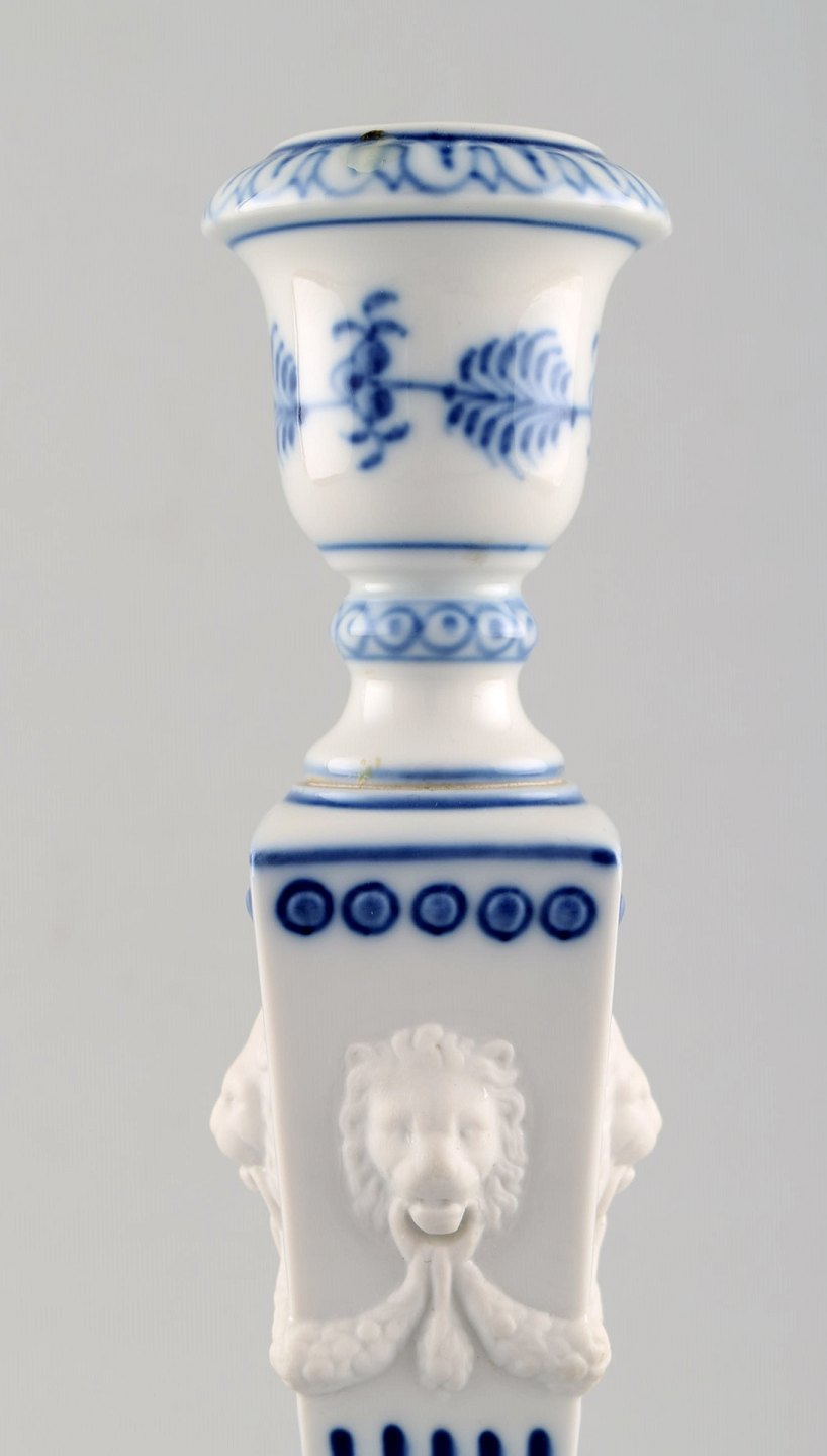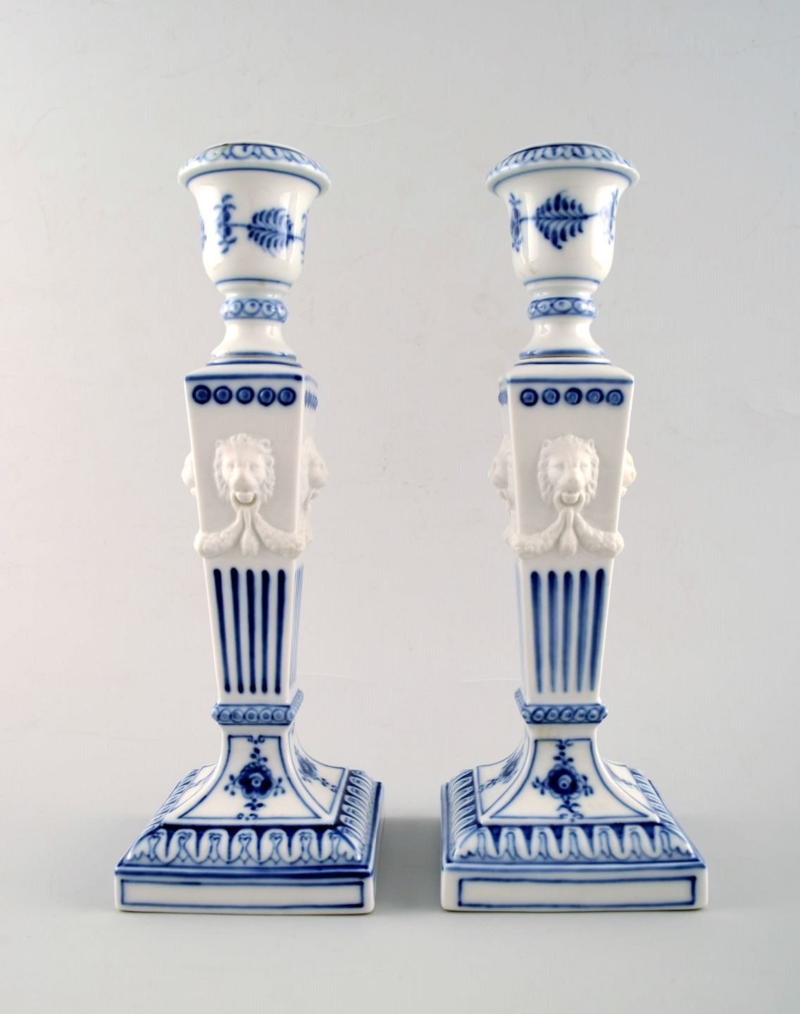 A pair of Royal Copenhagen Blue Fluted plain, candlesticks with lion heads.