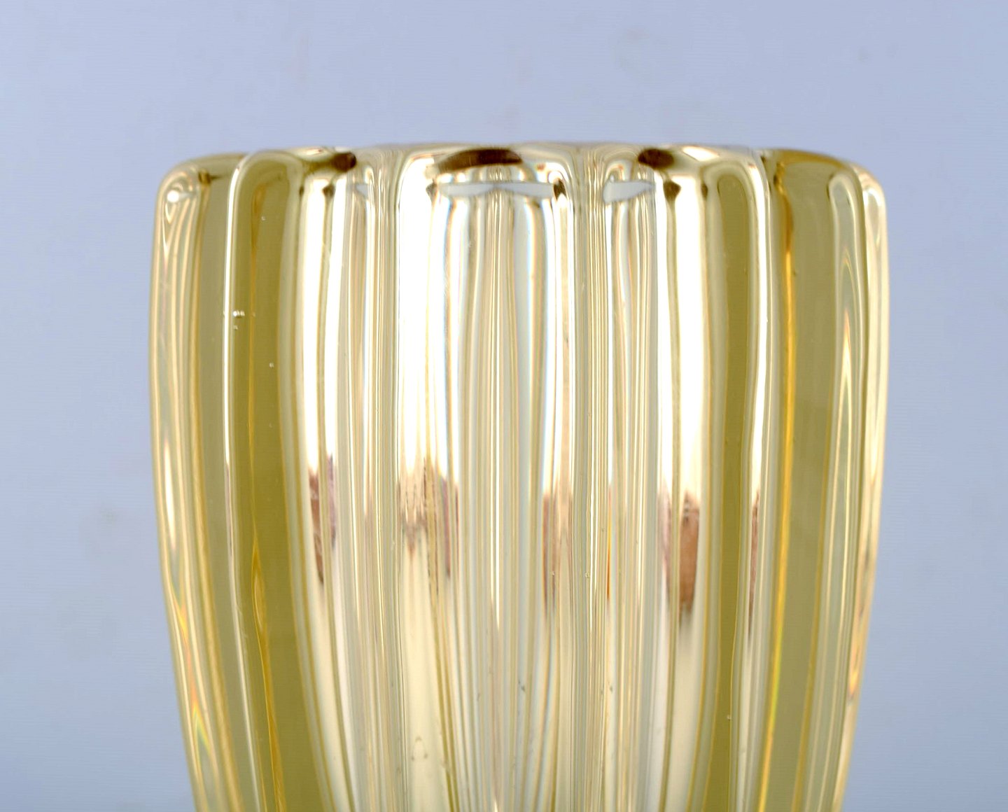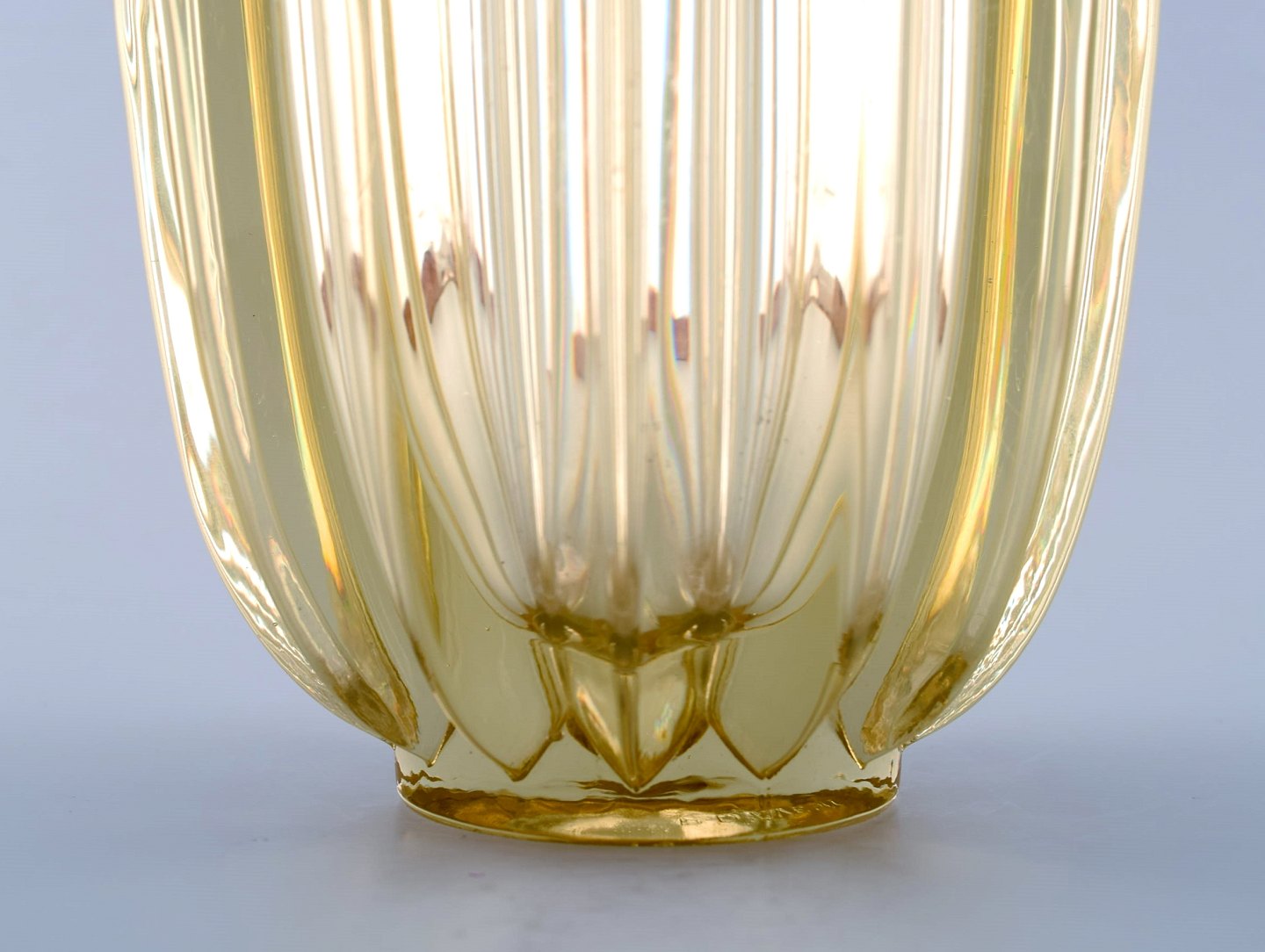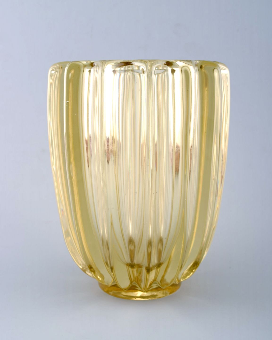 Pierre D'avesn, French Art Deco glass vase in ribbed design, smoky. Stamped, 1940s / 50s. Measures: 17.5 x 13 cm. In perfect condition.