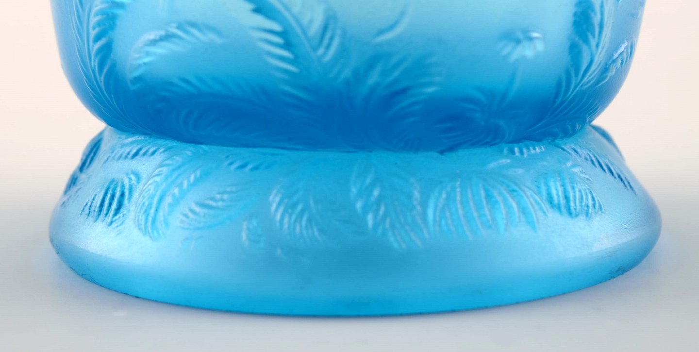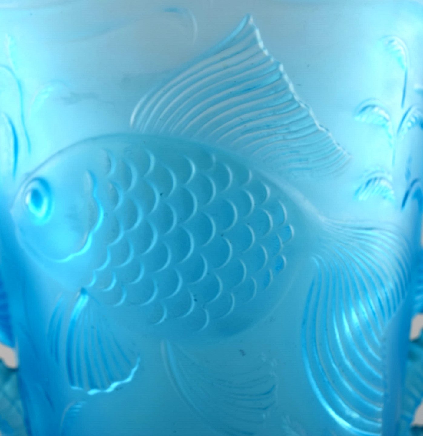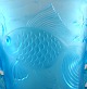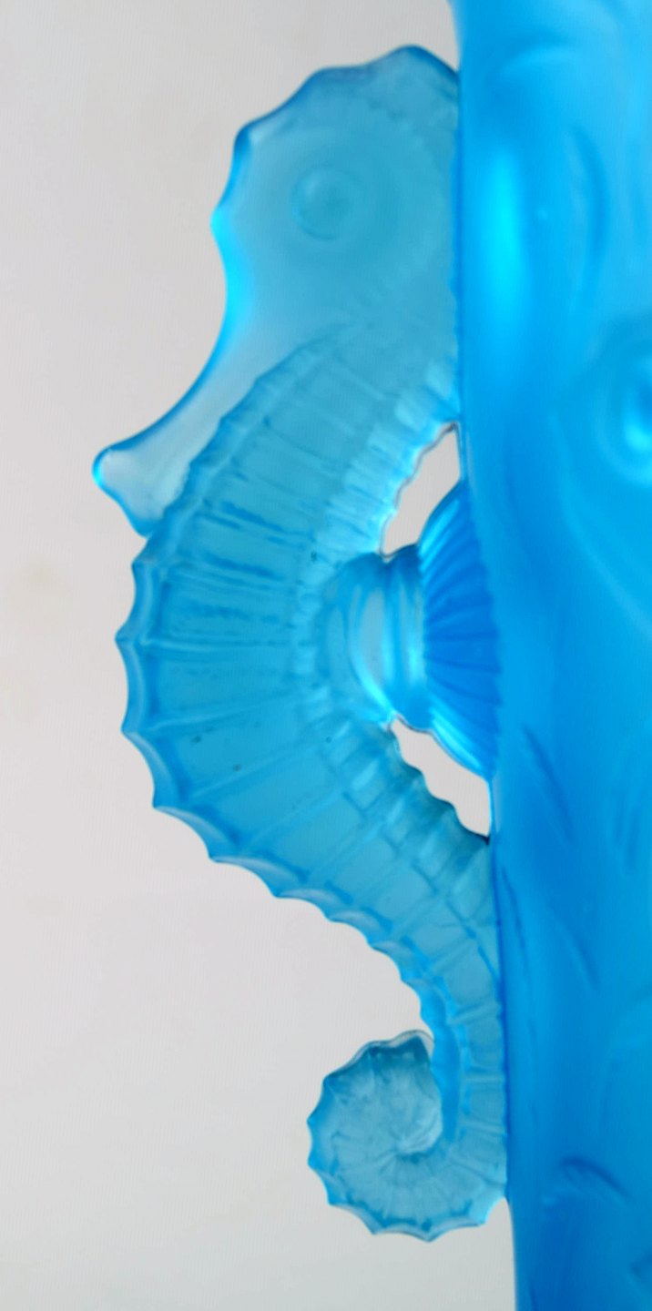 Lalique stil kunstglas vase i turkis med søheste i relief. Usigneret. Ca. 1950´erne. Størrelse: 17,5 cm. høj. 13,5 cm. i diameter. I perfekt stand.