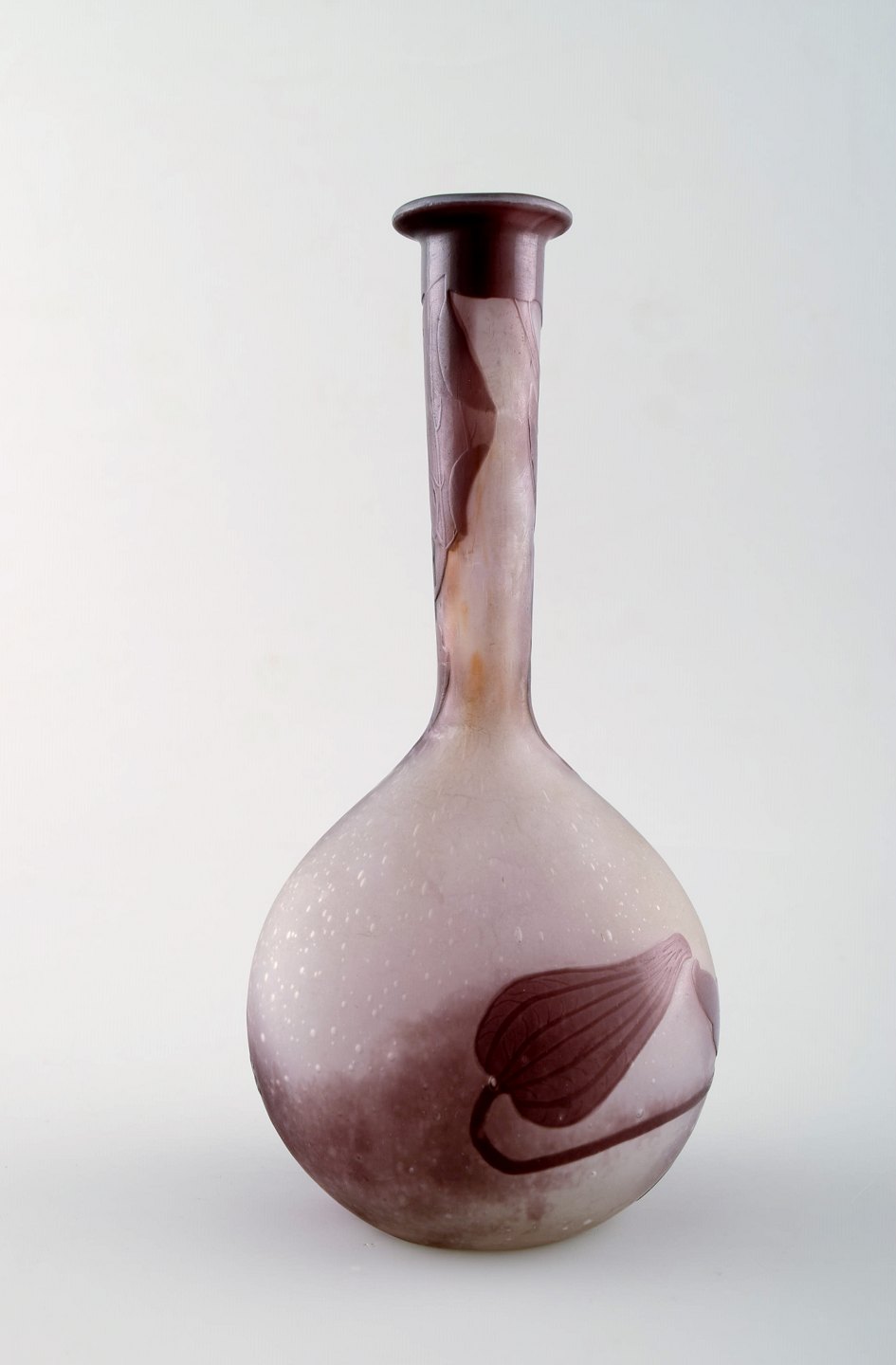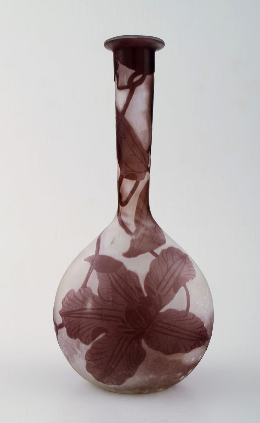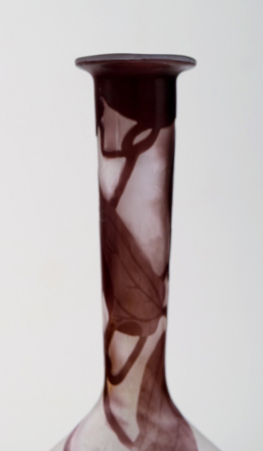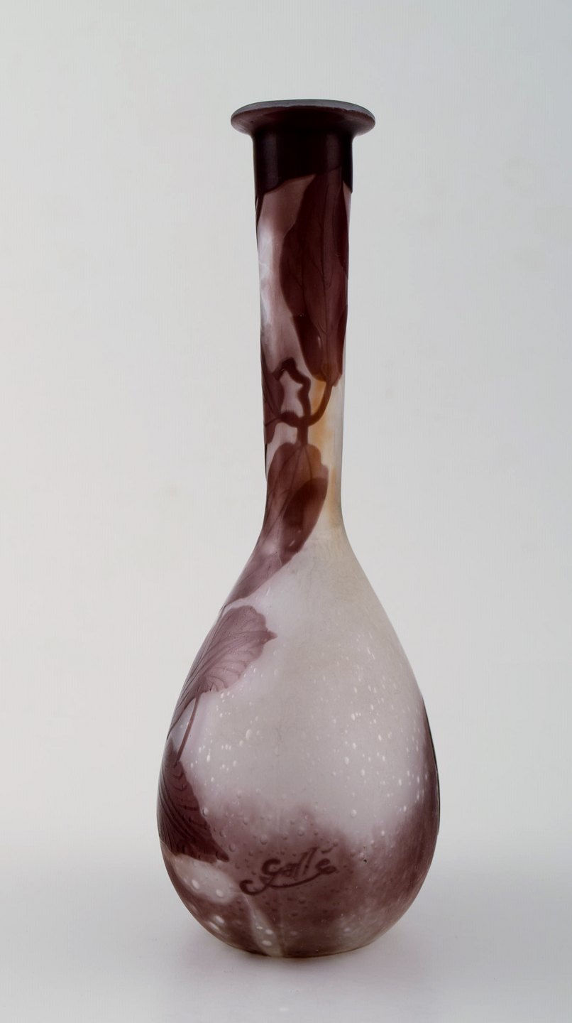 Emile Gallé kunstglasvase, ca. 1910´erne. Dekoreret med violette blomster. Mċler : 17,5 cm. x 9 cm. Signeret. I perfekt stand.