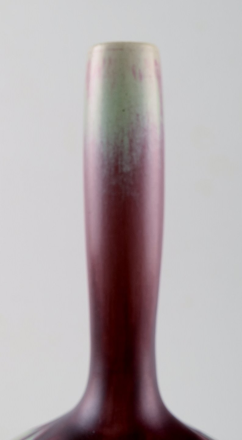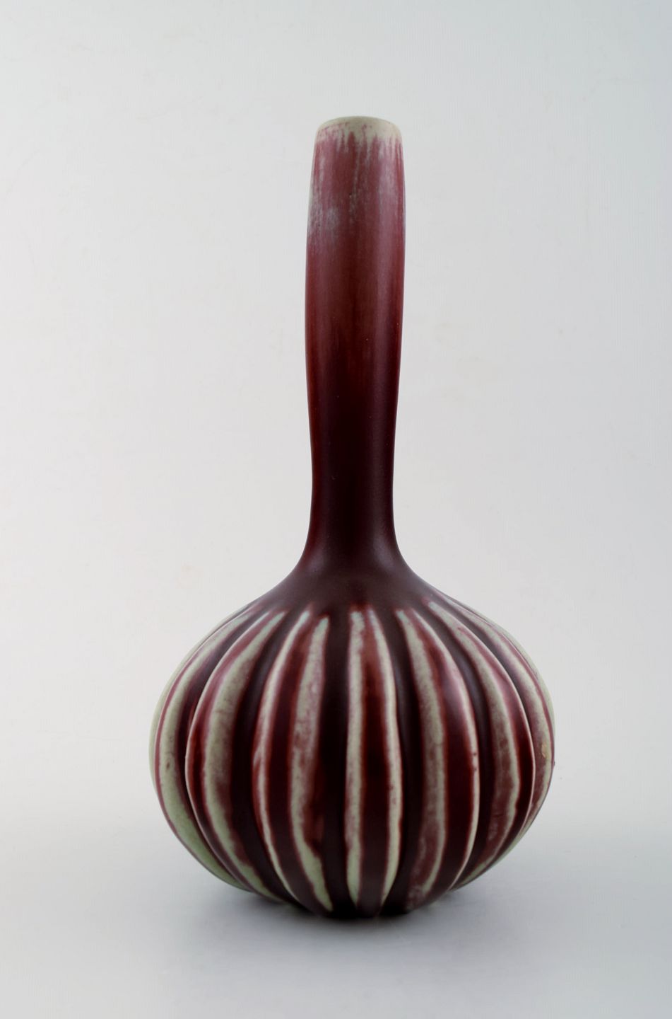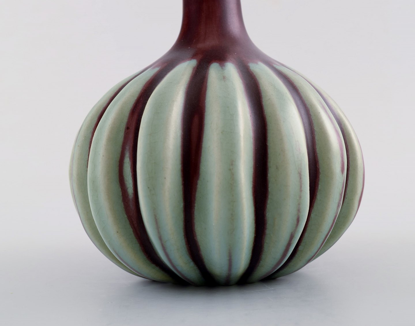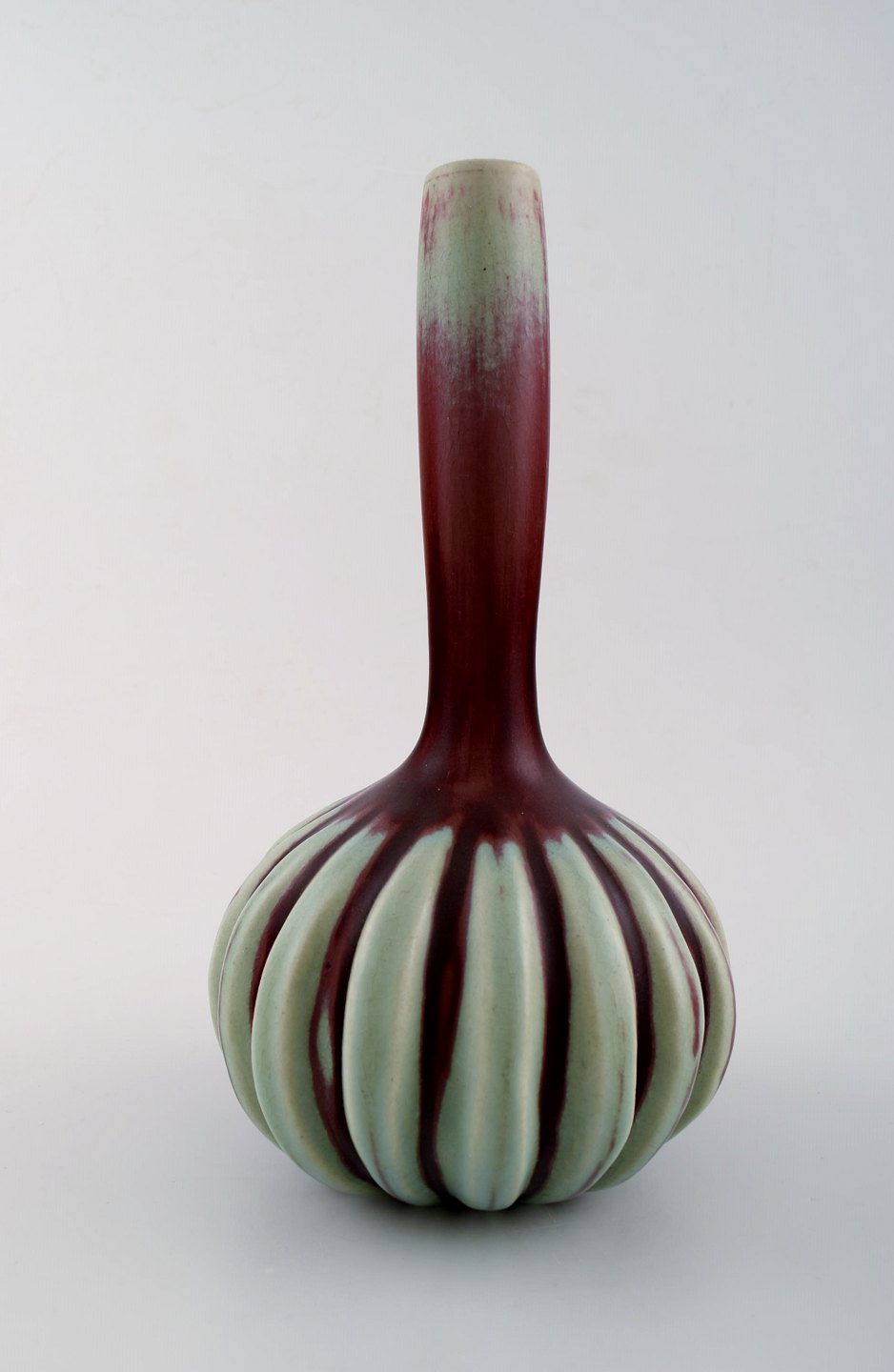 Axel Salto for Royal Copenhagen stoneware vase modelled with narrow mouth and vertical fluted pattern, decorated with oxblood glaze with green elements.