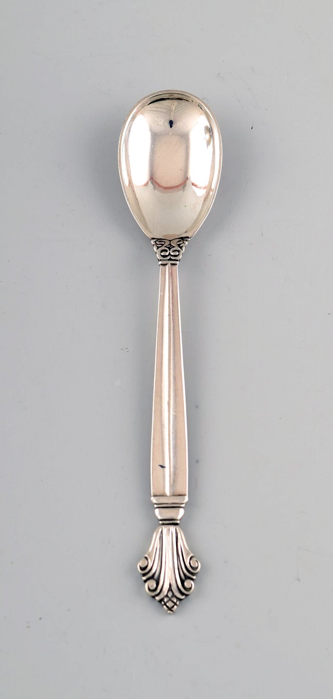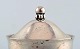 Georg Jensen : Tidlig sennepskrukke af sølv med indsats af facetslebet klart glas, med tilhørende ske.