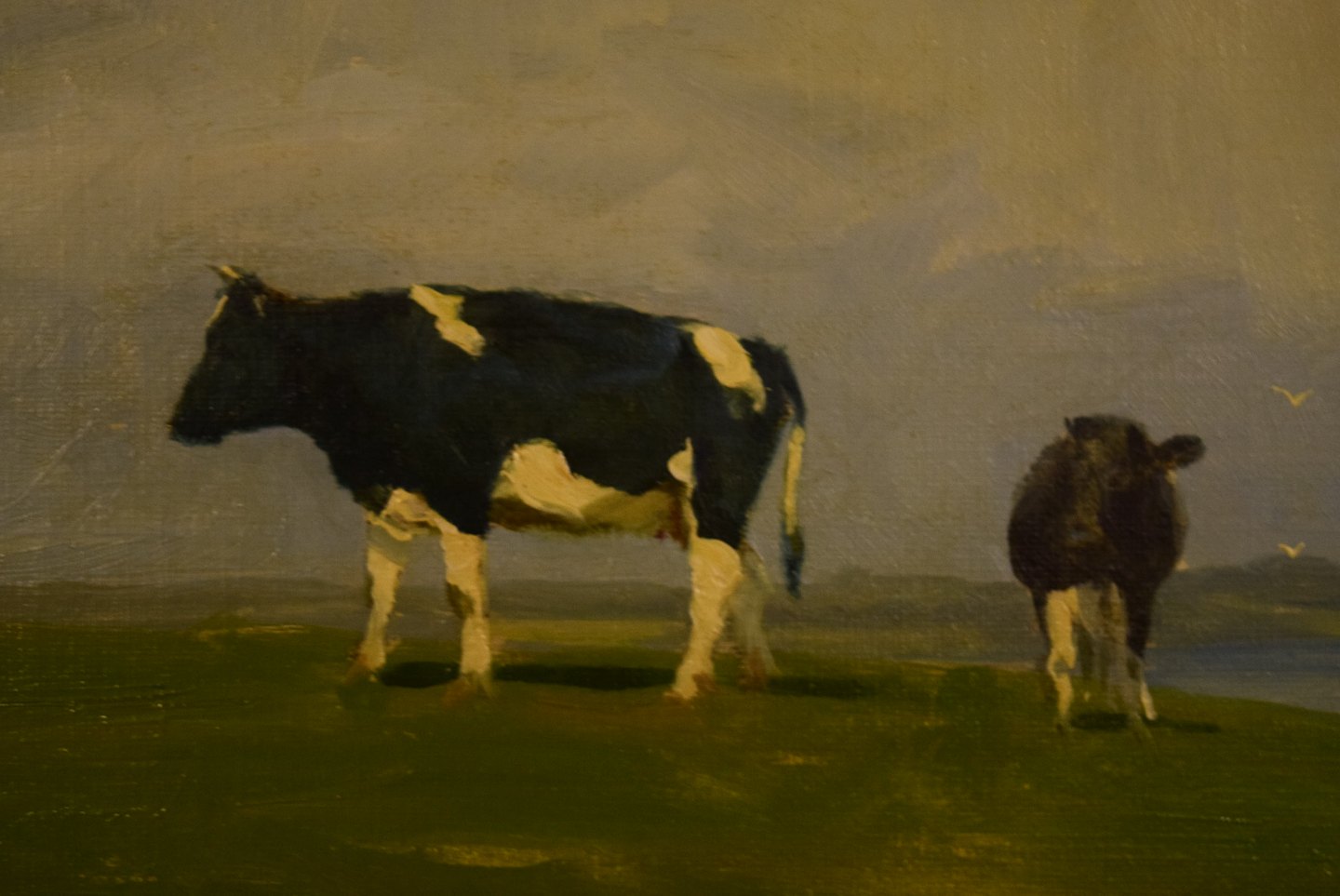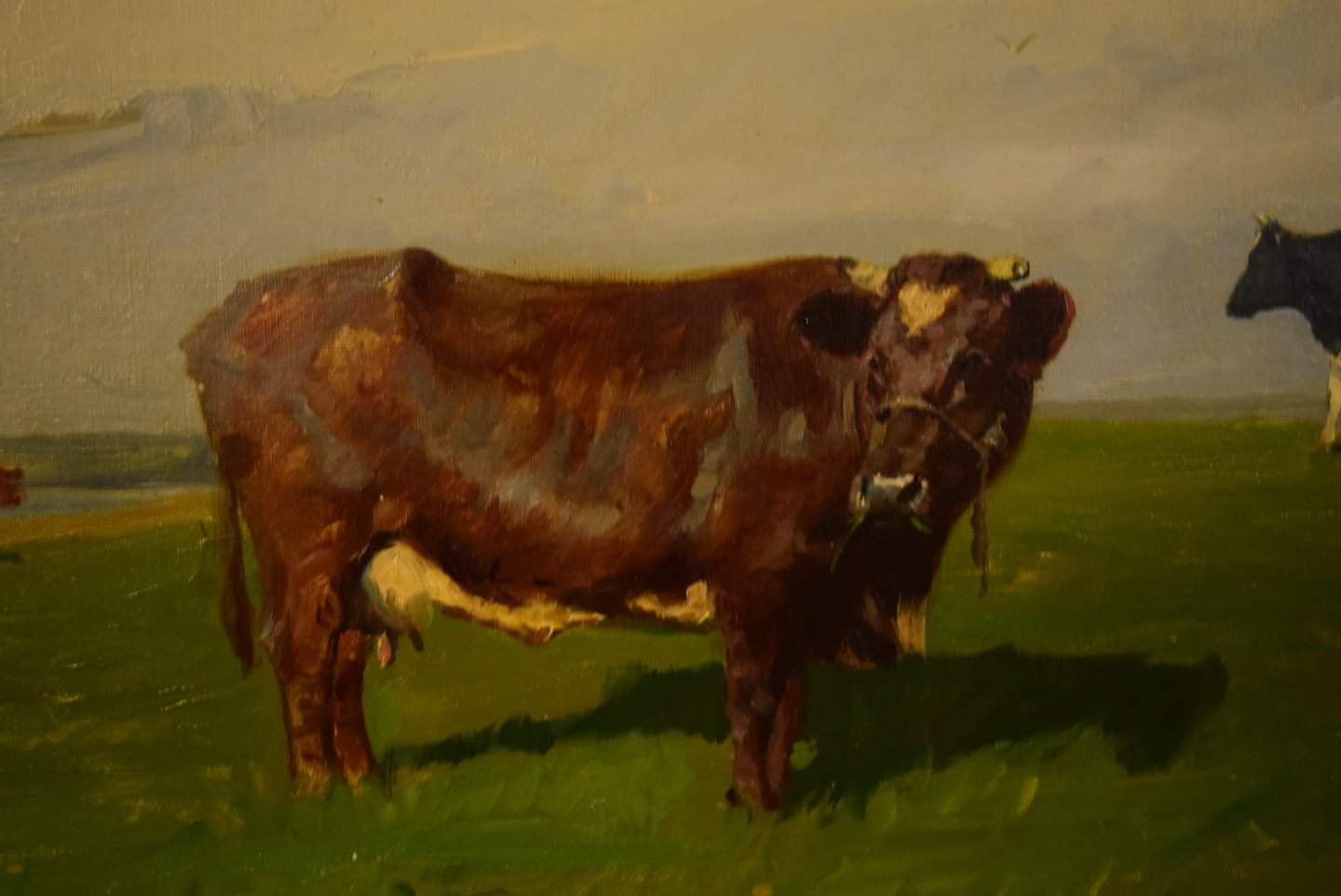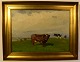 Gunnar Bundgaard (f. Aalborg 1920, d. 2005): Cows on the field. Oil on canvas. Signed: G. Bundgaard. Dated 53. Measures: 64 cm. x 49 cm. The golden frame is 9.5 cm. wide. In perfect condition.