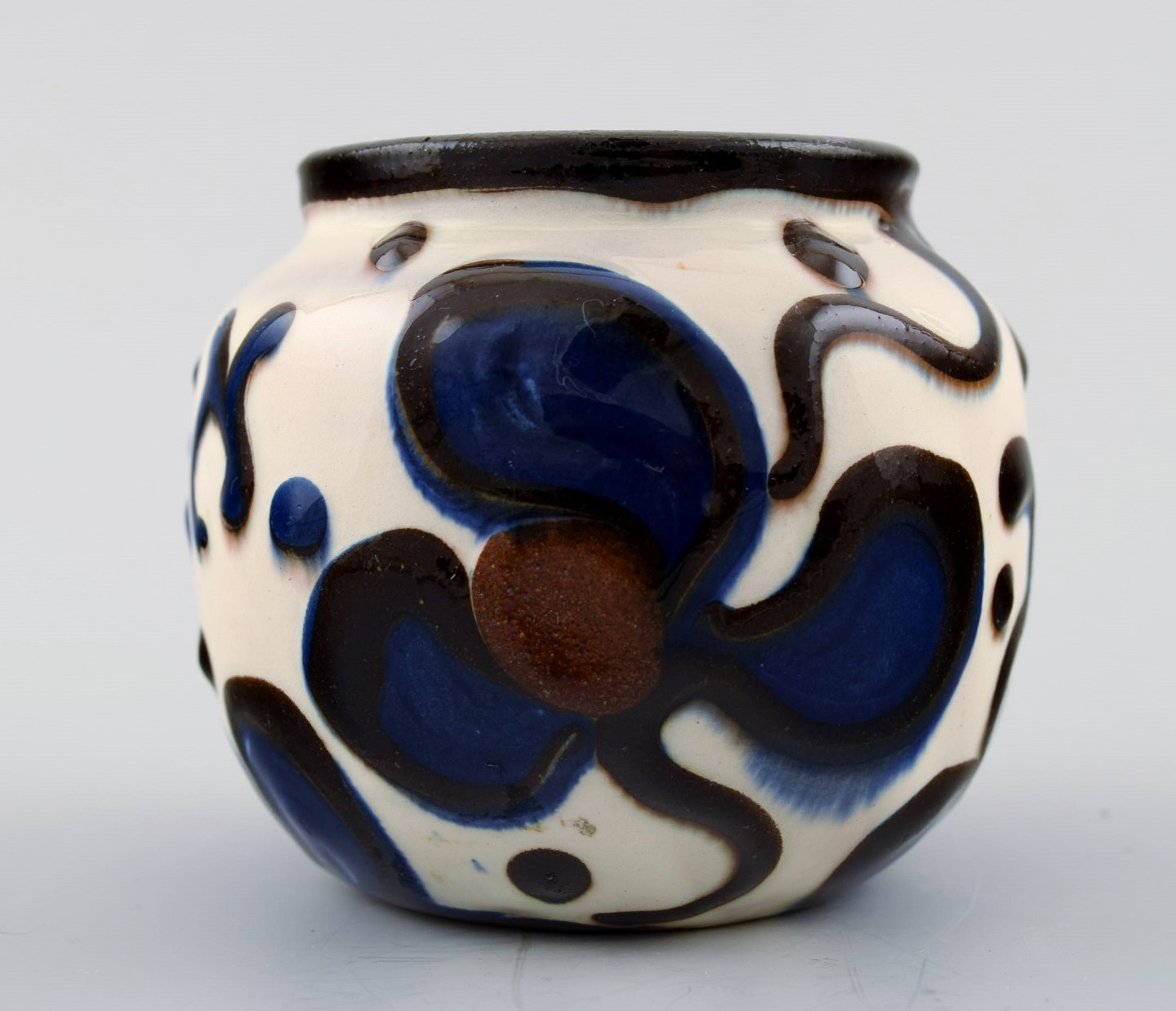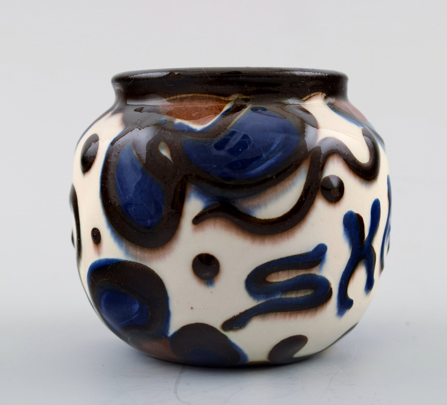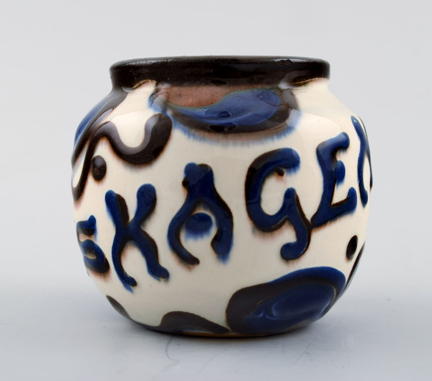 Kähler, HAK, glaseret stentøjsvase. 1940´erne. Kohorn glasur. Stemplet. Med tekst Skagen. Måler : 7,5 cm. x 6,5 cm. I perfekt stand.