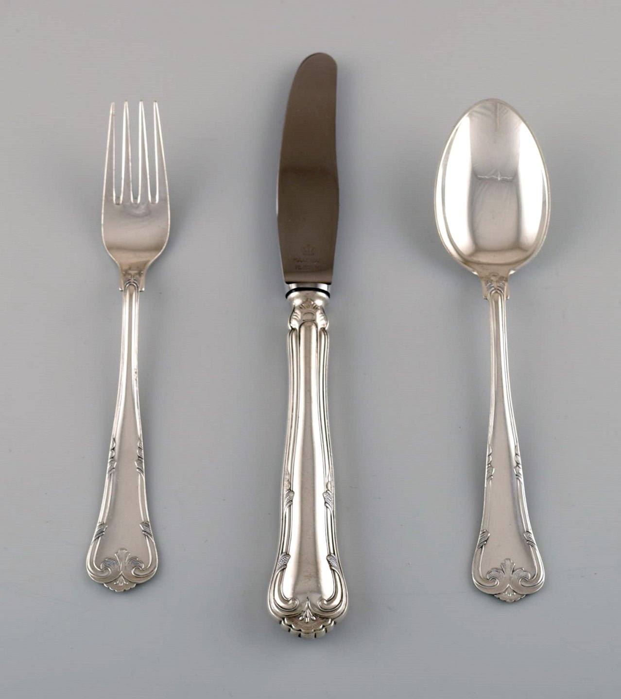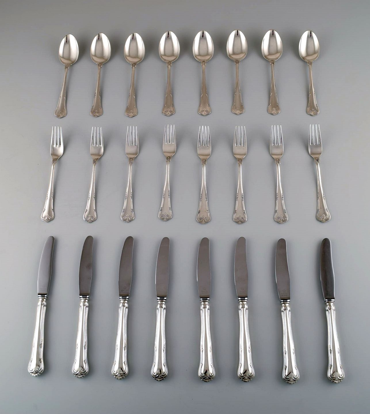 C.M. Cohr. 8 personers komplet 'Saksisk Blomst' middagsbestik af sølv bestående af : 8 middagsknive, 8 middagsgafler, 8 spiseskeer. Stemplet. Måler : kniv 22,5 cm. I flot stand.