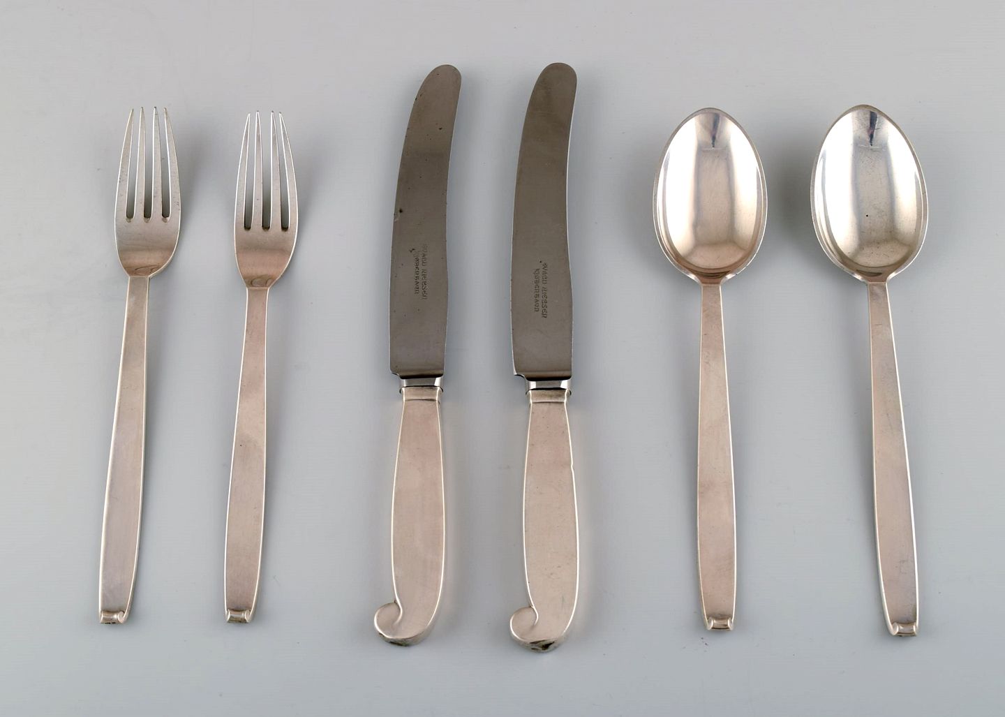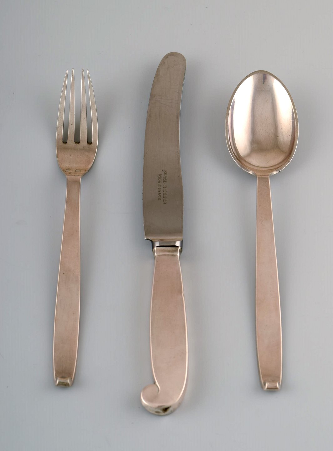 Evald Nielsen nr. 29, komplet middagsservice til to, tretårnet sølv. Måler : kniv 24,2 cm. Stemplet. I perfekt stand.