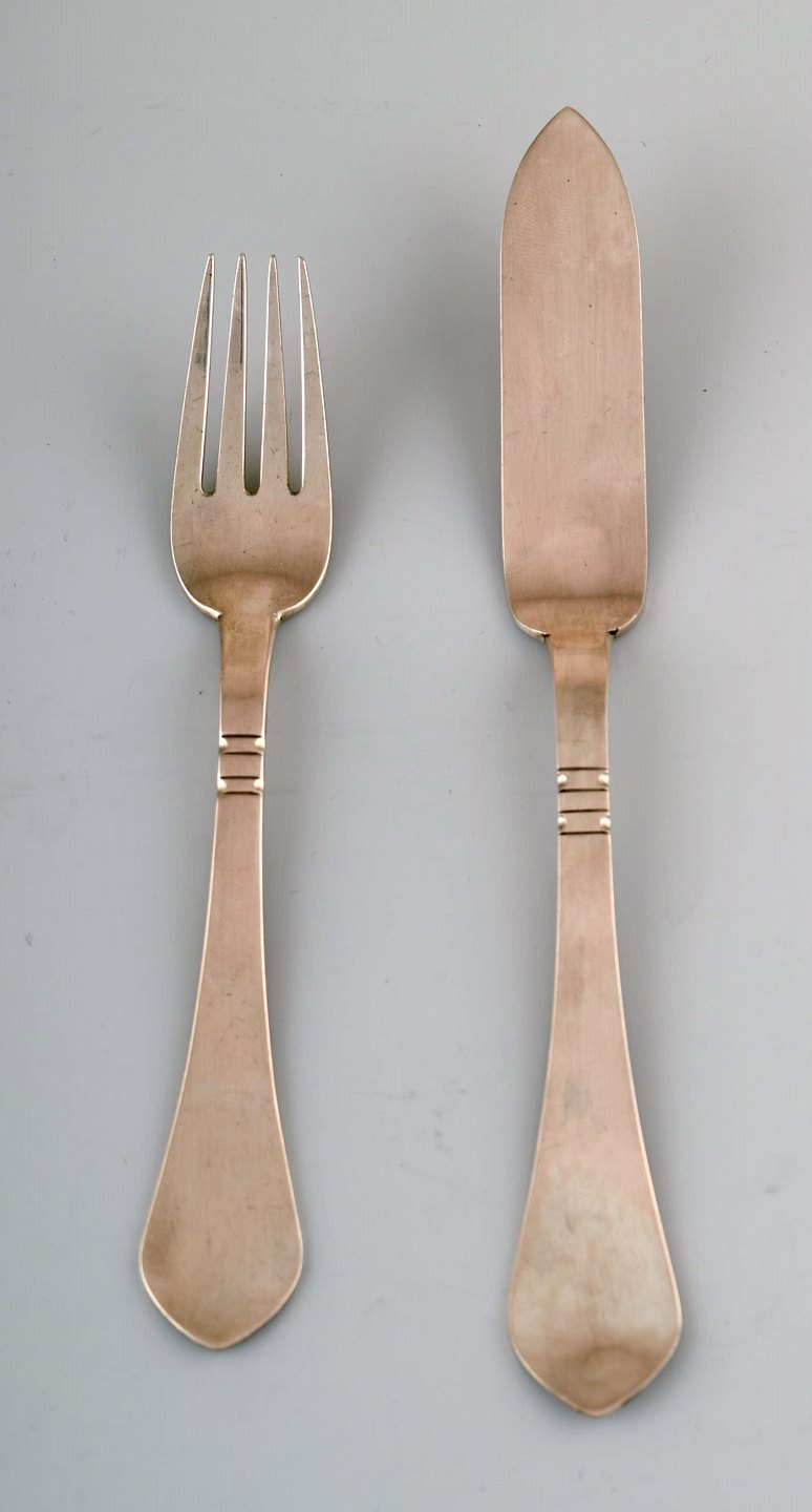 I. Eleonora Møller - Copenhagen (1915 - 1973) Complete 12 persons fish service, 1930s. Silver (83%). Stamped. Measures: knife 20.5 cm.
