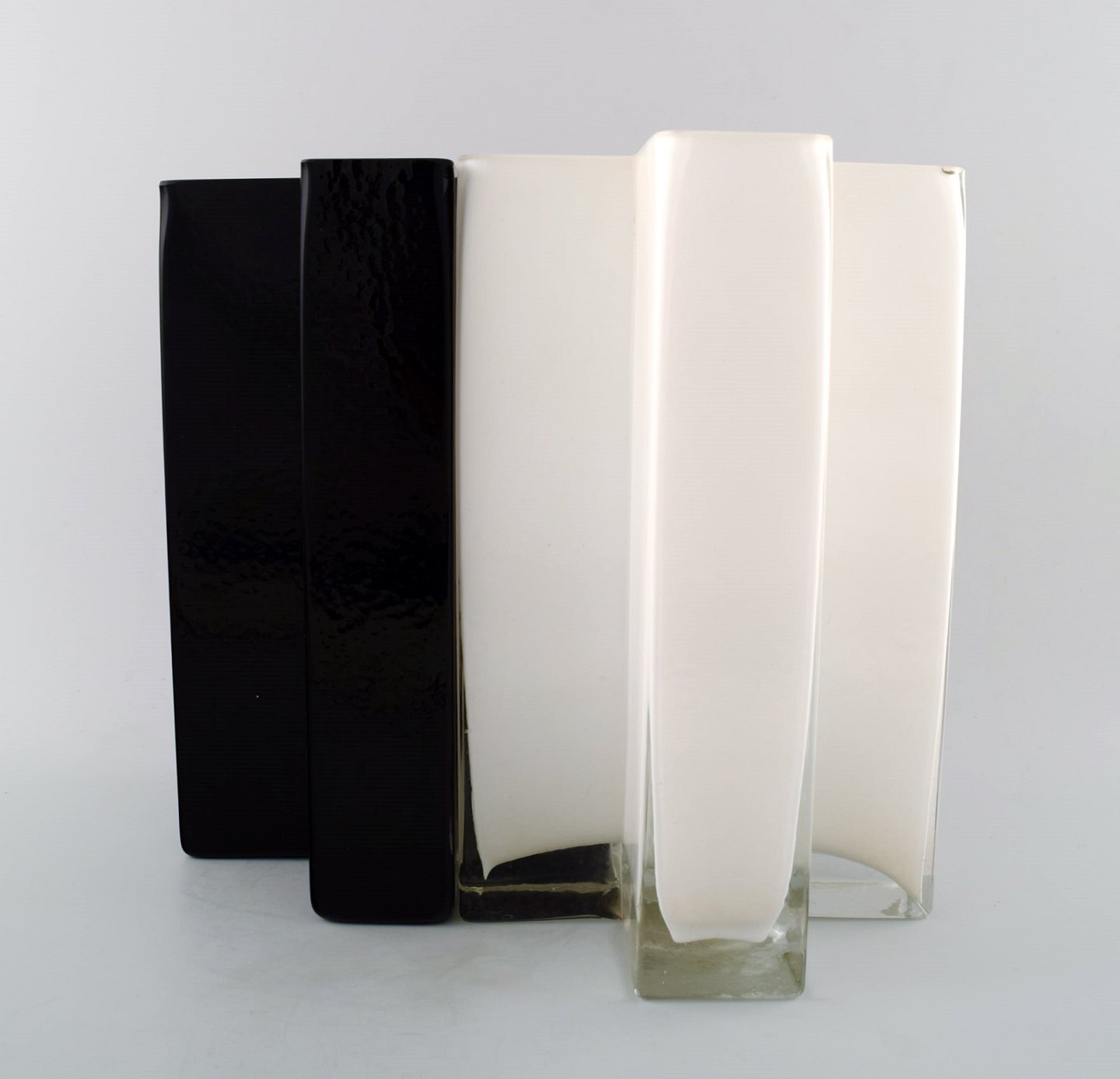 Bodil Kjær. 'Cross' vases of white and black art glass. Produced by Gullaskruf Sweden for Torben Ørskov & Form & Color. 1960s. Measures: 21.5 cm. x 14 cm.