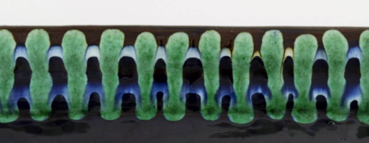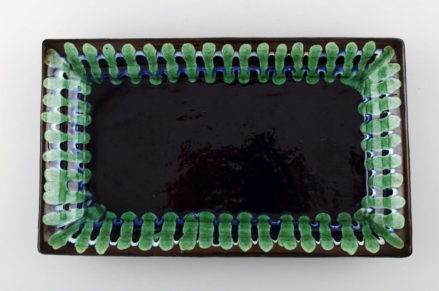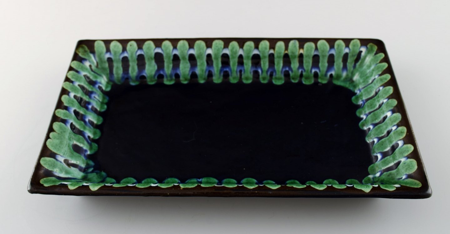 Kähler, Denmark, glazed stoneware tray, 1940 / 50s. Beautiful glaze. Measures 28 cm. x 16 cm. 4 cm. high. Stamped. In perfect condition.